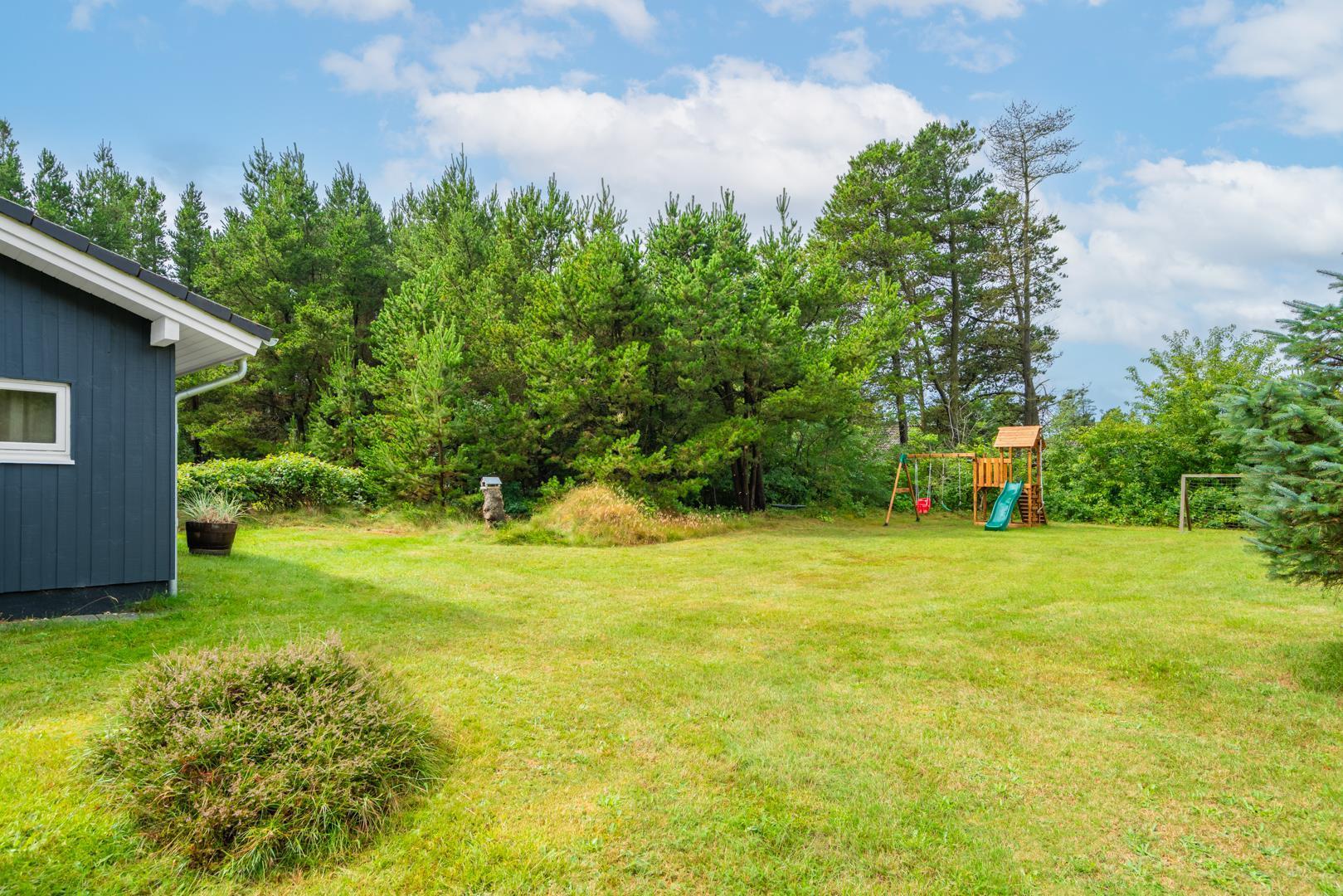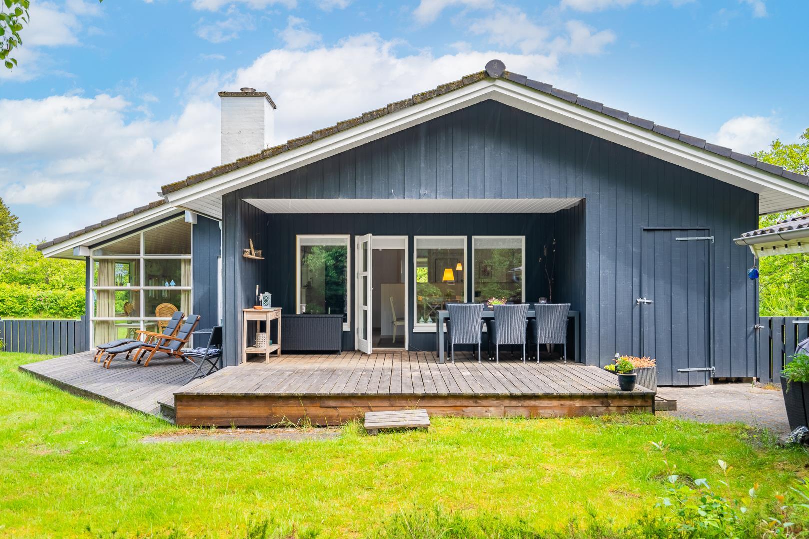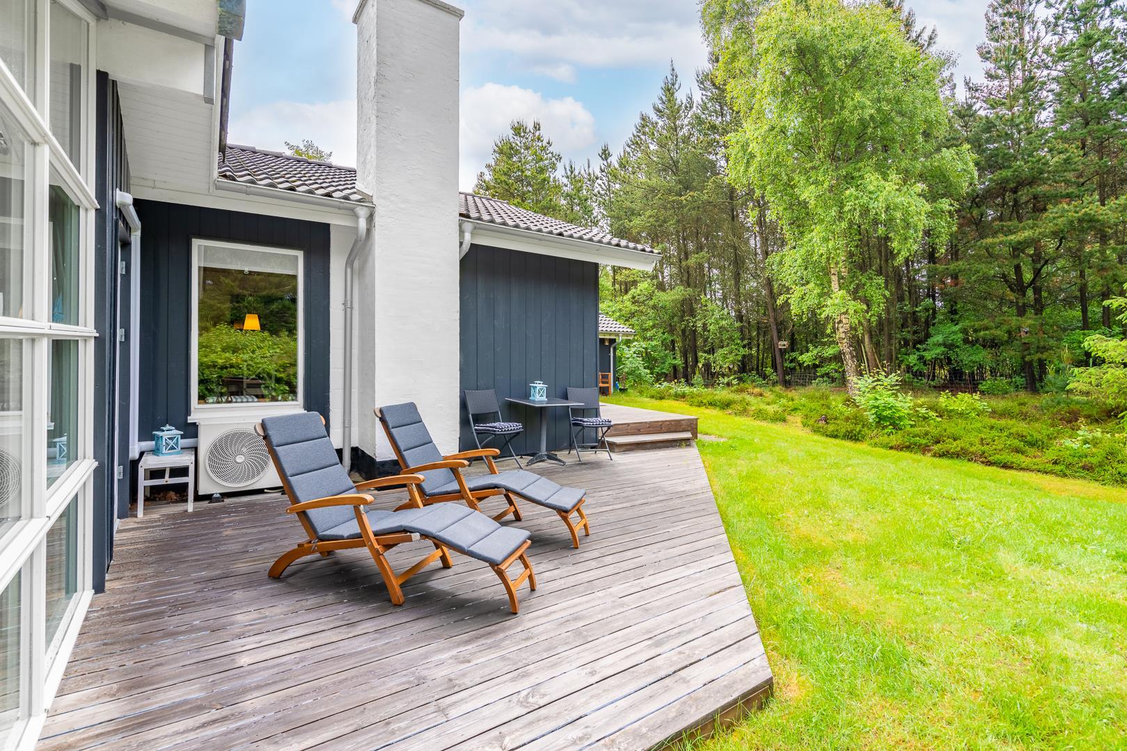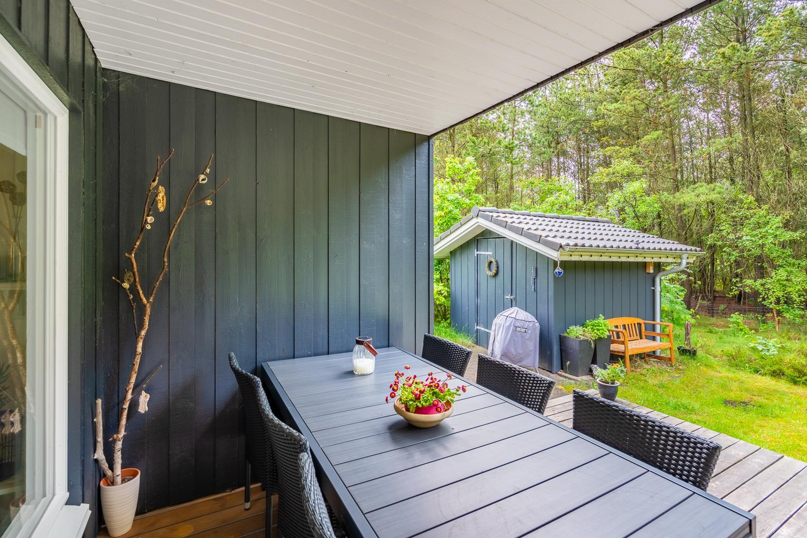 Udenfor finder I en sikker, indhegnet have, hvor børn og hund trygt kan lege. På den overdækkede terrasse er der mulighed for at nyde frokost eller bare slappe af med en kop kaffe. En gynge i haven sørger for børnenes underholdning.