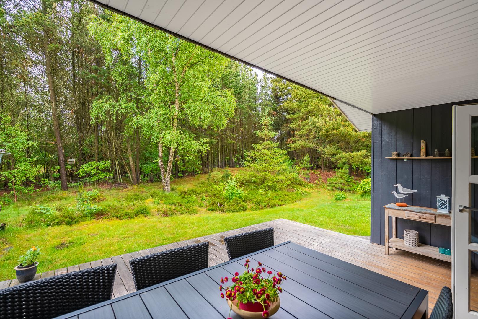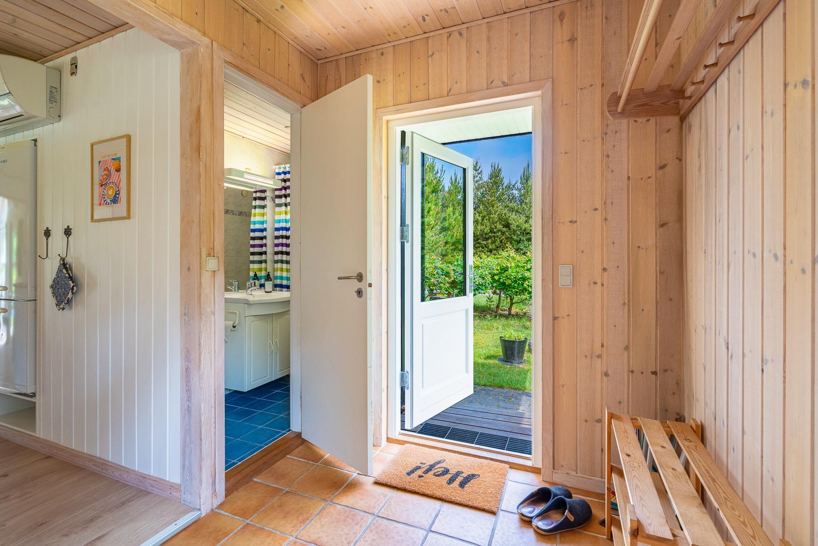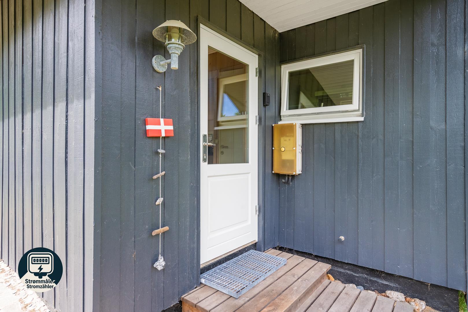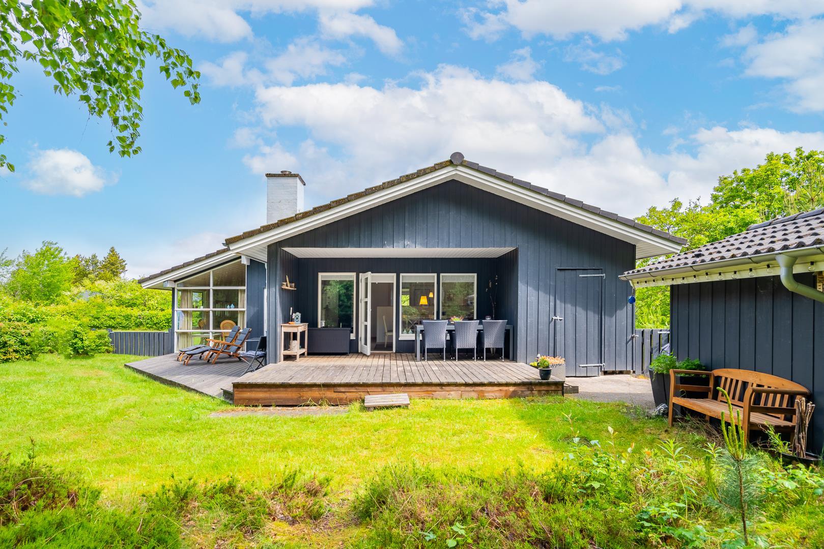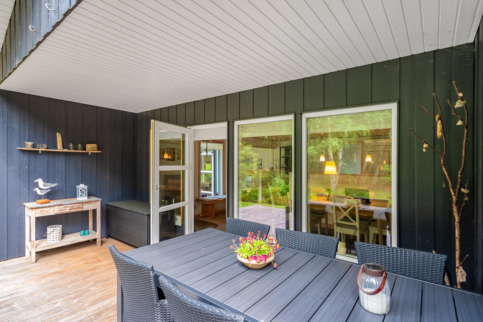 Udenfor finder I en sikker, indhegnet have, hvor børn og hund trygt kan lege. På den overdækkede terrasse er der mulighed for at nyde frokost eller bare slappe af med en kop kaffe. En gynge i haven sørger for børnenes underholdning.