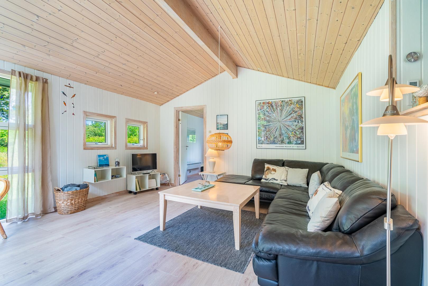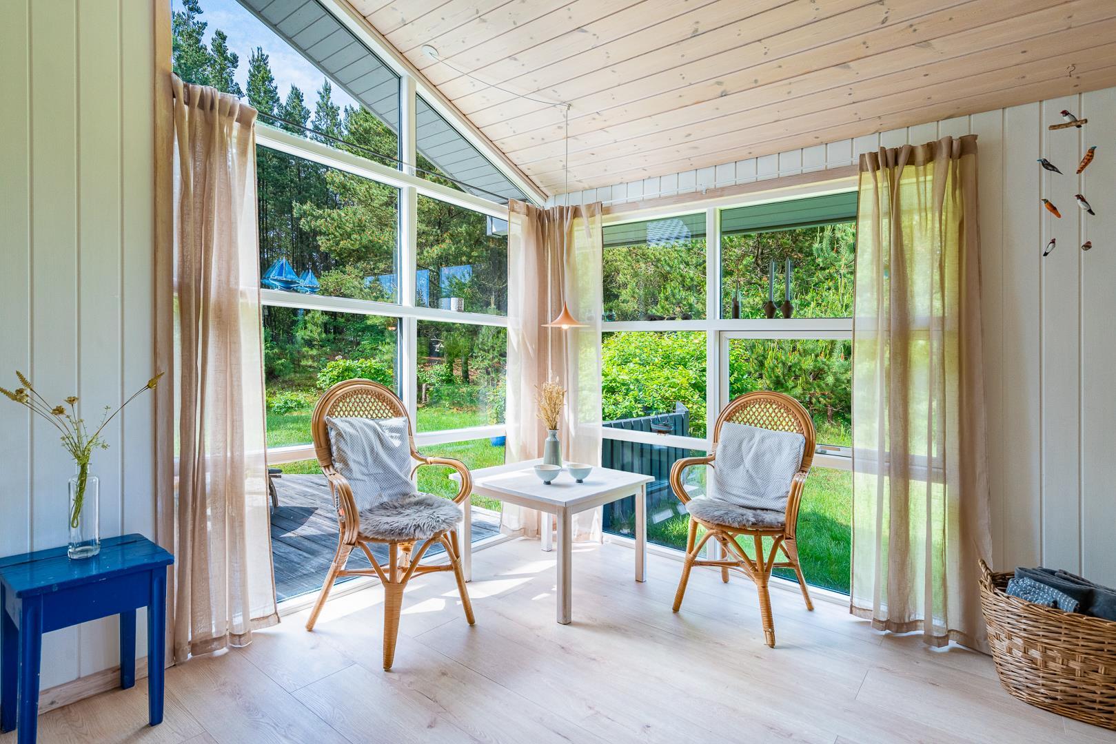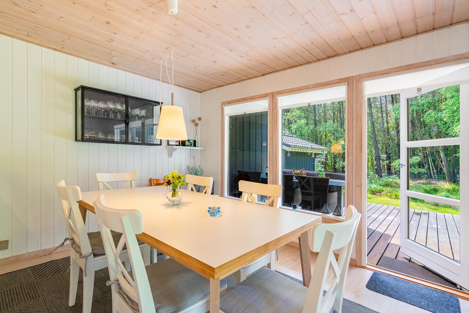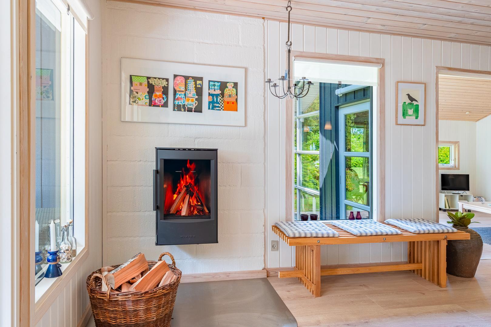 Stuen har store vinduespartier, som giver et lyst og åbent rum med masser af dagslys. På køligere aftener giver brændeovnen varme og stemning, mens en moderne varmepumpe sørger for komfort hele året.