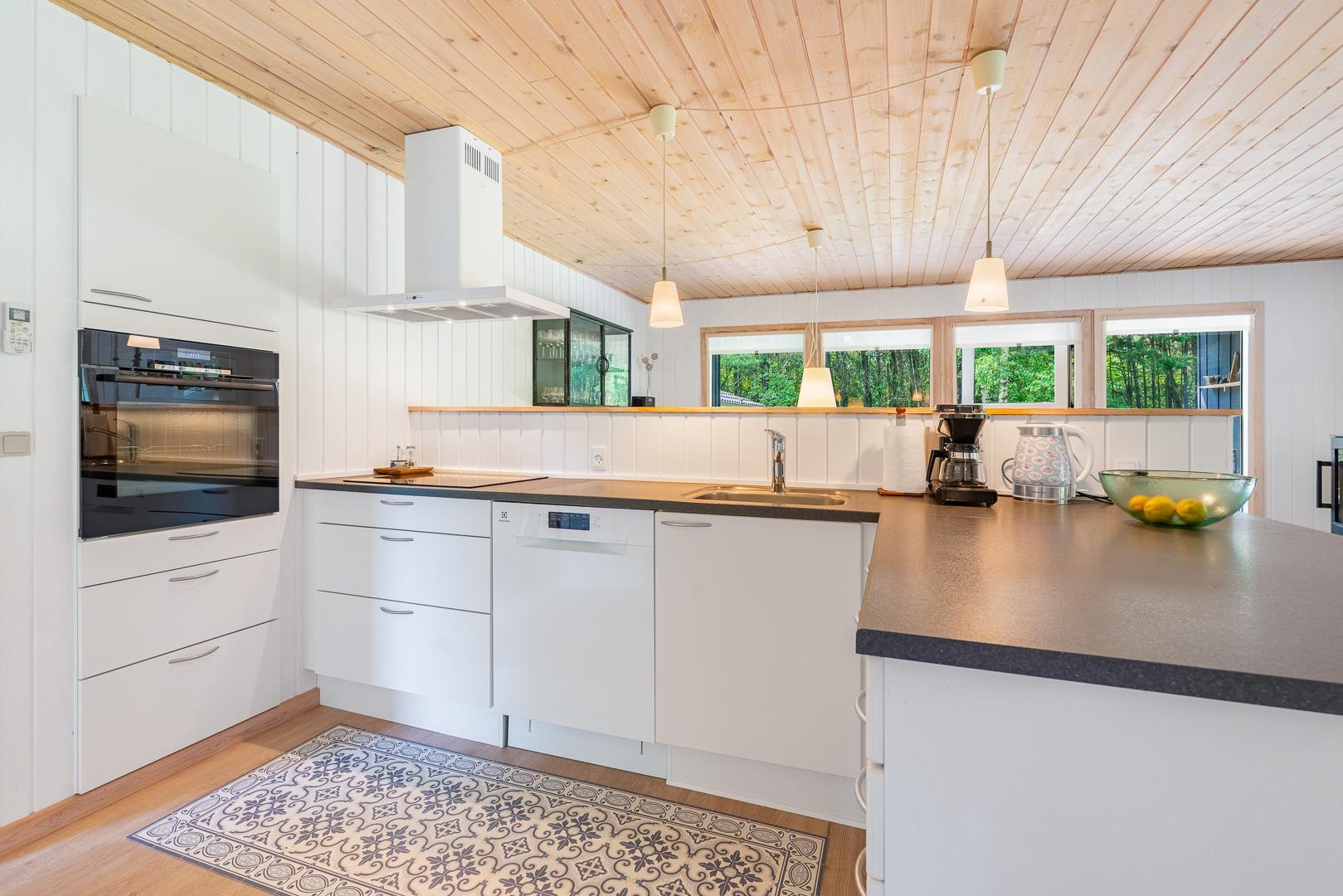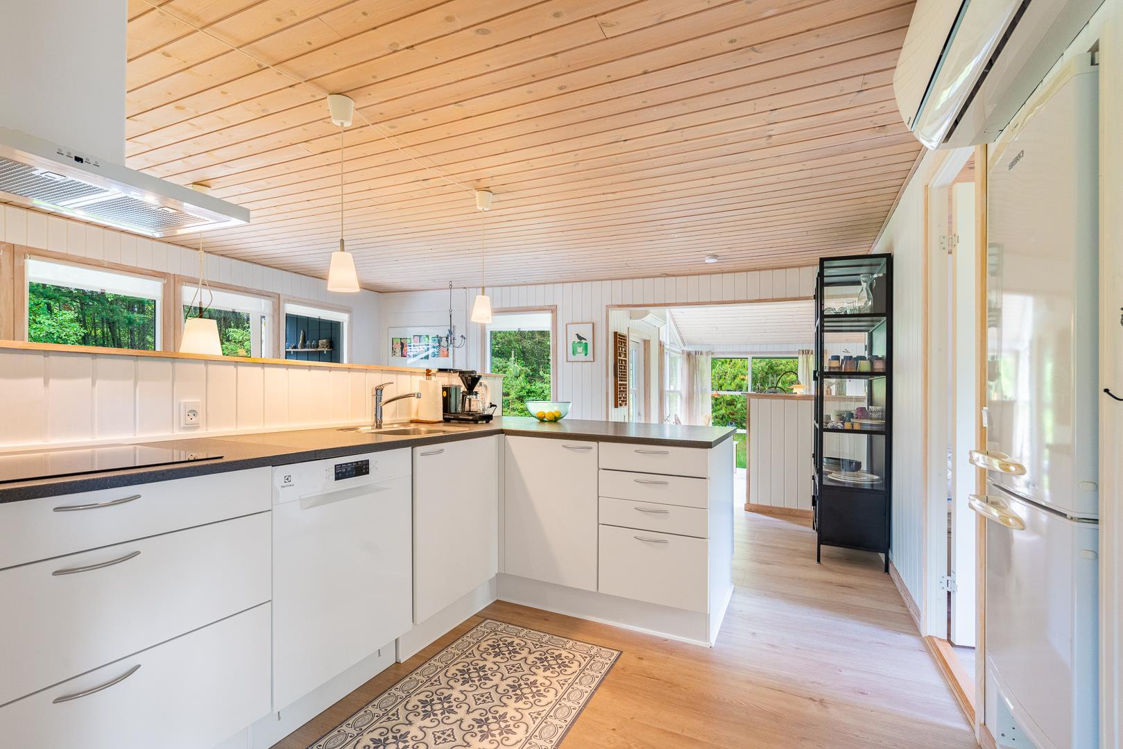 Det åbne køkken rummer alt, hvad I har brug for – inkl. opvaskemaskine – så det er nemt at nyde måltiderne sammen uden besvær bagefter.