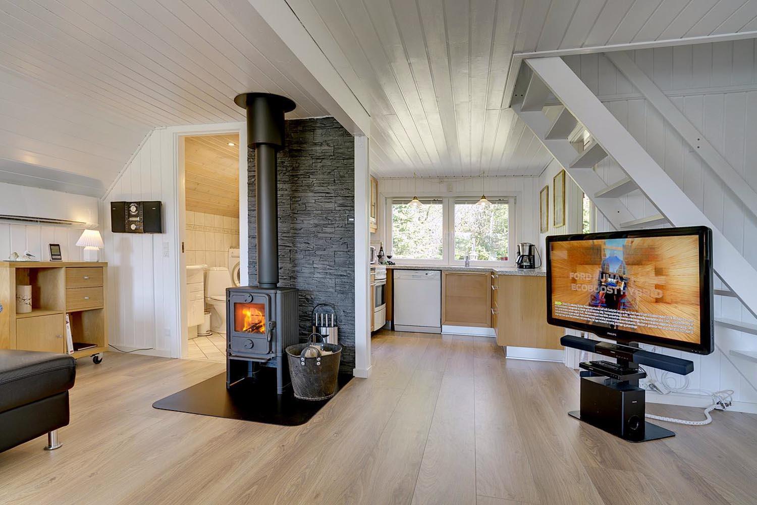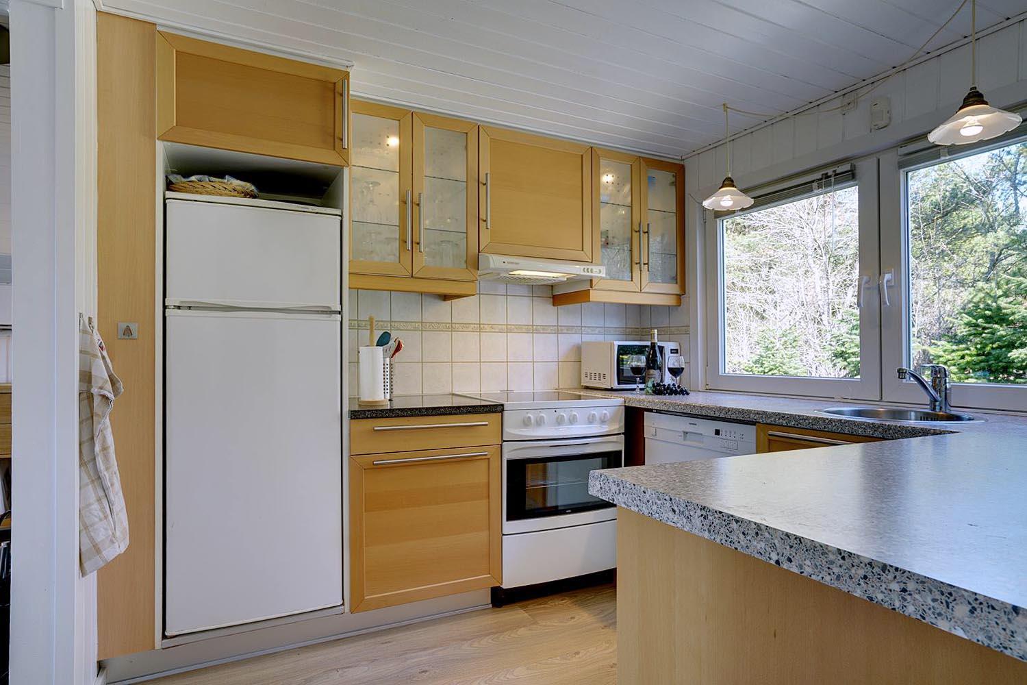 Køkkenet ligger i åben forbindelse med den hyggelig og pænt møblerede stue.