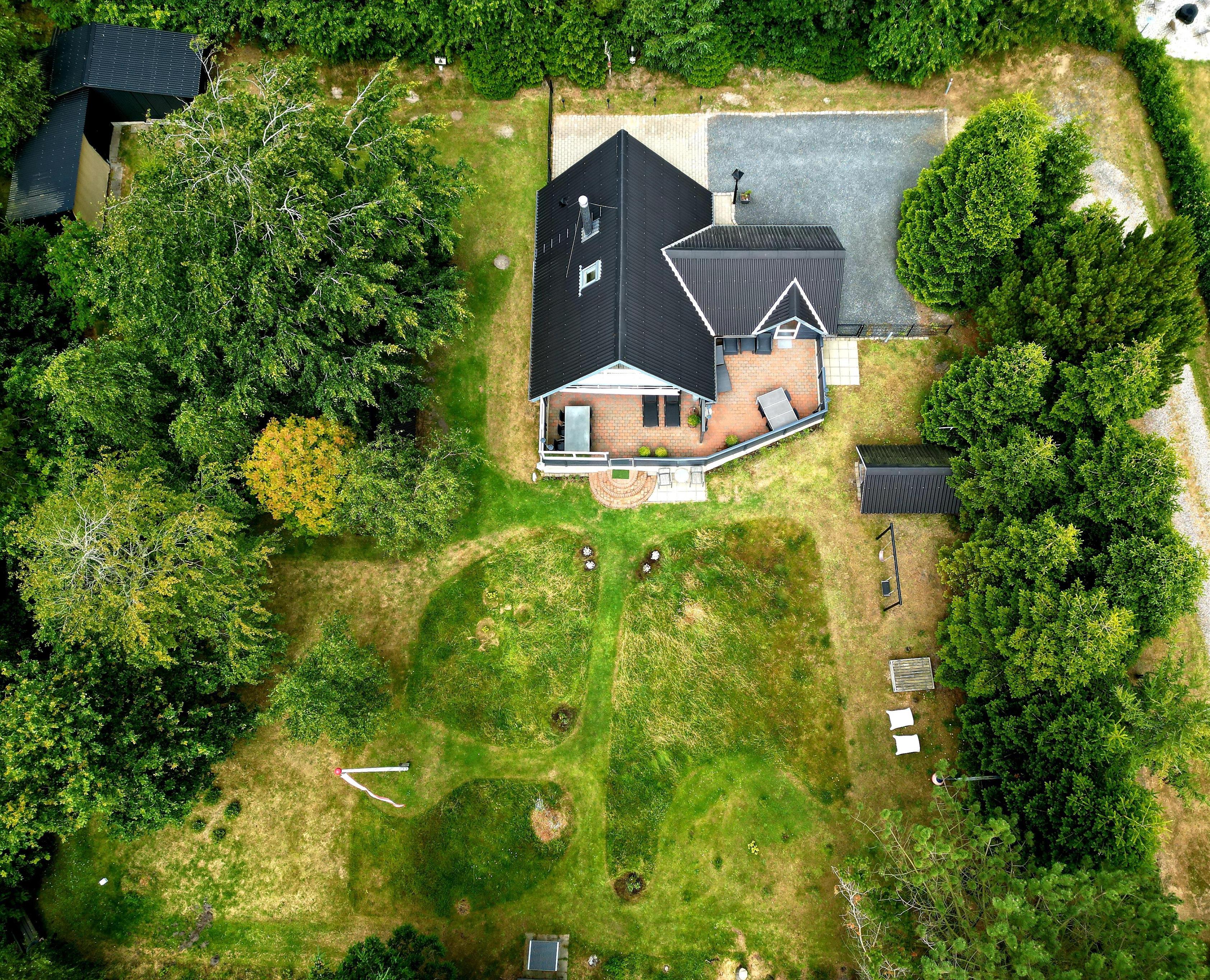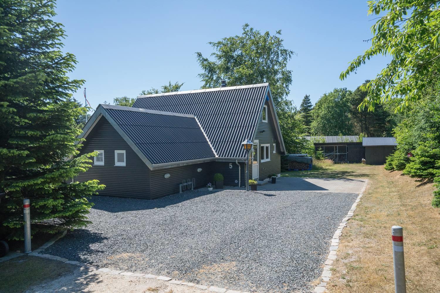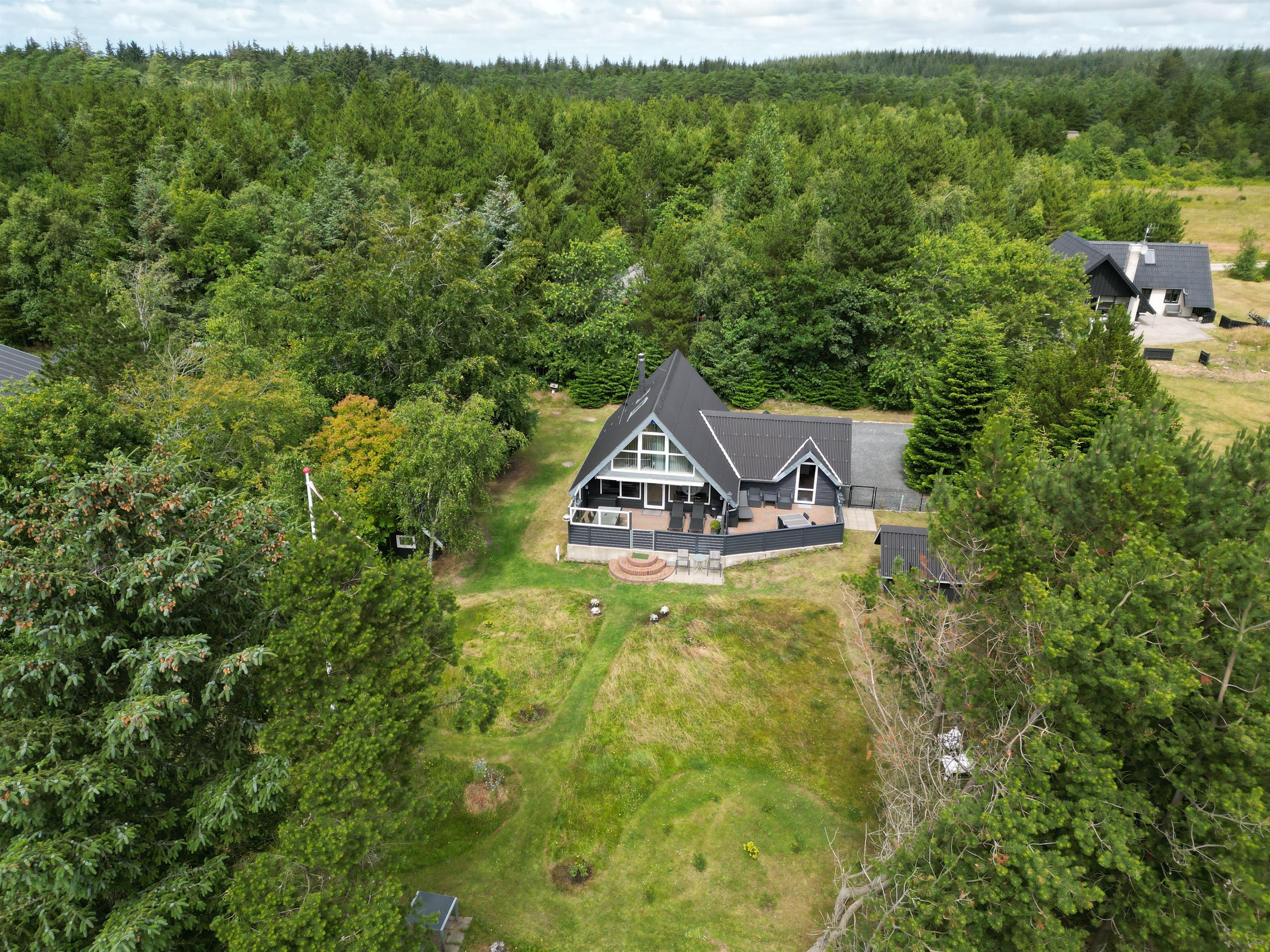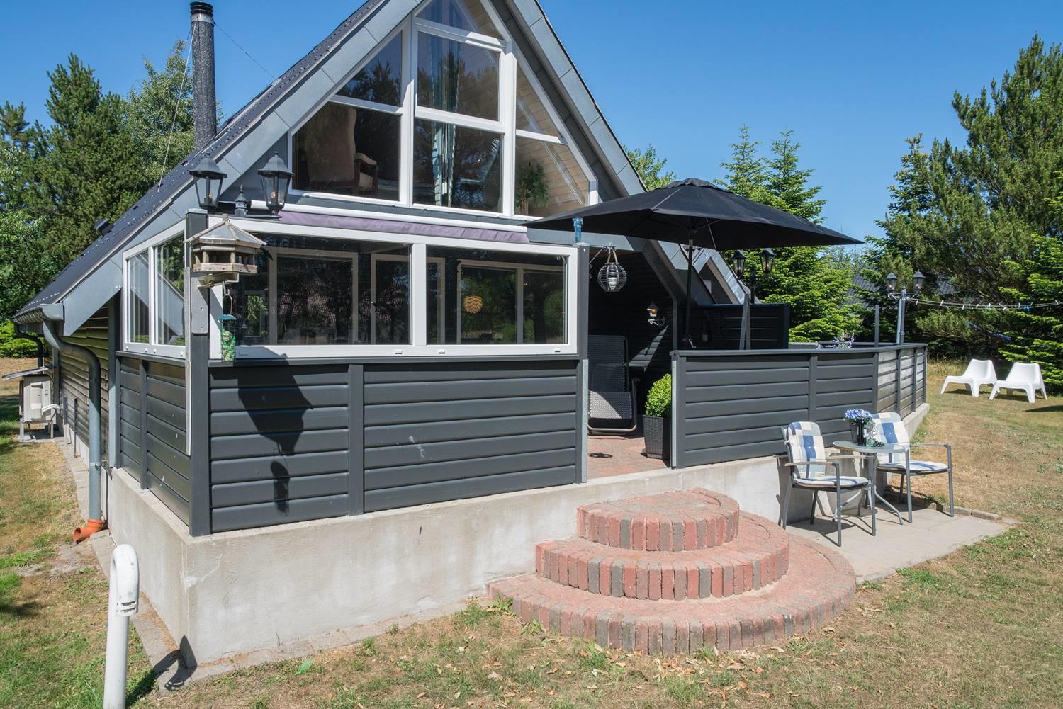 På en skøn sydvendt børnevenlig naturgrund i rolige omgivelser for enden af blind vej tæt ved Blåbjerg Plantage og golfklub, ligger dette velpassede feriehus.