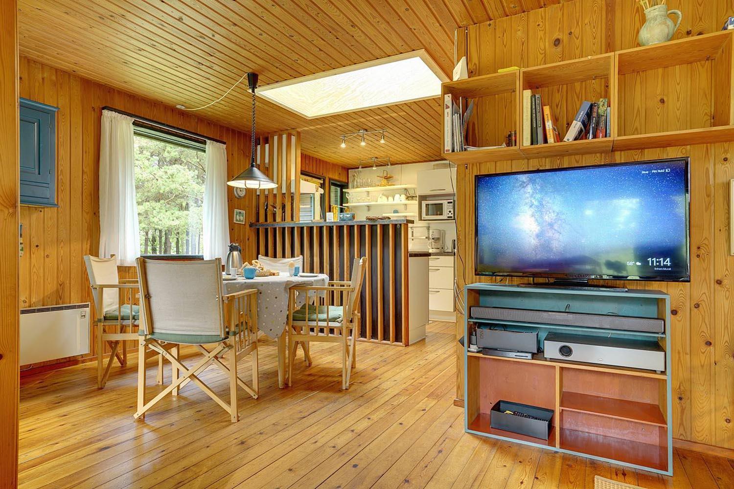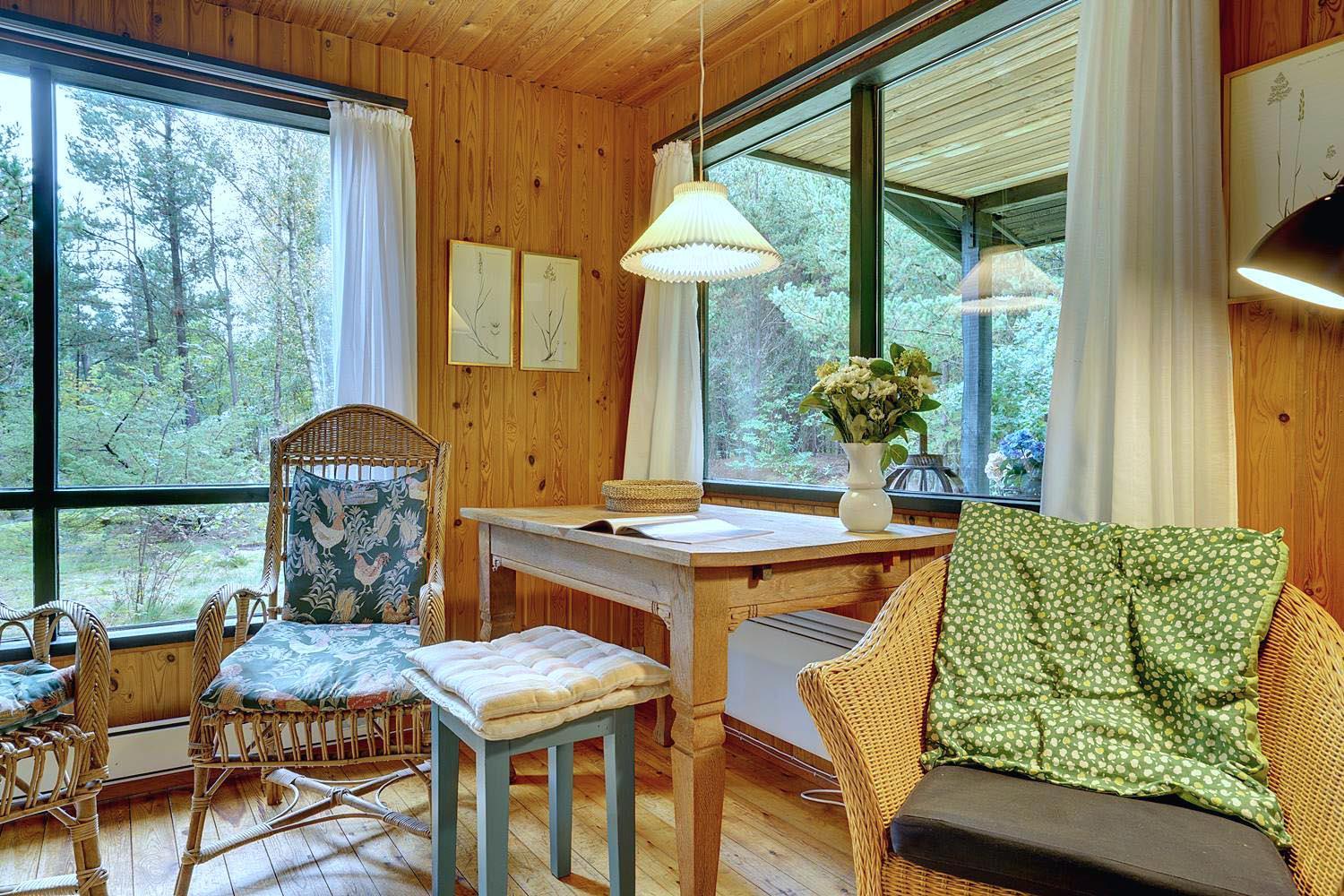 Ældre velholdt og hyggeligt feriehus, lyst og venligt indrettet køkken, beliggende på en stor skovgrund tæt ved Blåbjerg Plantage og golfbane. Grunden er bevokset med træer, hvilket gør, at huset ligger total ugeneret på grunden. Mindre overdækket træ-terrasse samt carport og anneks med 1 ekstra soveplads. Trægulve overalt i huset.