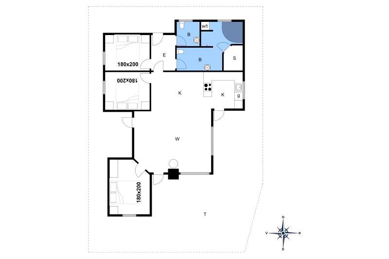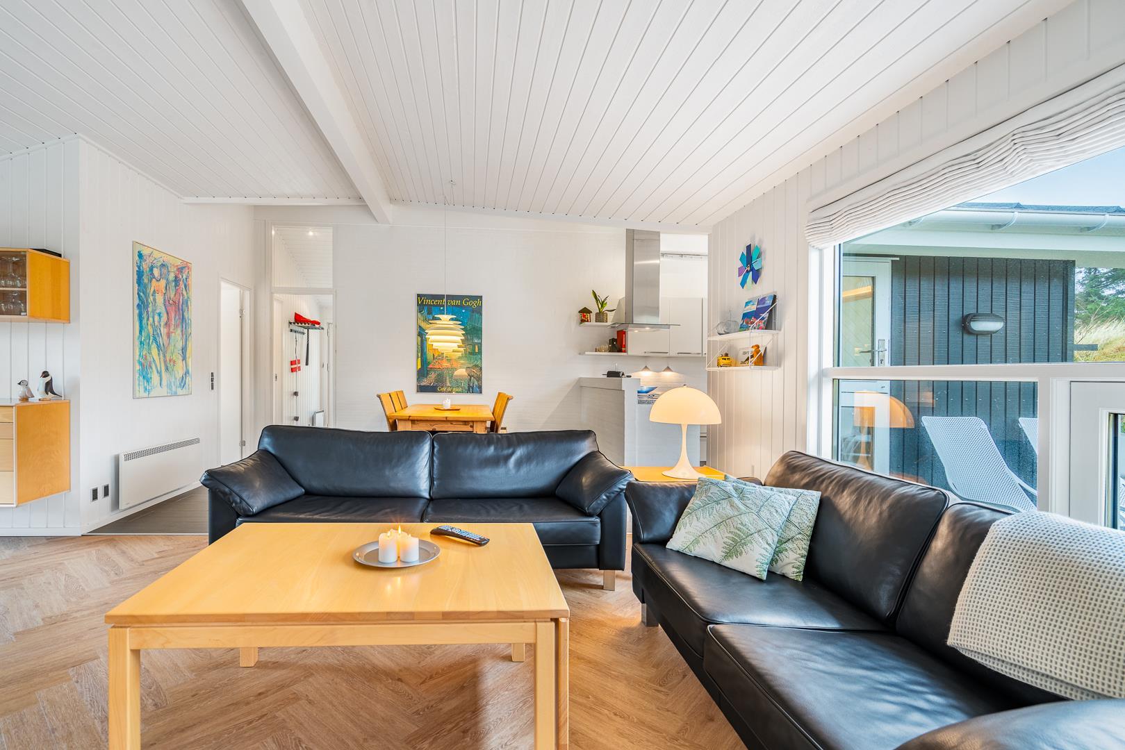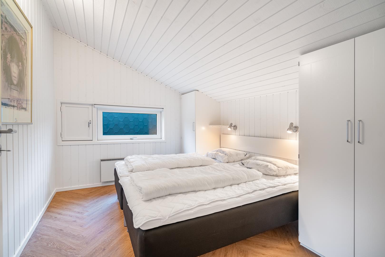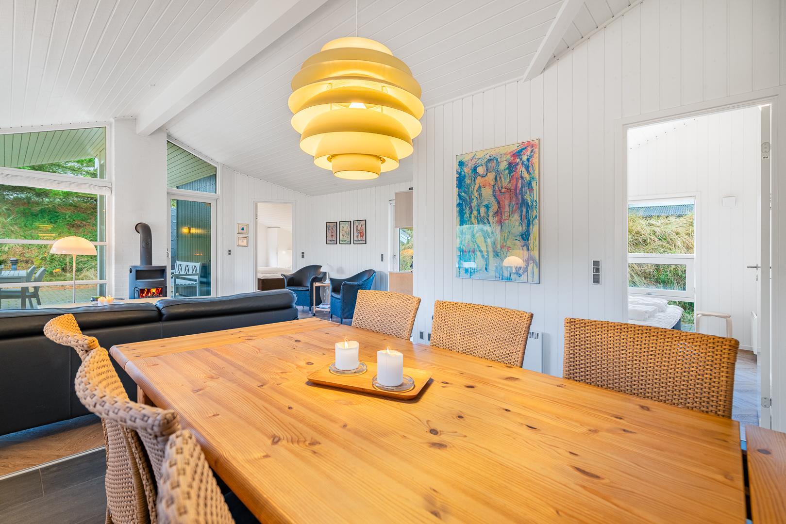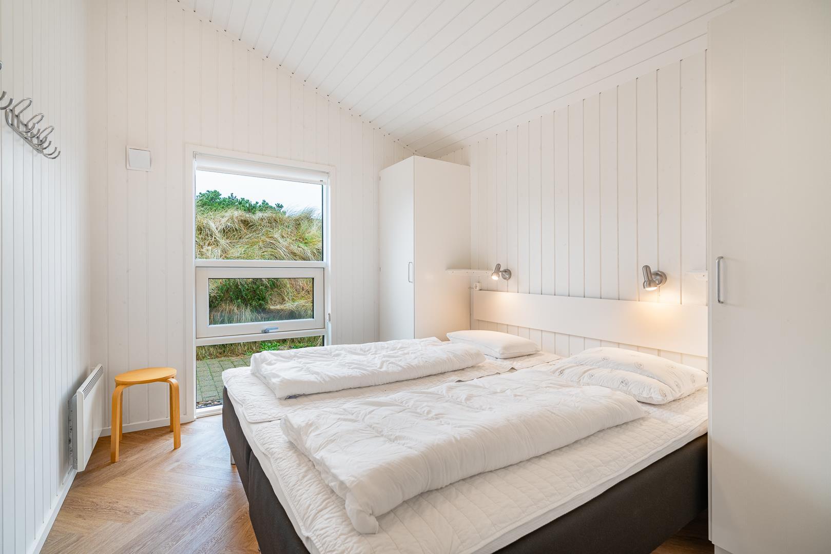Dette skønne sommerhus har plads til 6 personer fordelt på 3 fine og velindrettede dobbeltværelser med faste skabe. Her er alt lyst og moderne indrettet – køkkenet er kombineret med stuen, så alle kan være sammen uanset om sidder ved brændeovnen, ser TV (danske og tyske kanaler), bruger husets gratis internet eller laver mad i køkkenet. Der er et meget stort lækkert badeværelse med bruseniche, vaskemaskine og tørretumbler - her har I jeres egen wellnessafdeling med sauna og badekar. Desuden er der et ekstra gæstetoilet.