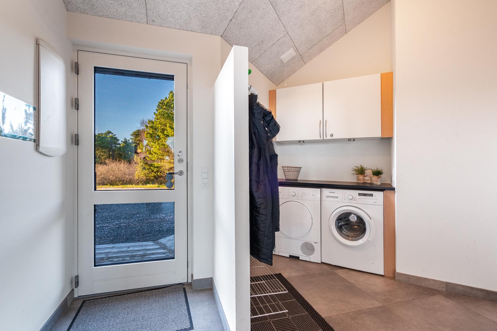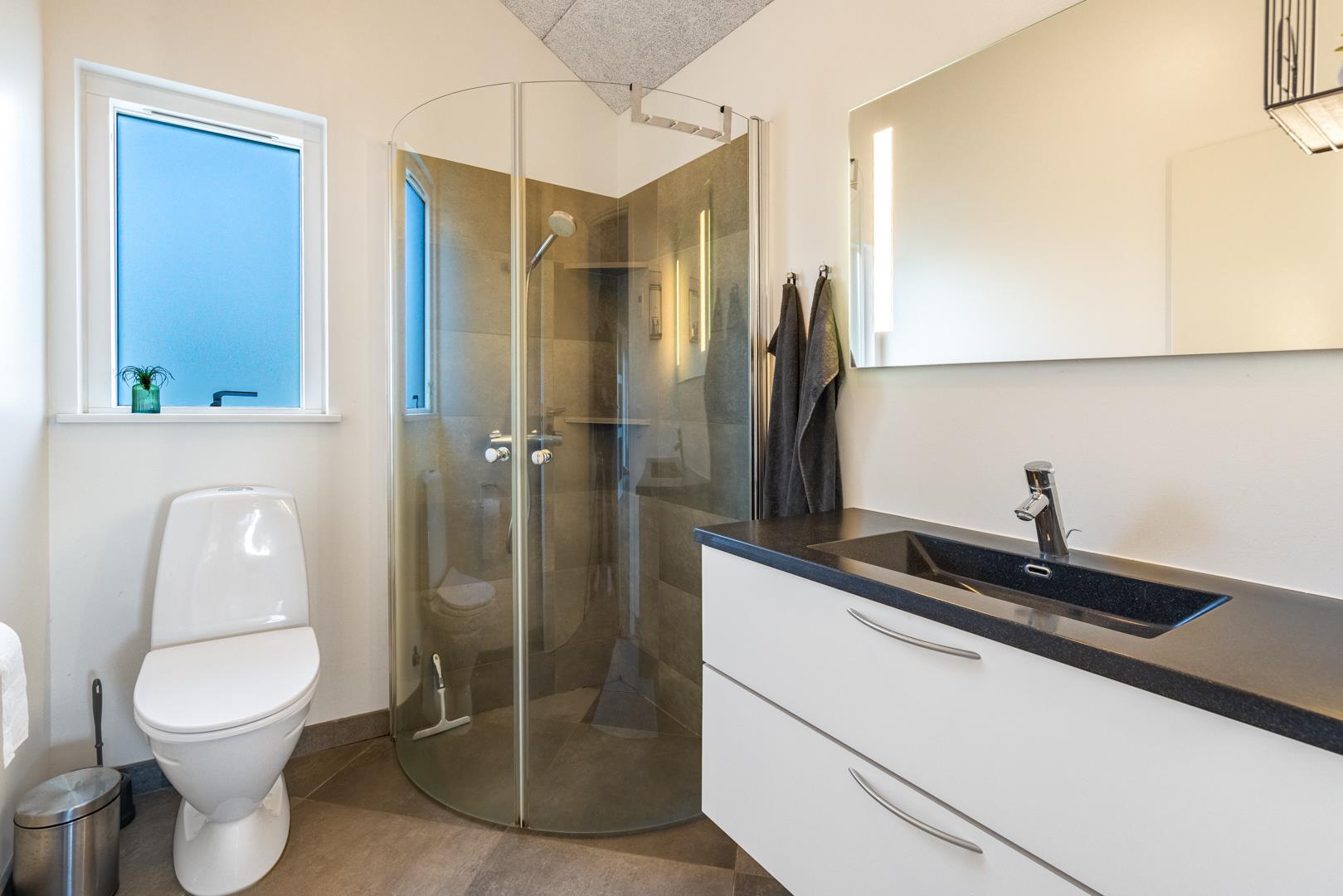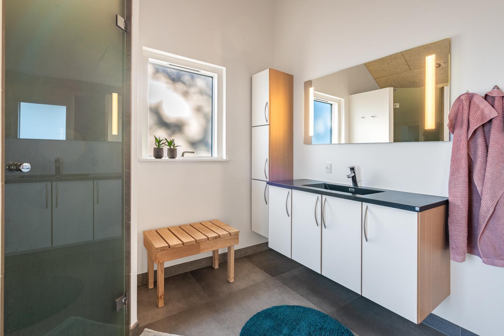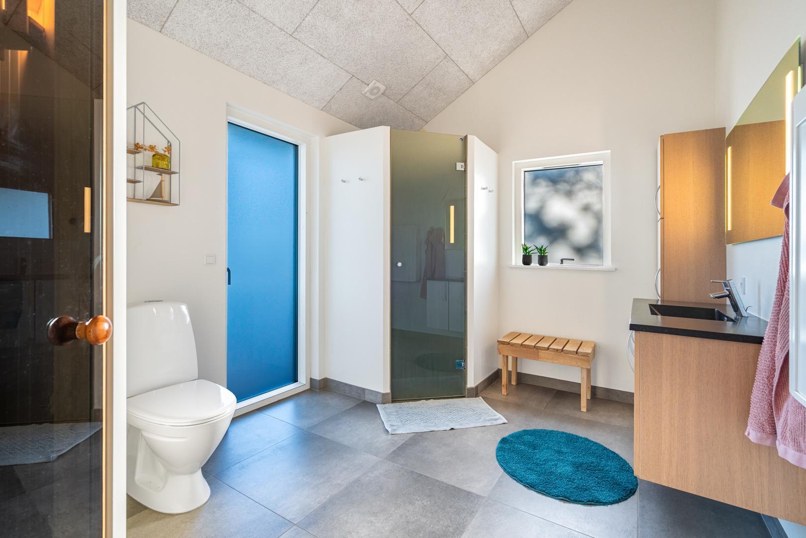 Huset har to moderne badeværelser med gulvvarme, hvoraf det ene byder på sauna og babybadekar. Til de mindste gæster er der også pusleplads. Vandforbruget er inkluderet i lejen – en ekstra bonus, der gør ferien endnu mere bekymringsfri.