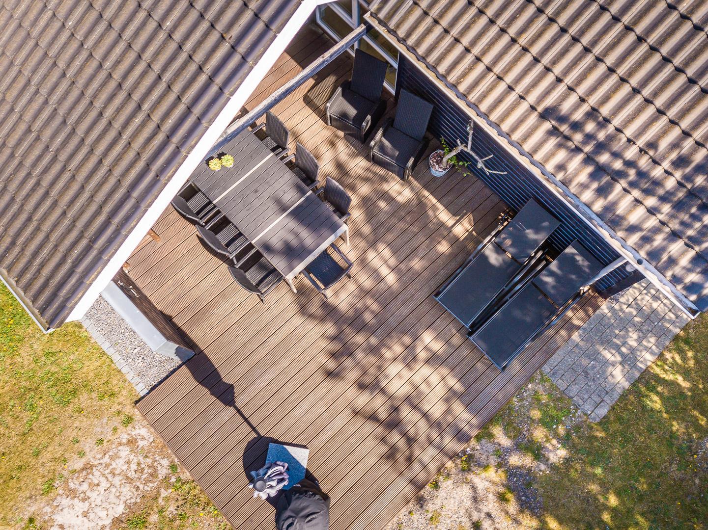 Fra træterrasserne kan du gå videre ud i selve haven. Den er omkranset af smukt opvokset beplantning med træer og buske, så der er masser af gode kroge, hvor I kan nyde det danske sommervejr ganske ugeneret. Haven byder på masser af fodboldvenligt græs, trampolin.