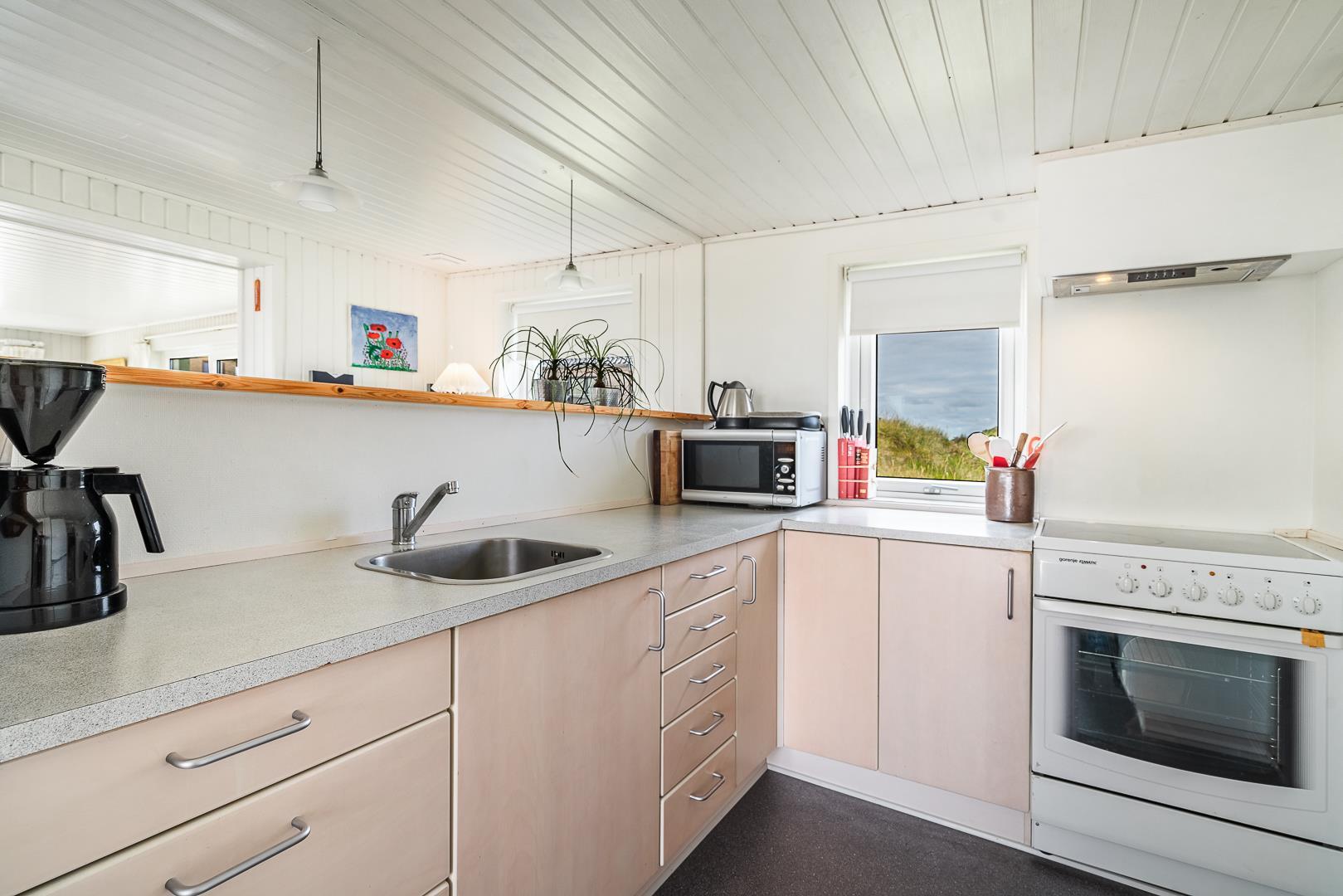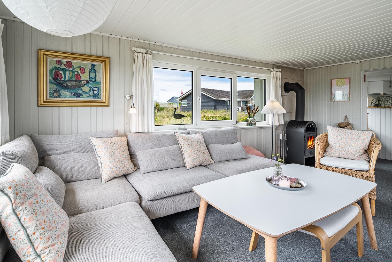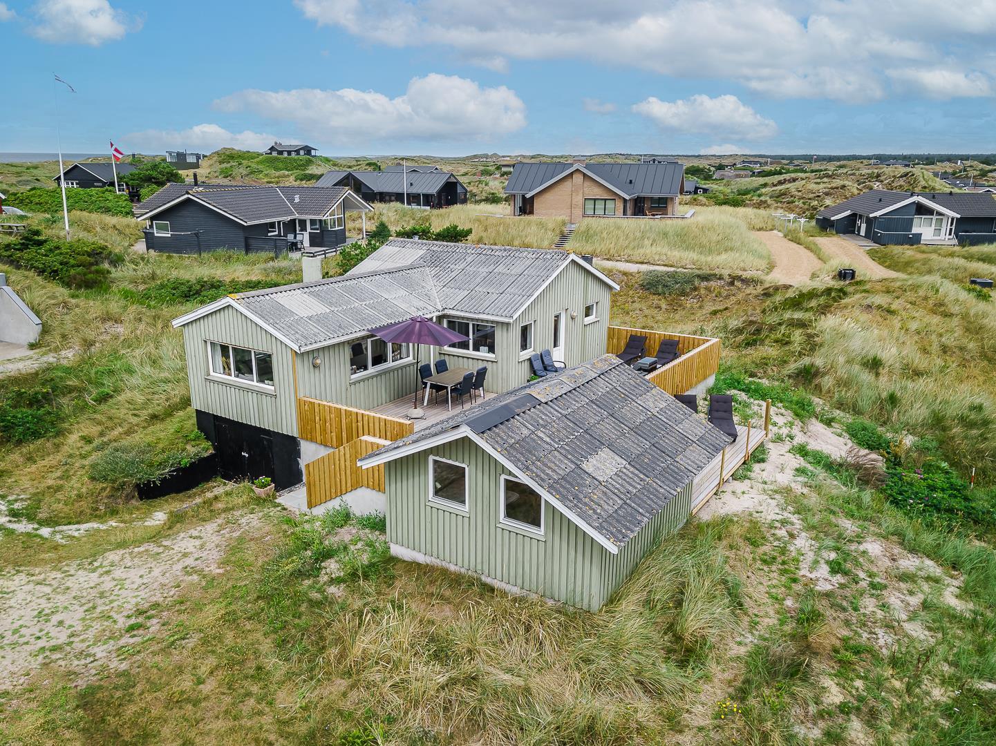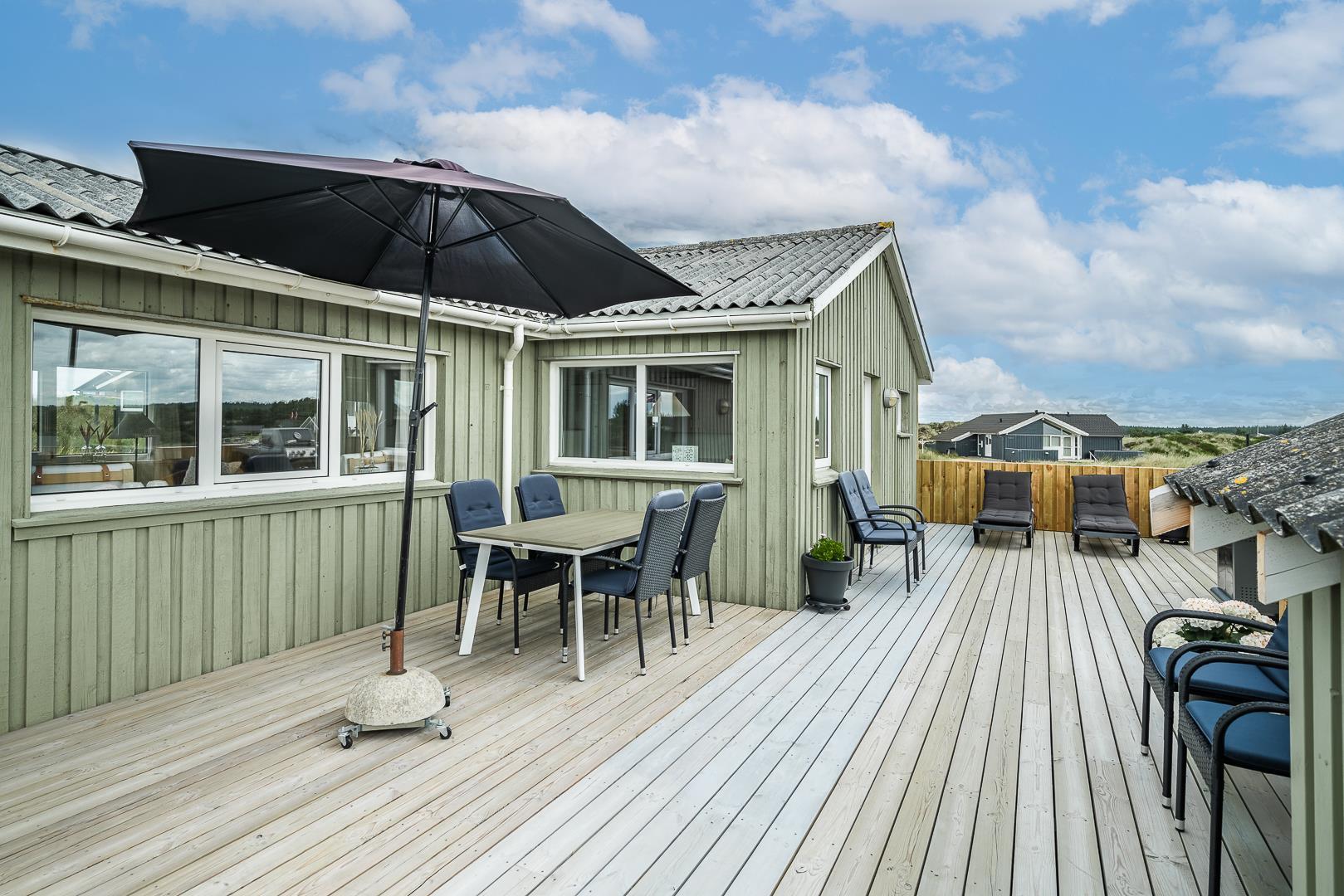 På en pragtfuld klitgrund tæt ved vandet og med udsigt over heden samt Blåbjerg Plantage, ligger dette dejlige og hyggelige feriehus. Kombineret køkken-og spiseafdeling med brændeovn. Fra feriehusets terrasser er der en flot udsigt over området og heden. Soverummene er små.