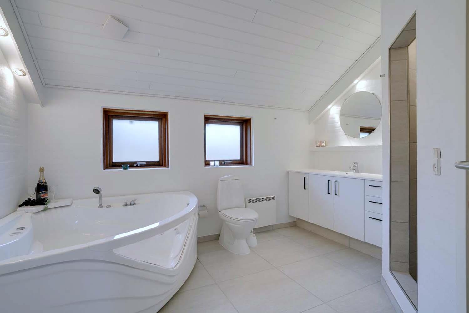 Feriehuset har fire gode soveværelser, alle udstyret med komfortable boxmadrasser, der sikrer en god nattesøvn. De to flotte badeværelser med bruser giver ekstra komfort, og i det store badeværelse finder du også en spa og sauna, hvor du kan forkæle dig selv efter en dag i den friske luft.