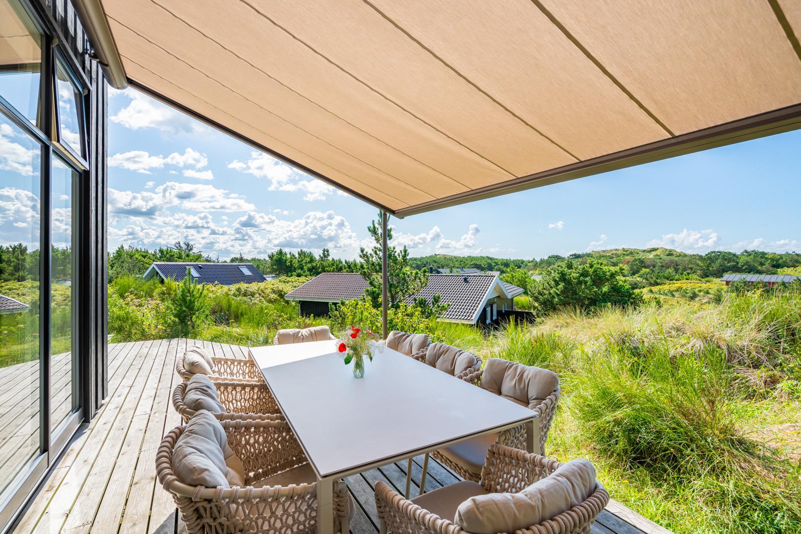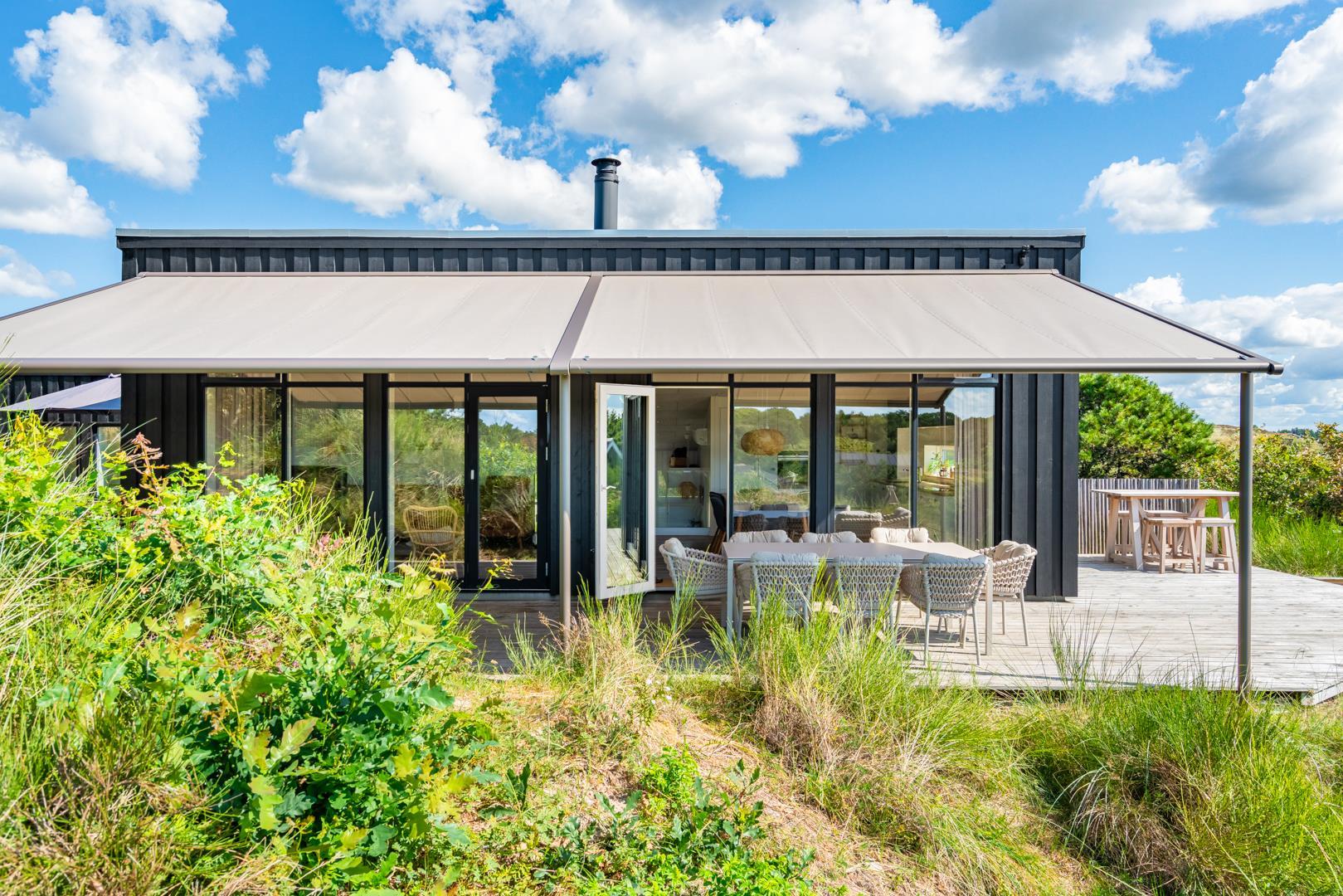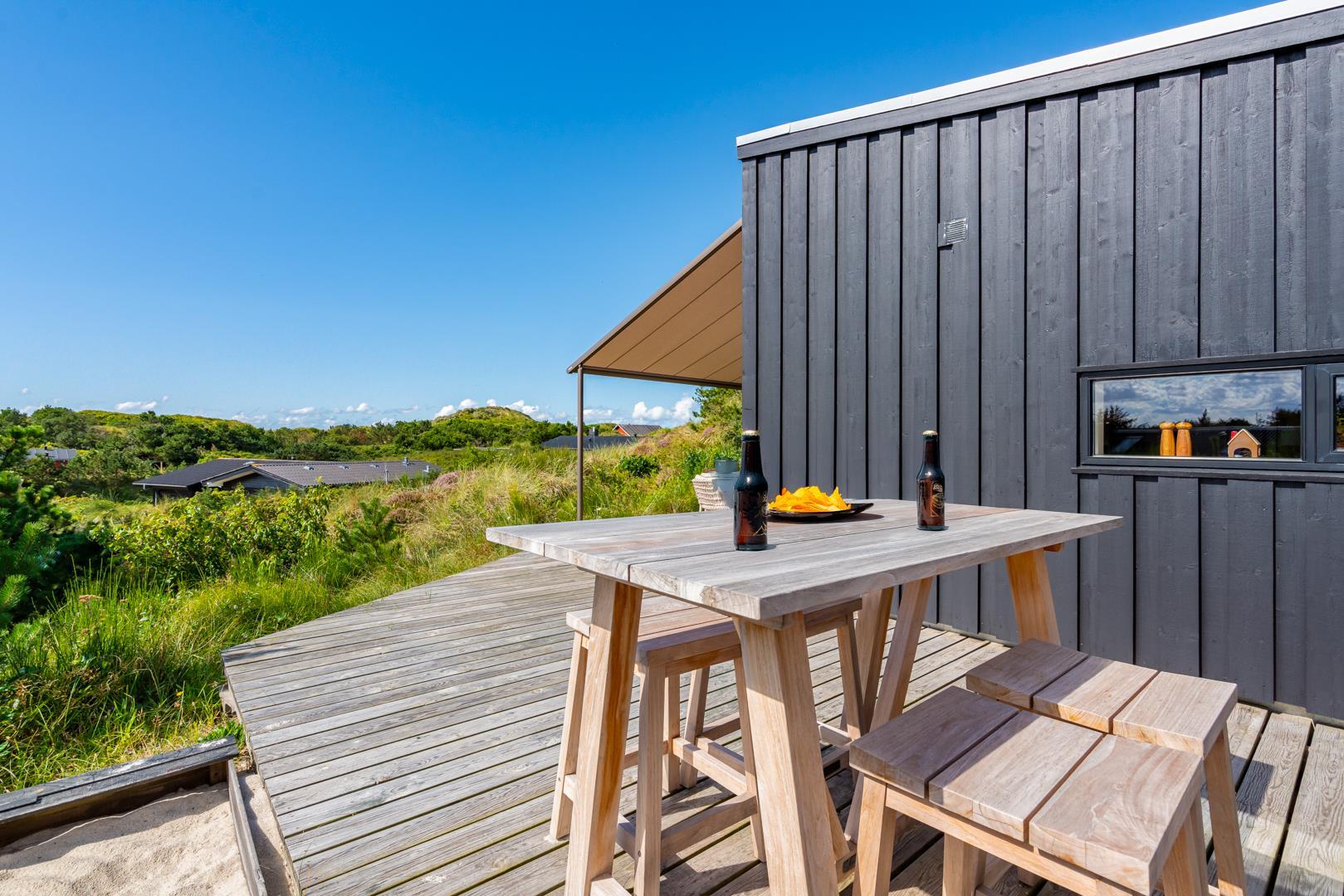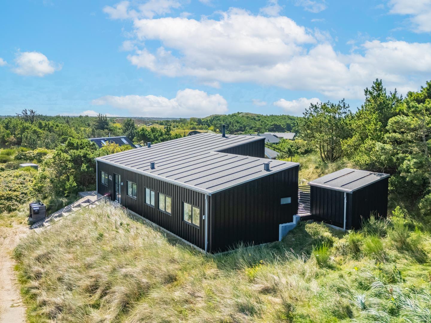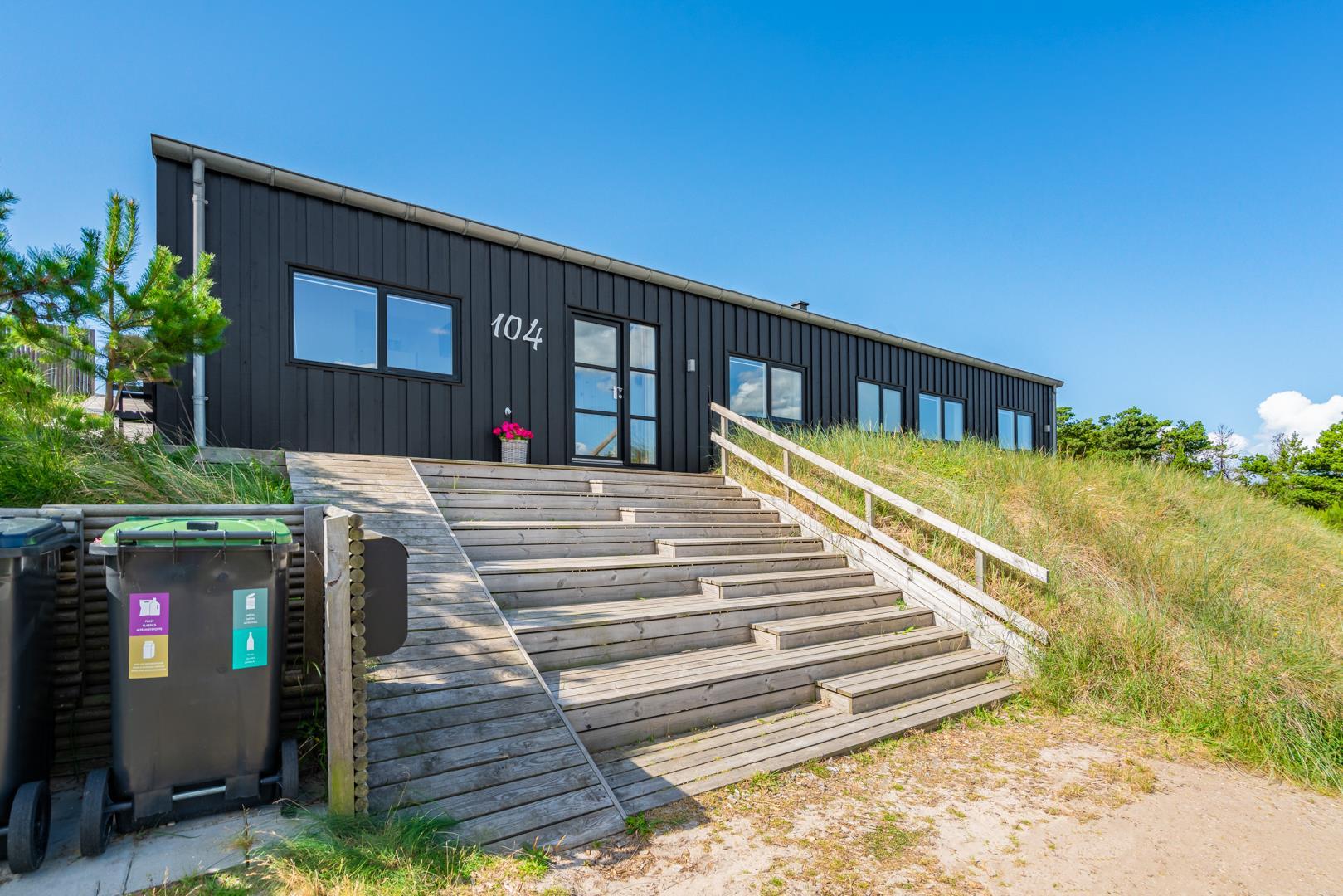 På en smukt kuperet klitgrund ligger dette nyere og flotte arkitekttegnede sommerhus. Her kan op til otte personer holde ferie i stilfulde og topmoderne rammer og i naturskønne omgivelser få skridt fra den brede sandstrand i Henne.
