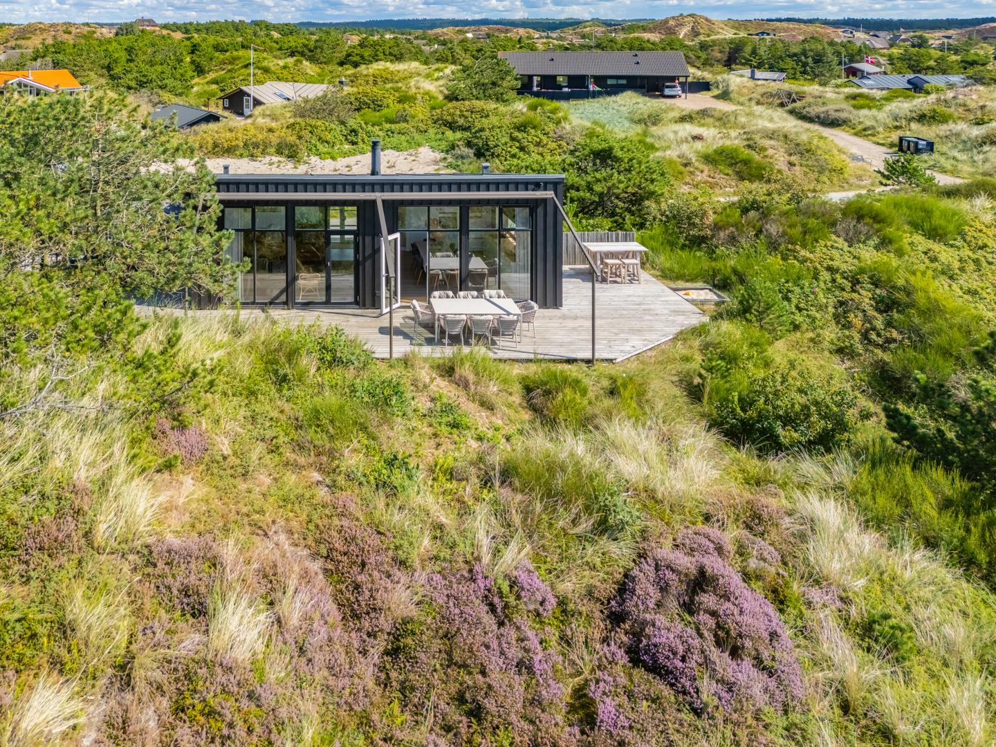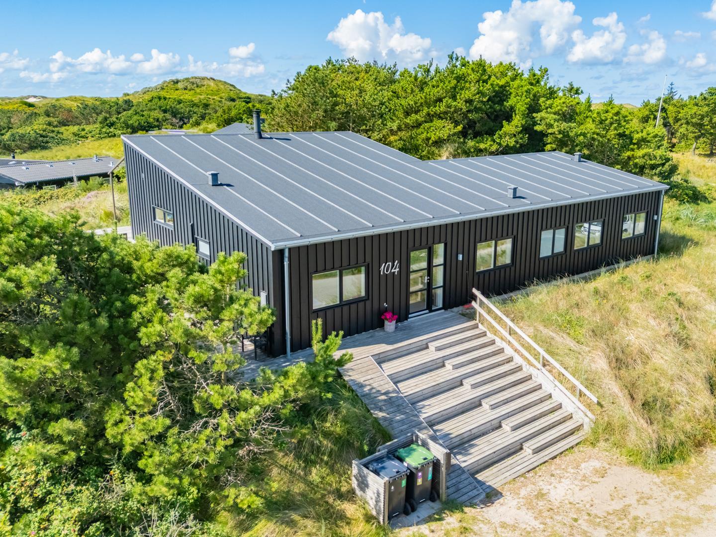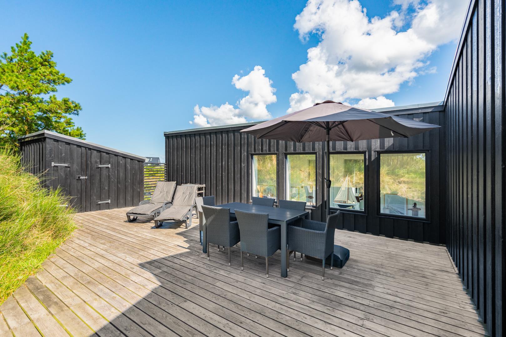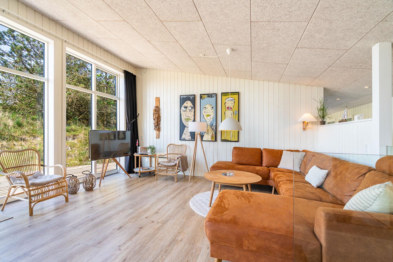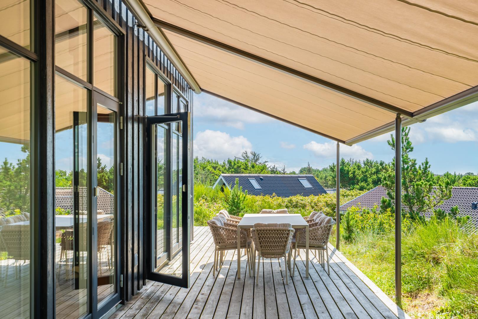 På en smukt kuperet klitgrund ligger dette nyere og flotte arkitekttegnede sommerhus. Her kan op til otte personer holde ferie i stilfulde og topmoderne rammer og i naturskønne omgivelser få skridt fra den brede sandstrand i Henne.