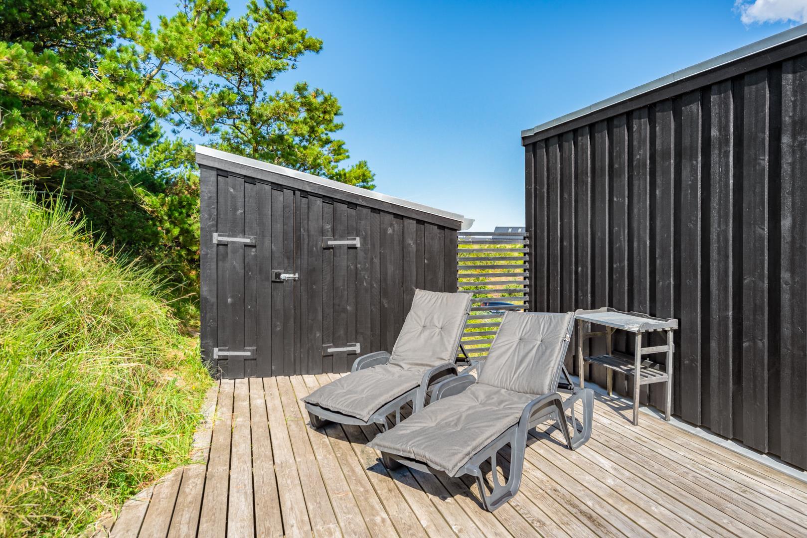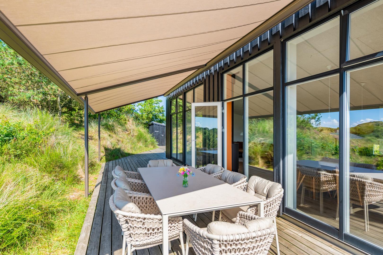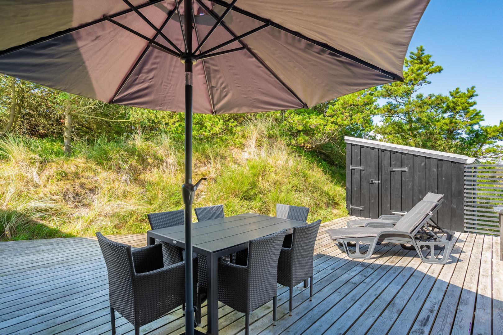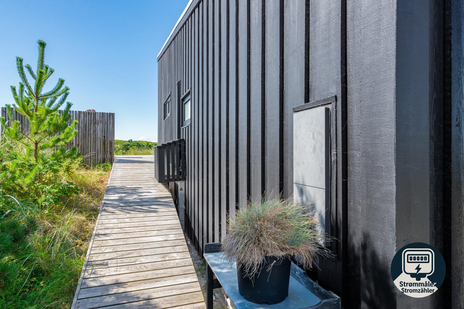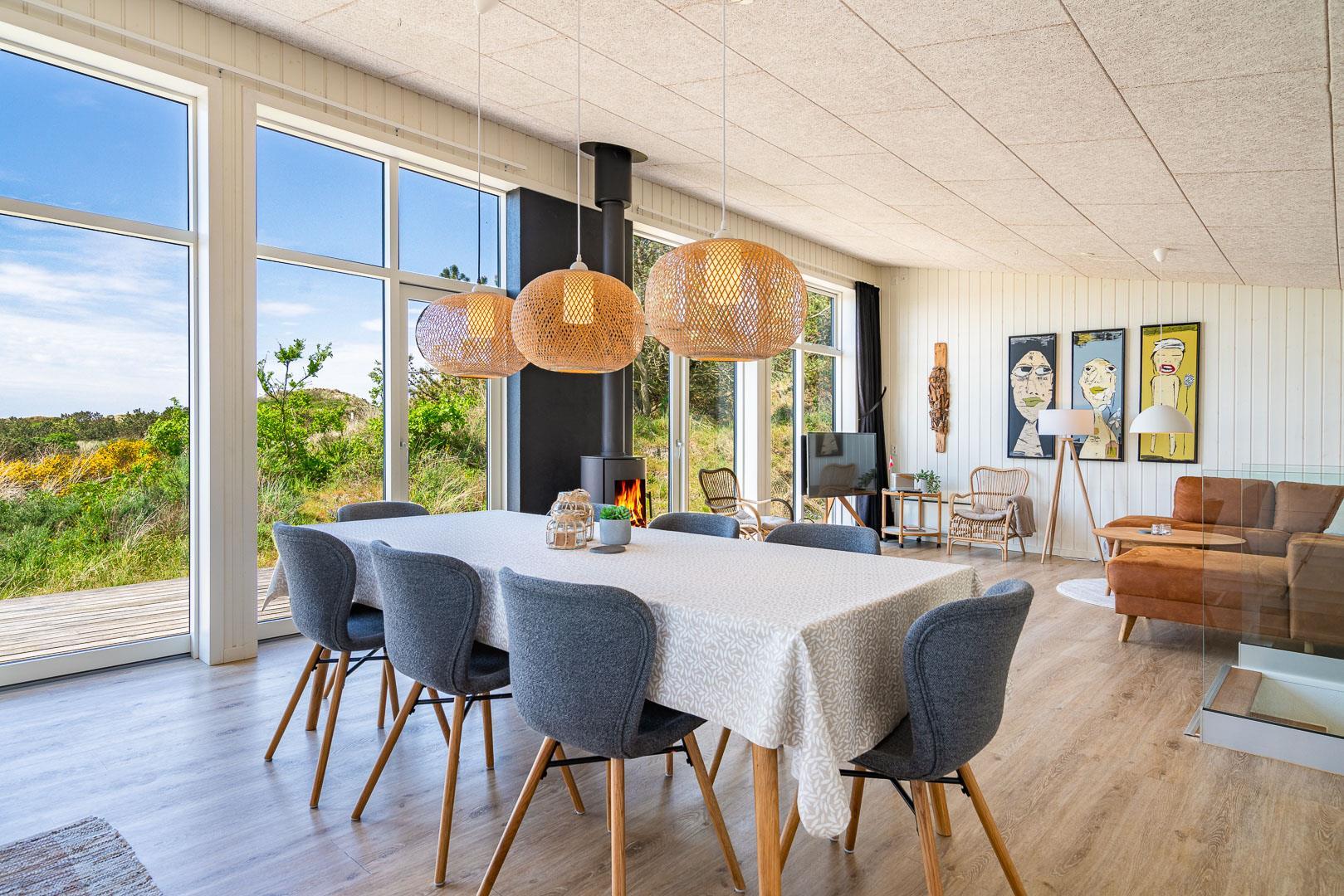 På en smukt kuperet klitgrund ligger dette nyere og flotte arkitekttegnede sommerhus. Her kan op til otte personer holde ferie i stilfulde og topmoderne rammer og i naturskønne omgivelser få skridt fra den brede sandstrand i Henne.