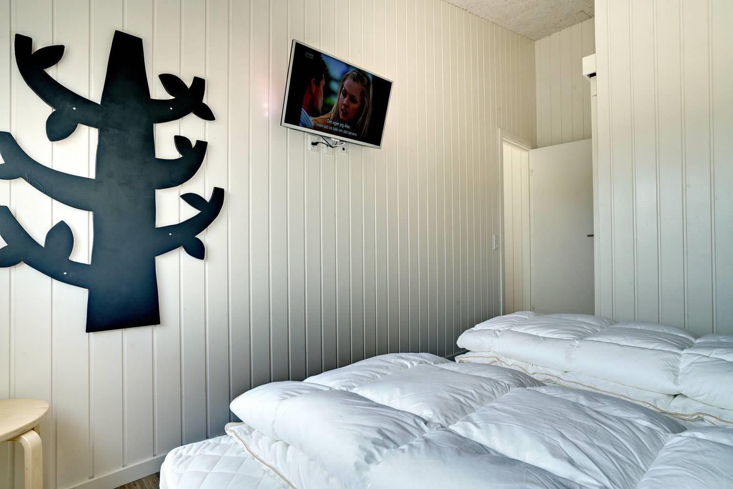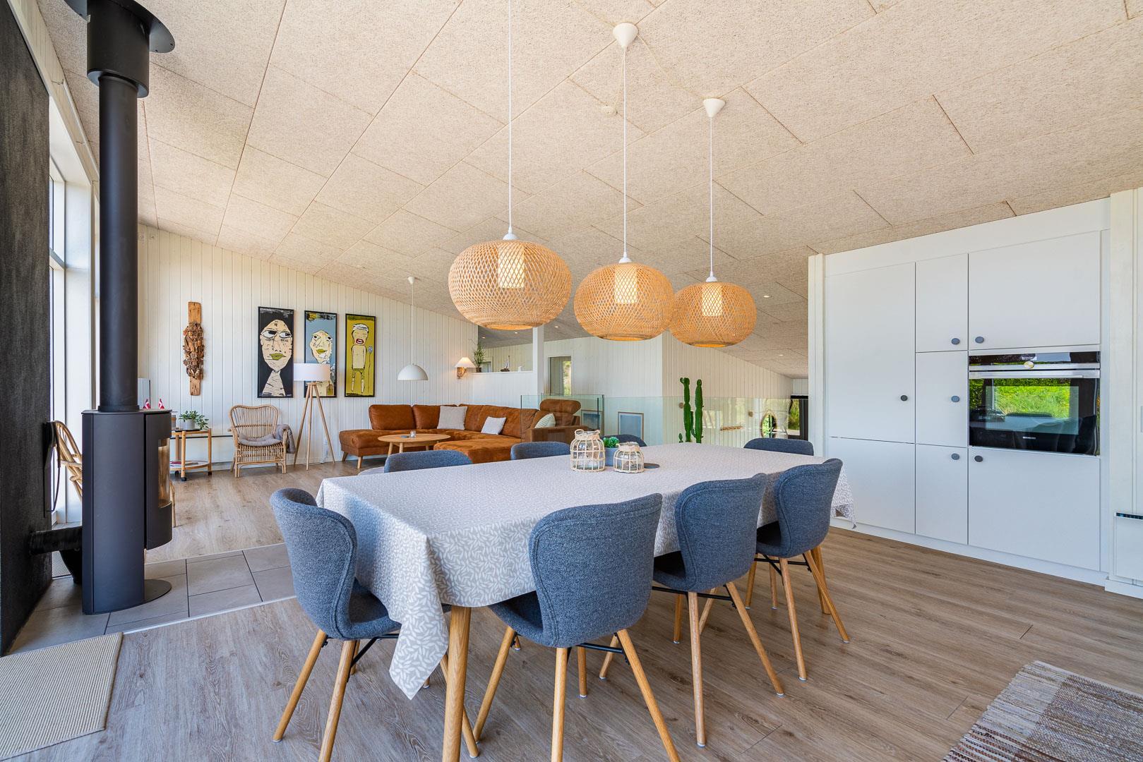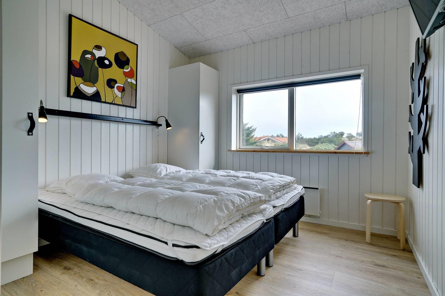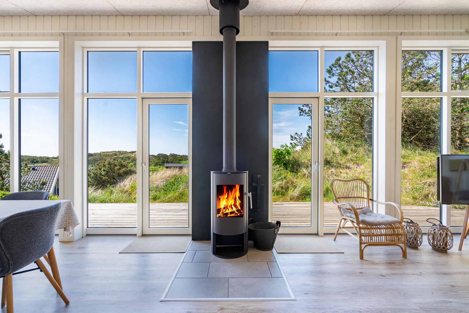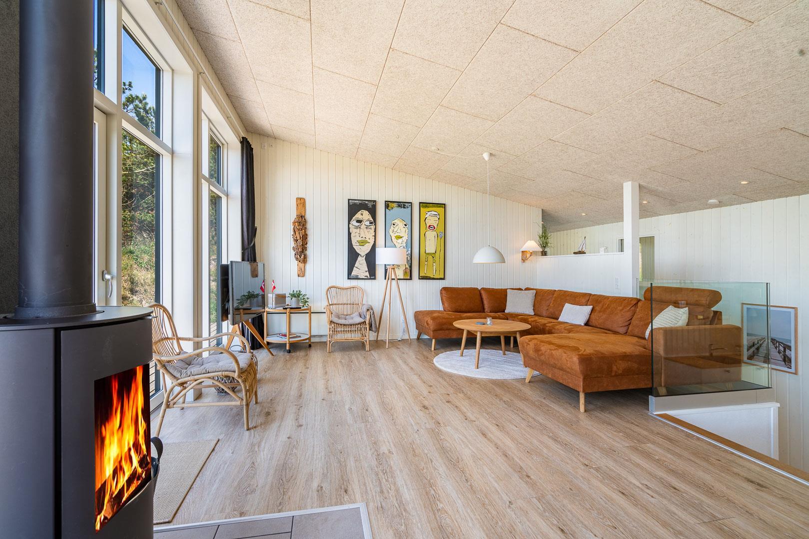 Huset er indrettet med et stort opholdsrum med brændeovn og integreret køkken i øvre plan, mens det nedre plan rummer fire soverum og hele tre lækre brusebadeværelser, hvoraf det ene har sauna og fritstående badekar på 190 cm. Alle værelser har naturligvis senge af høj kvalitet samt TV og god plads i skabene. Sommerhuset råder desuden over to højstole, en barneseng samt vaskefaciliteter og en hurtig internetforbindelse.