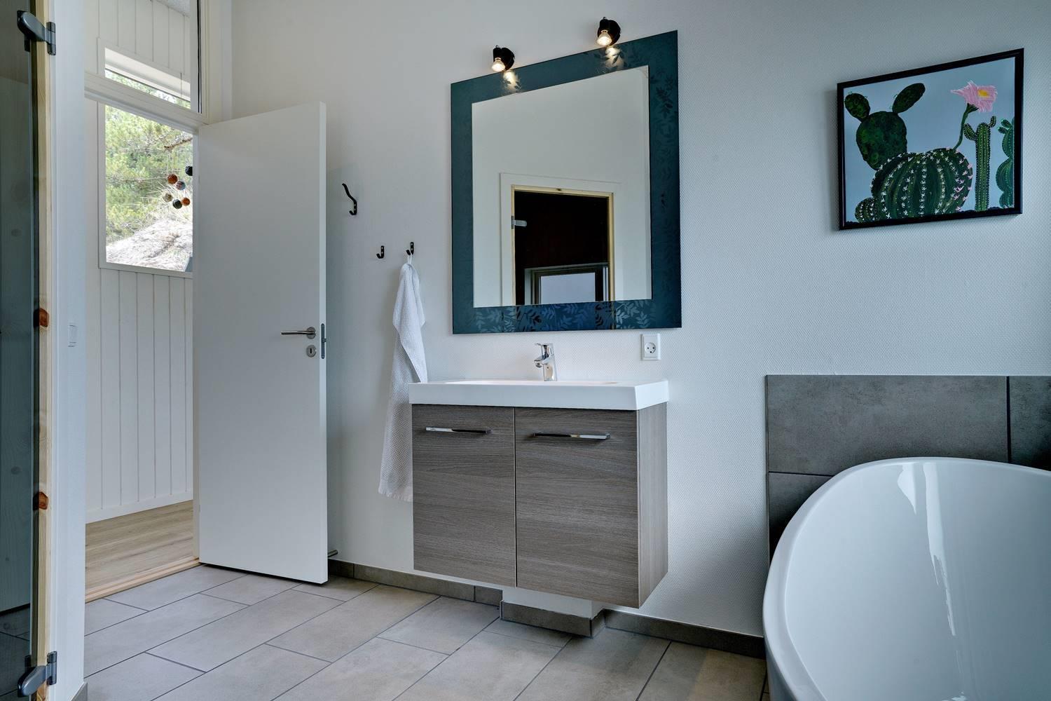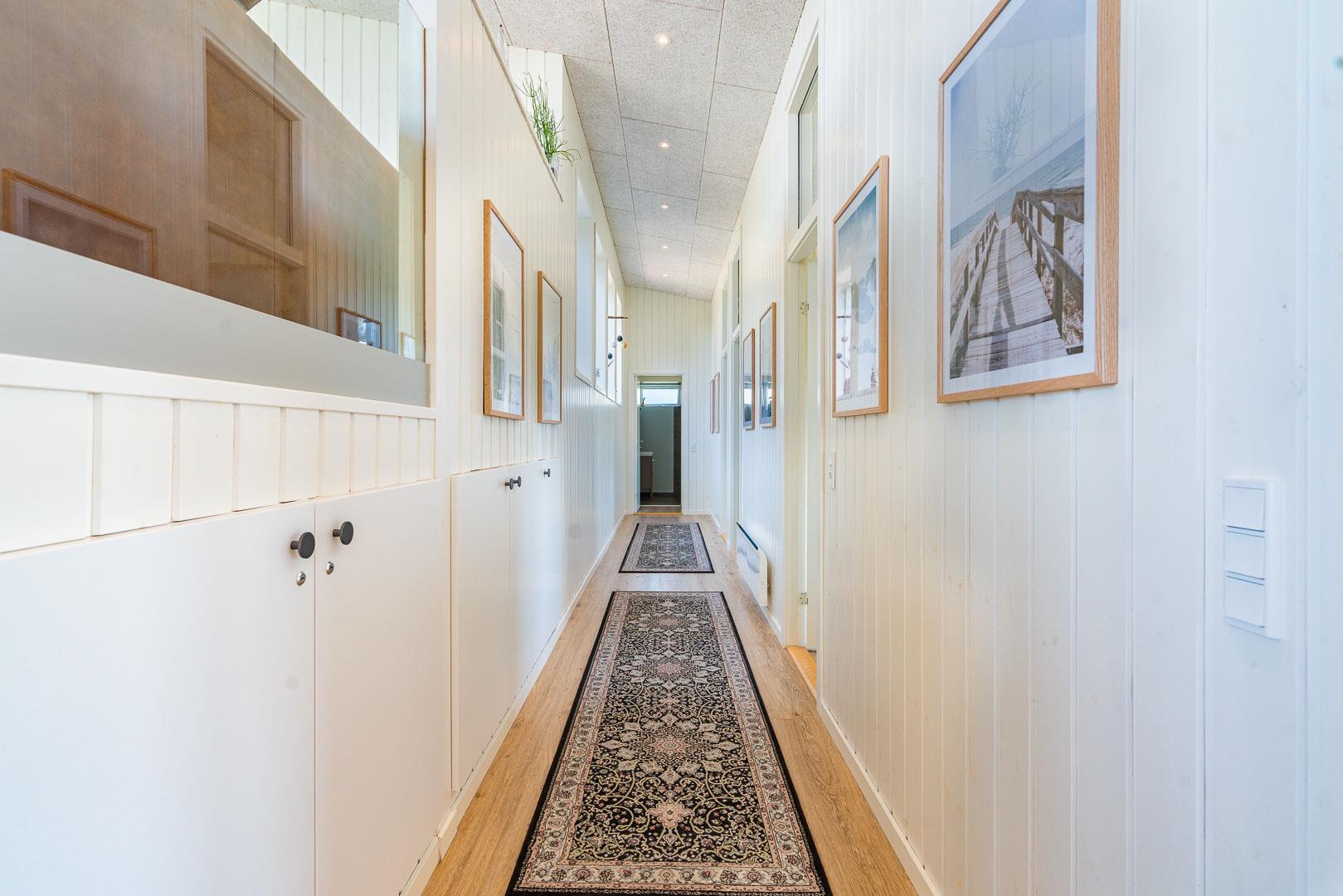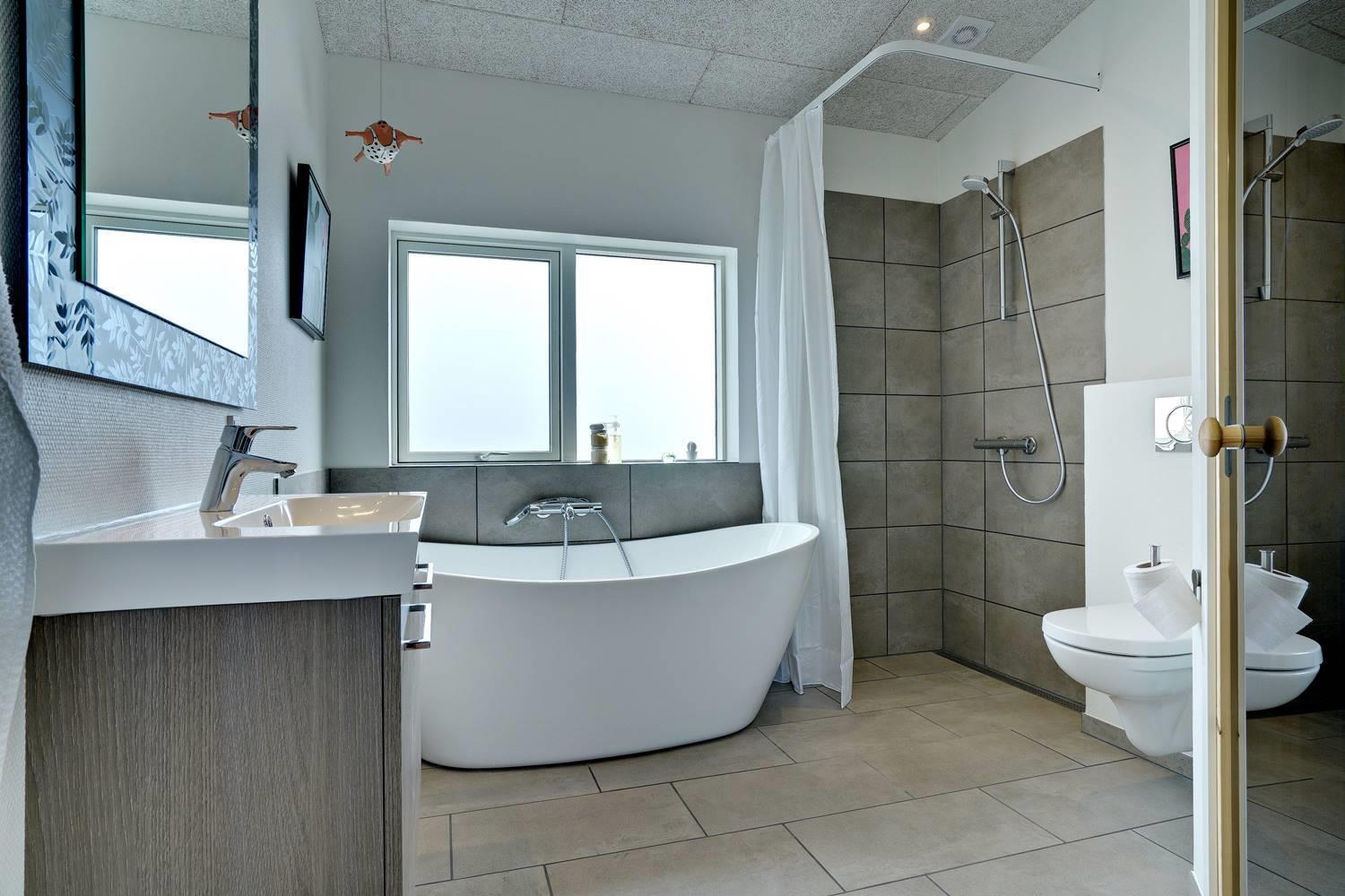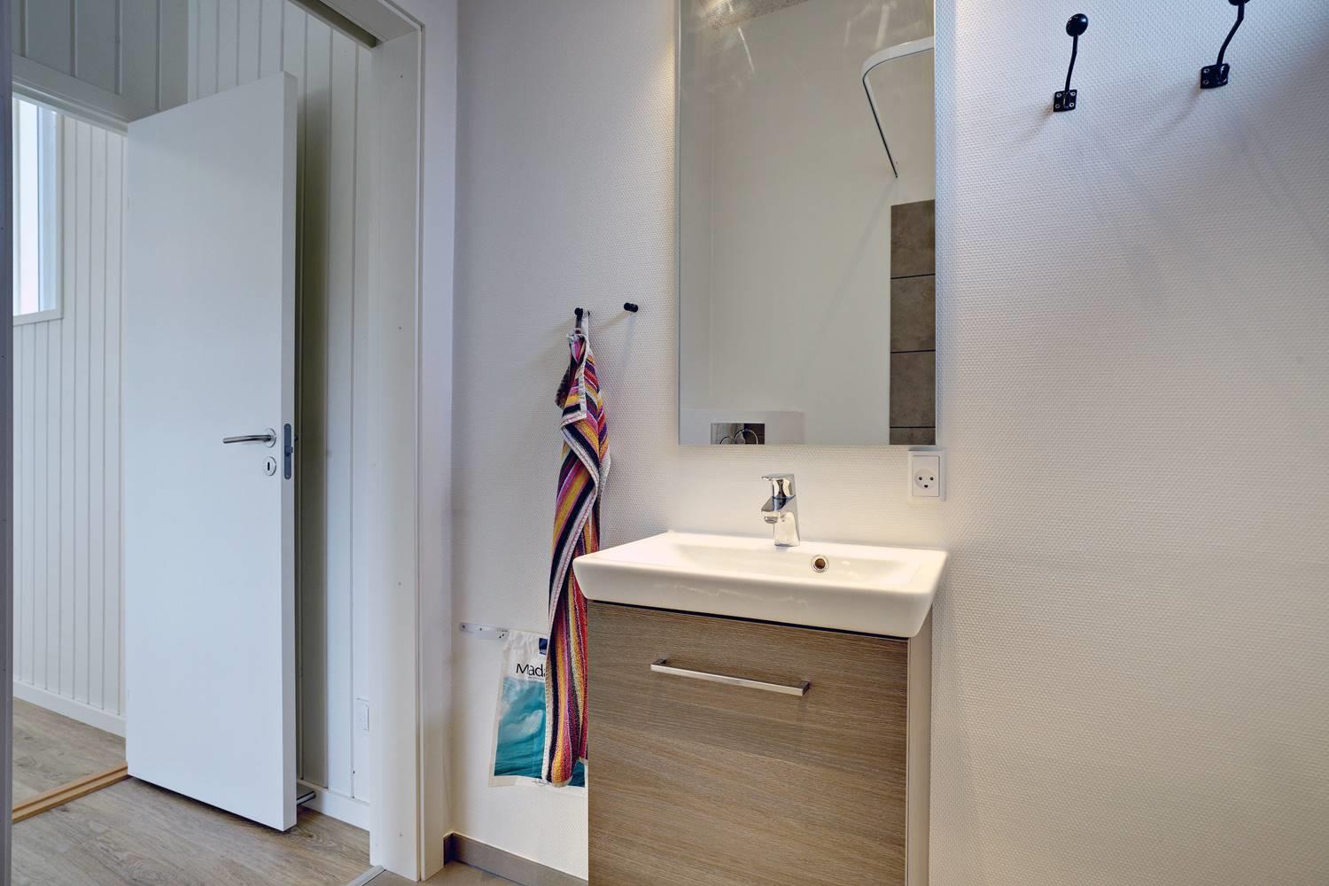 Huset er indrettet med et stort opholdsrum med brændeovn og integreret køkken i øvre plan, mens det nedre plan rummer fire soverum og hele tre lækre brusebadeværelser, hvoraf det ene har sauna og fritstående badekar på 190 cm. Alle værelser har naturligvis senge af høj kvalitet samt TV og god plads i skabene. Sommerhuset råder desuden over to højstole, en barneseng samt vaskefaciliteter og en hurtig internetforbindelse.