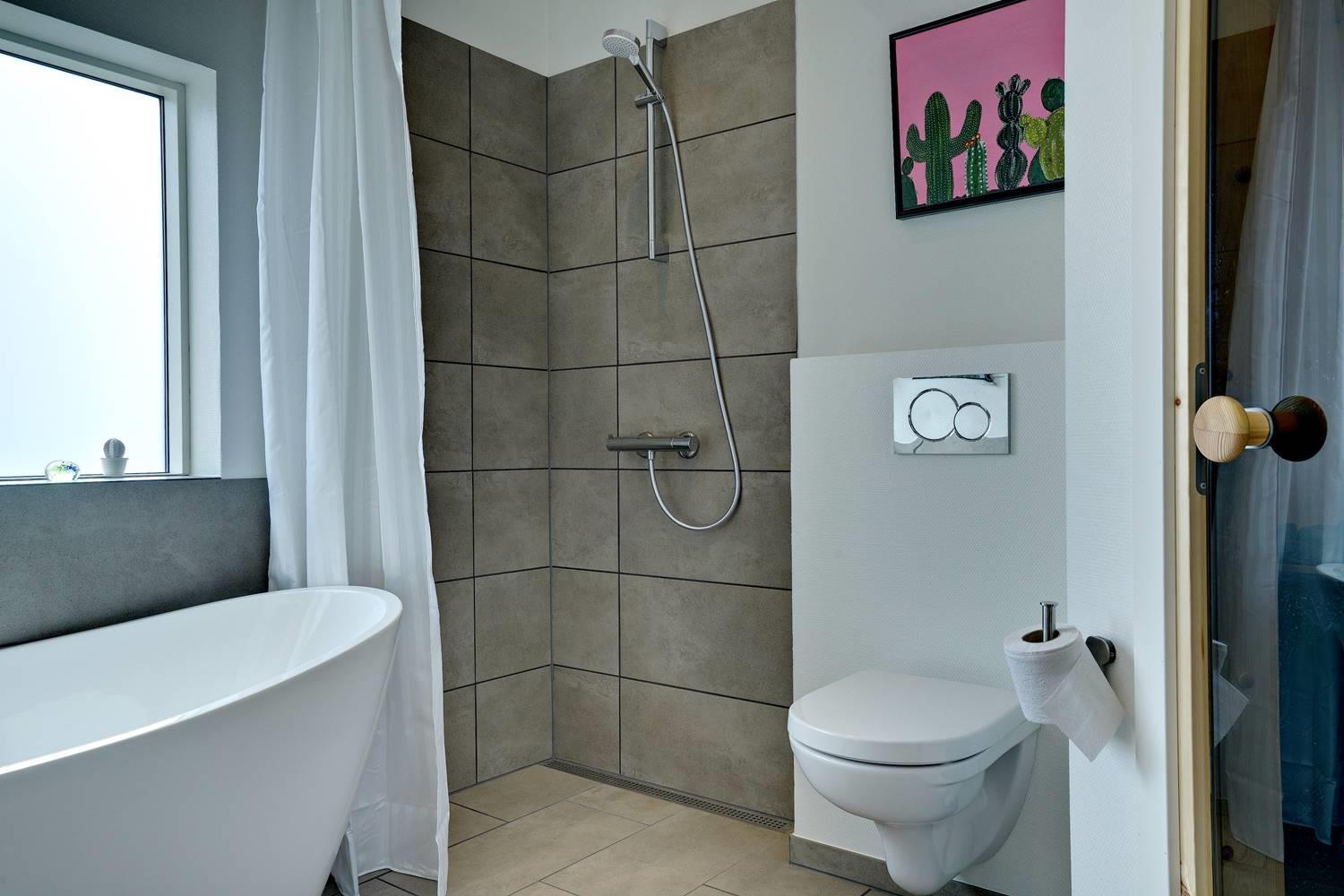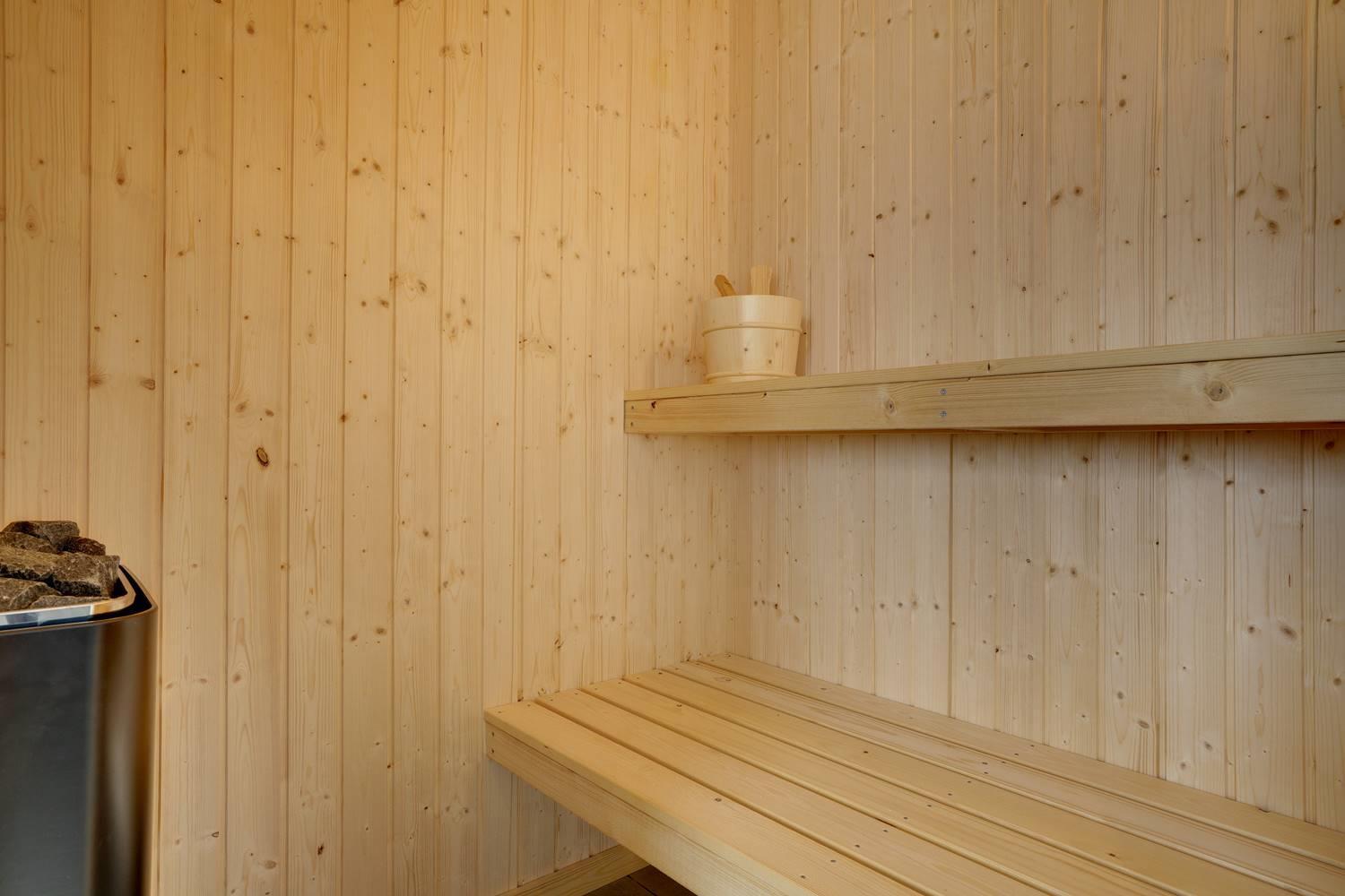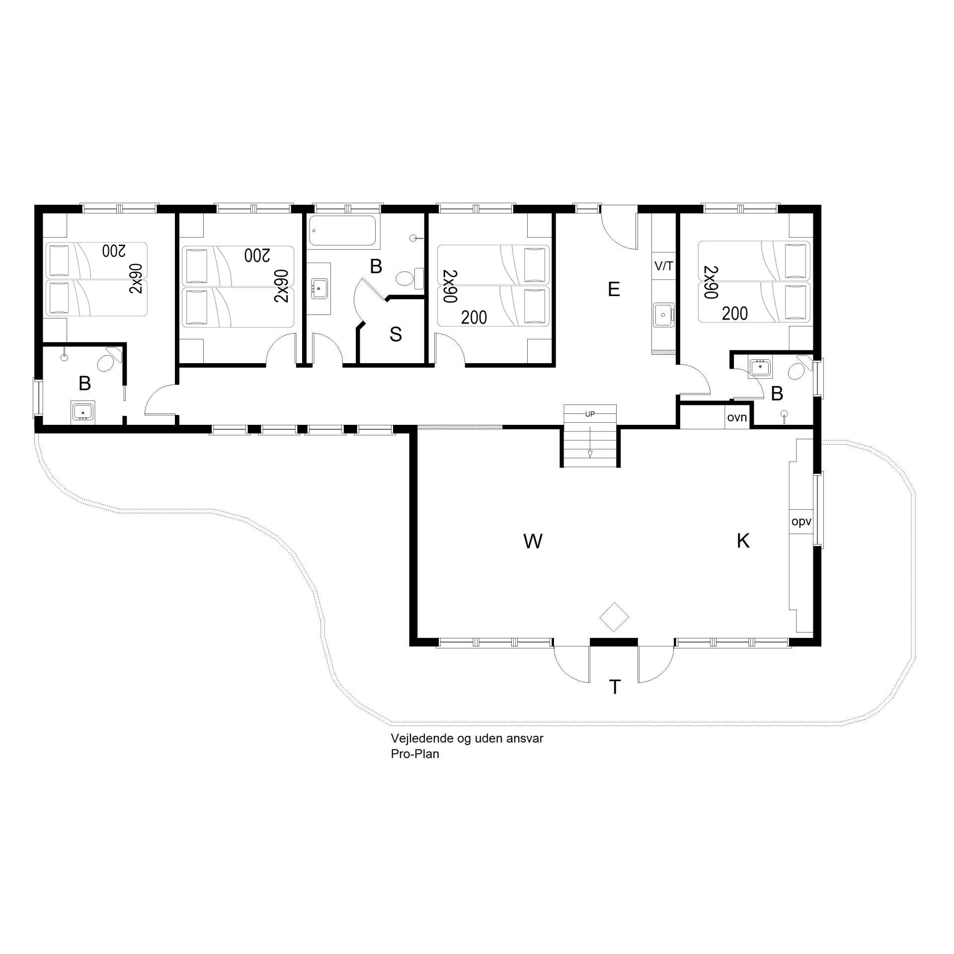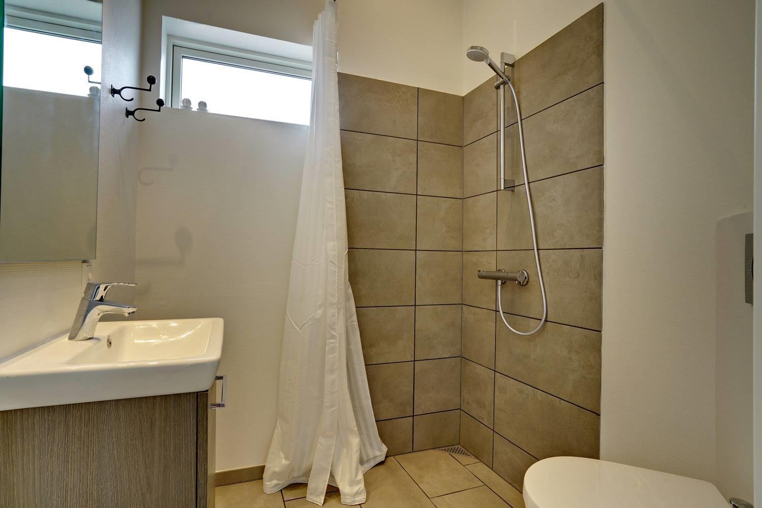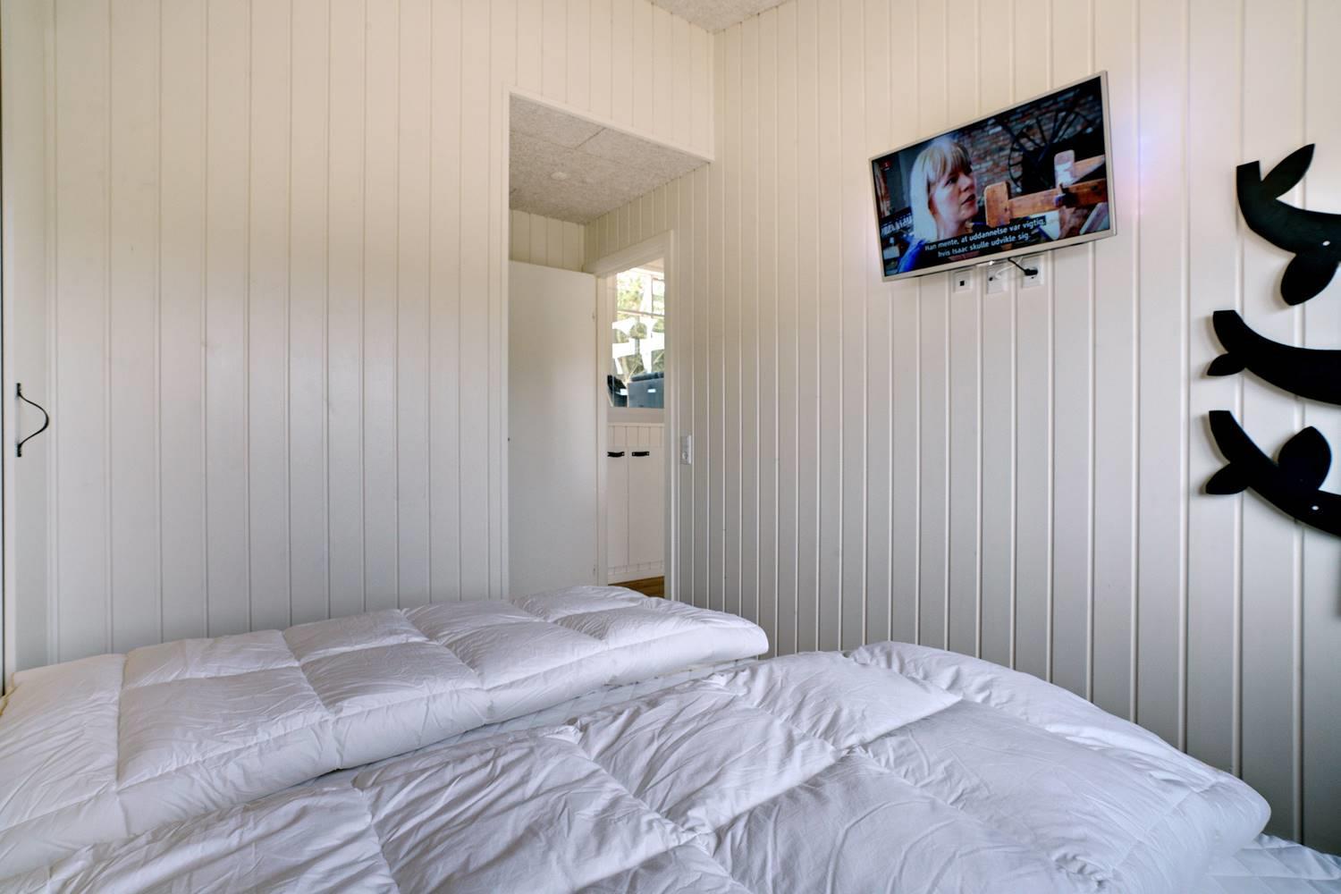 Huset er indrettet med et stort opholdsrum med brændeovn og integreret køkken i øvre plan, mens det nedre plan rummer fire soverum og hele tre lækre brusebadeværelser, hvoraf det ene har sauna og fritstående badekar på 190 cm. Alle værelser har naturligvis senge af høj kvalitet samt TV og god plads i skabene. Sommerhuset råder desuden over to højstole, en barneseng samt vaskefaciliteter og en hurtig internetforbindelse.