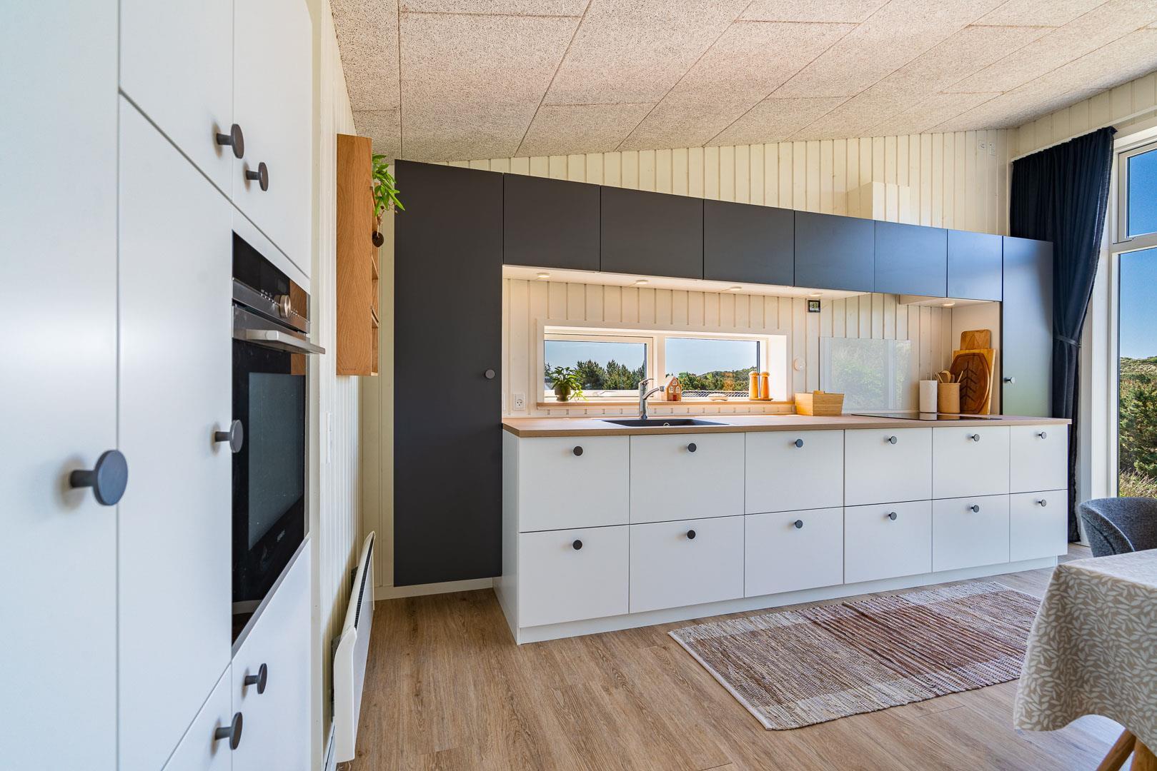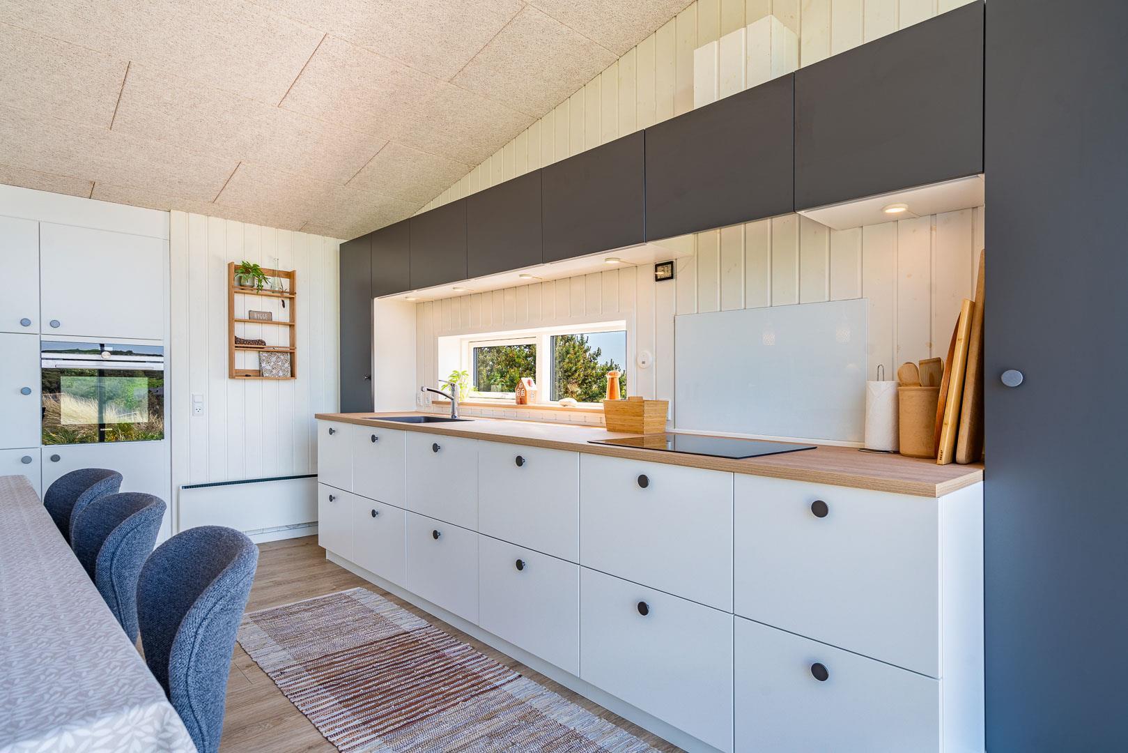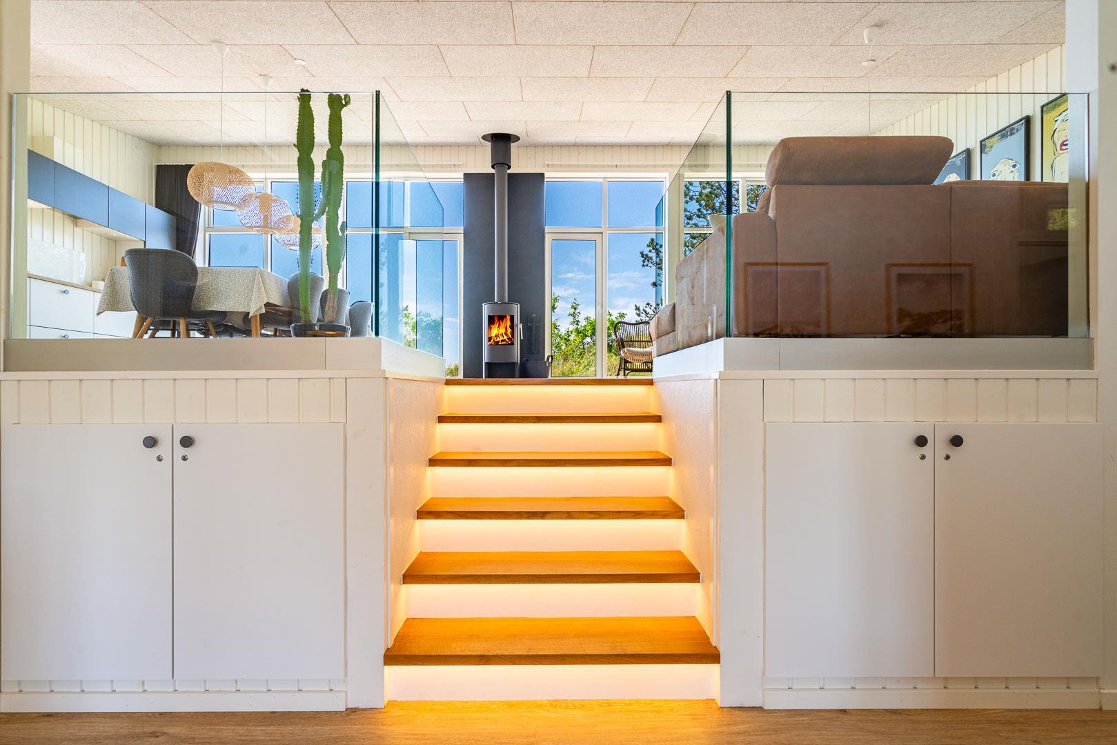 Sommerhuset er opført med respekt for og i harmoni med det smukke klitlandskab. Niveauforskelle skaber en spændende rumoplevelse indenfor, og udsigten er intet mindre fænomenal takket være grundens hældning. Stilen er snorlige og samtidig super personlig med rene linjer i møbler og interiør, men kontinuerligt med et tvist - eksempelvis bryder frække lædergreb med de stilrene, hvide låger på skabene rundt omkring, og en flot trappe med indbygget lys forbinder niveauerne.