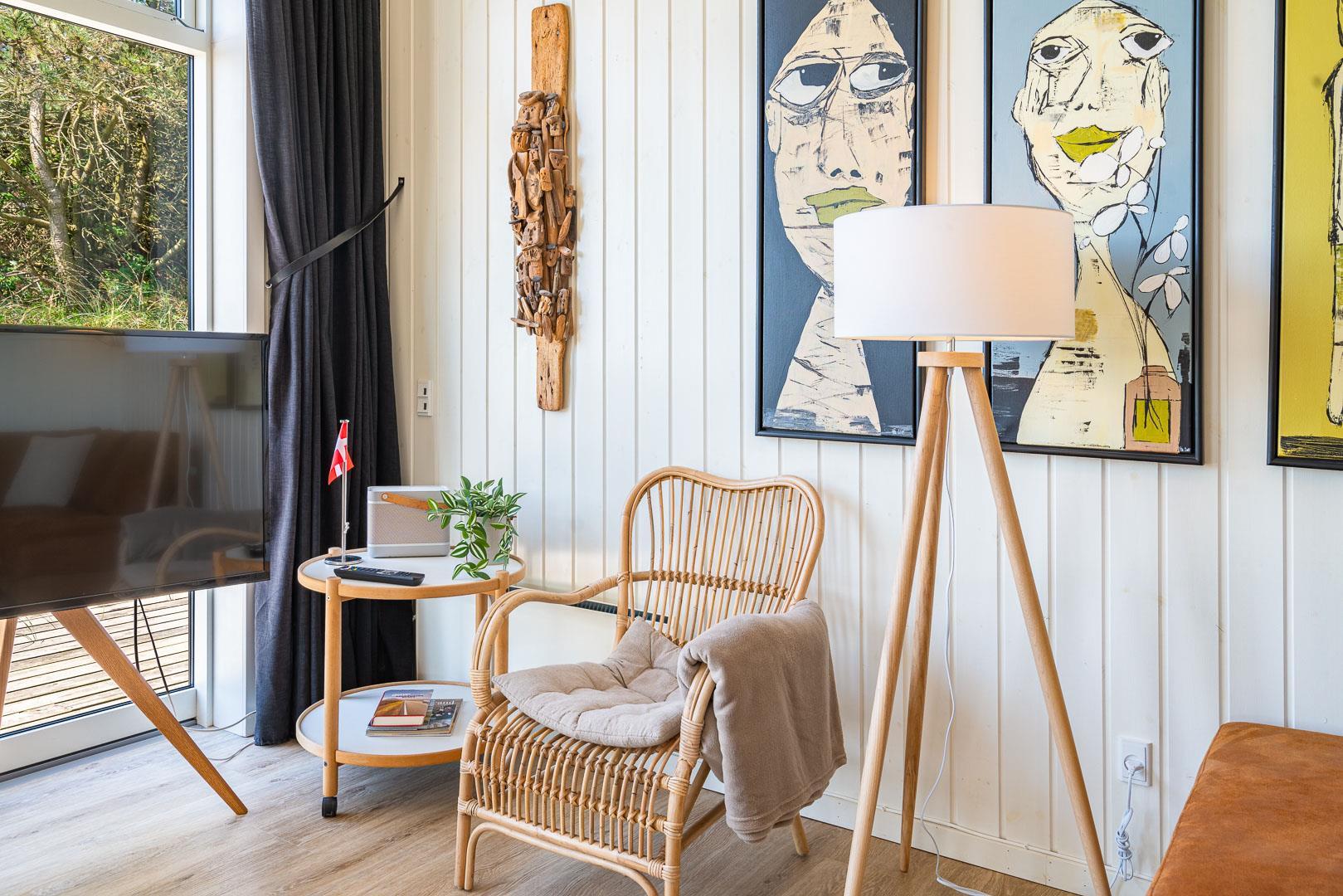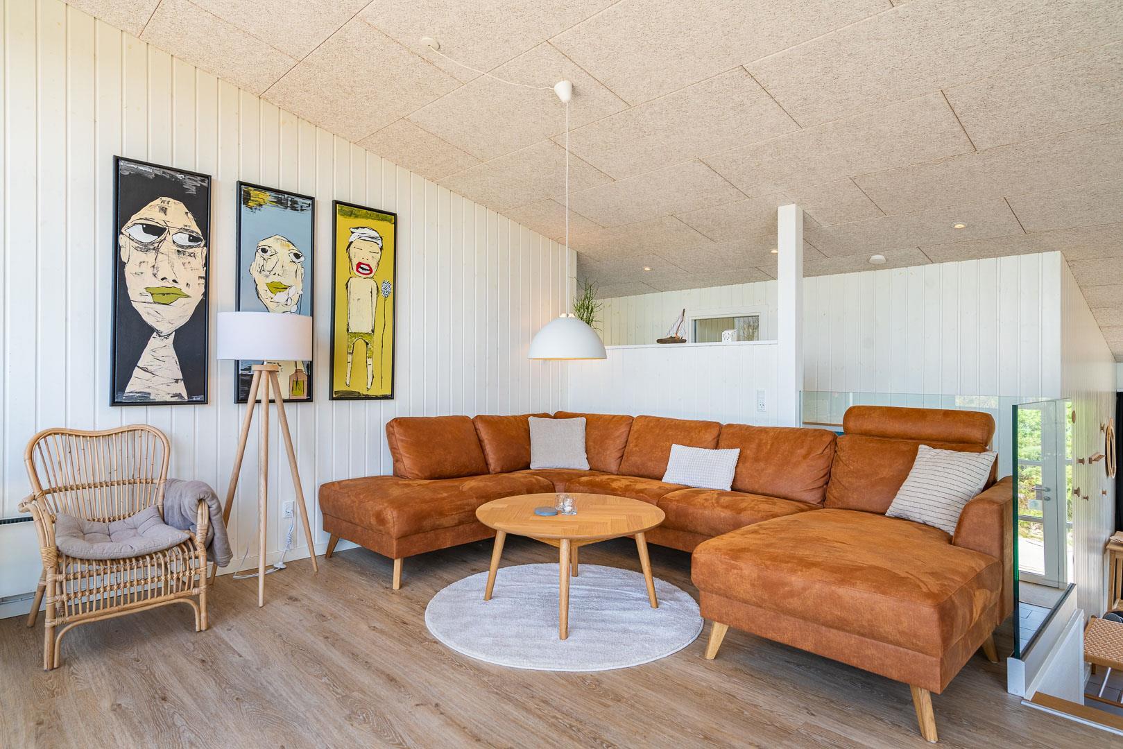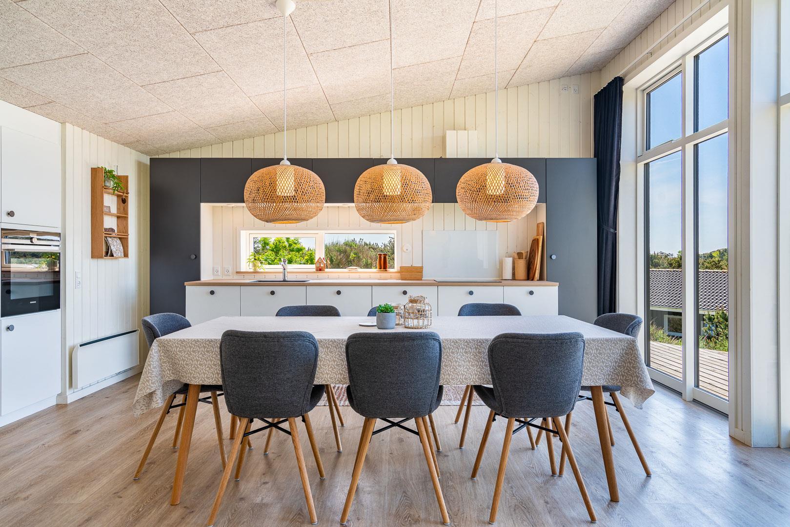 Sommerhuset er opført med respekt for og i harmoni med det smukke klitlandskab. Niveauforskelle skaber en spændende rumoplevelse indenfor, og udsigten er intet mindre fænomenal takket være grundens hældning. Stilen er snorlige og samtidig super personlig med rene linjer i møbler og interiør, men kontinuerligt med et tvist - eksempelvis bryder frække lædergreb med de stilrene, hvide låger på skabene rundt omkring, og en flot trappe med indbygget lys forbinder niveauerne.