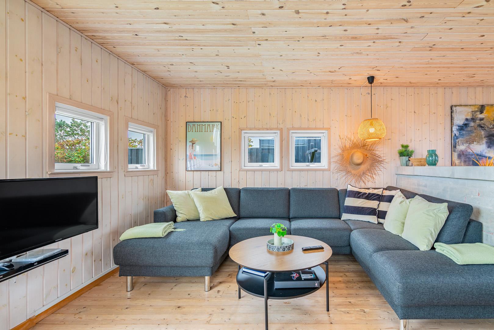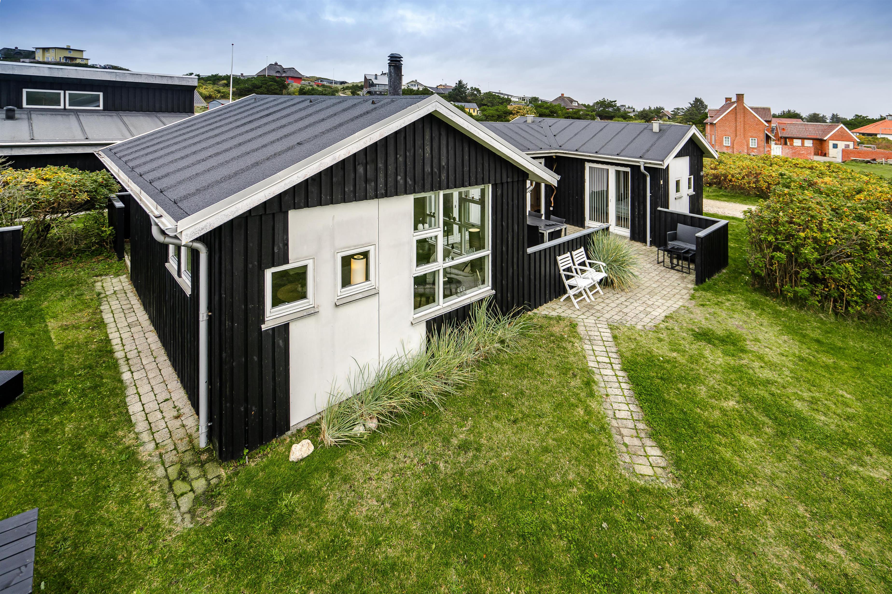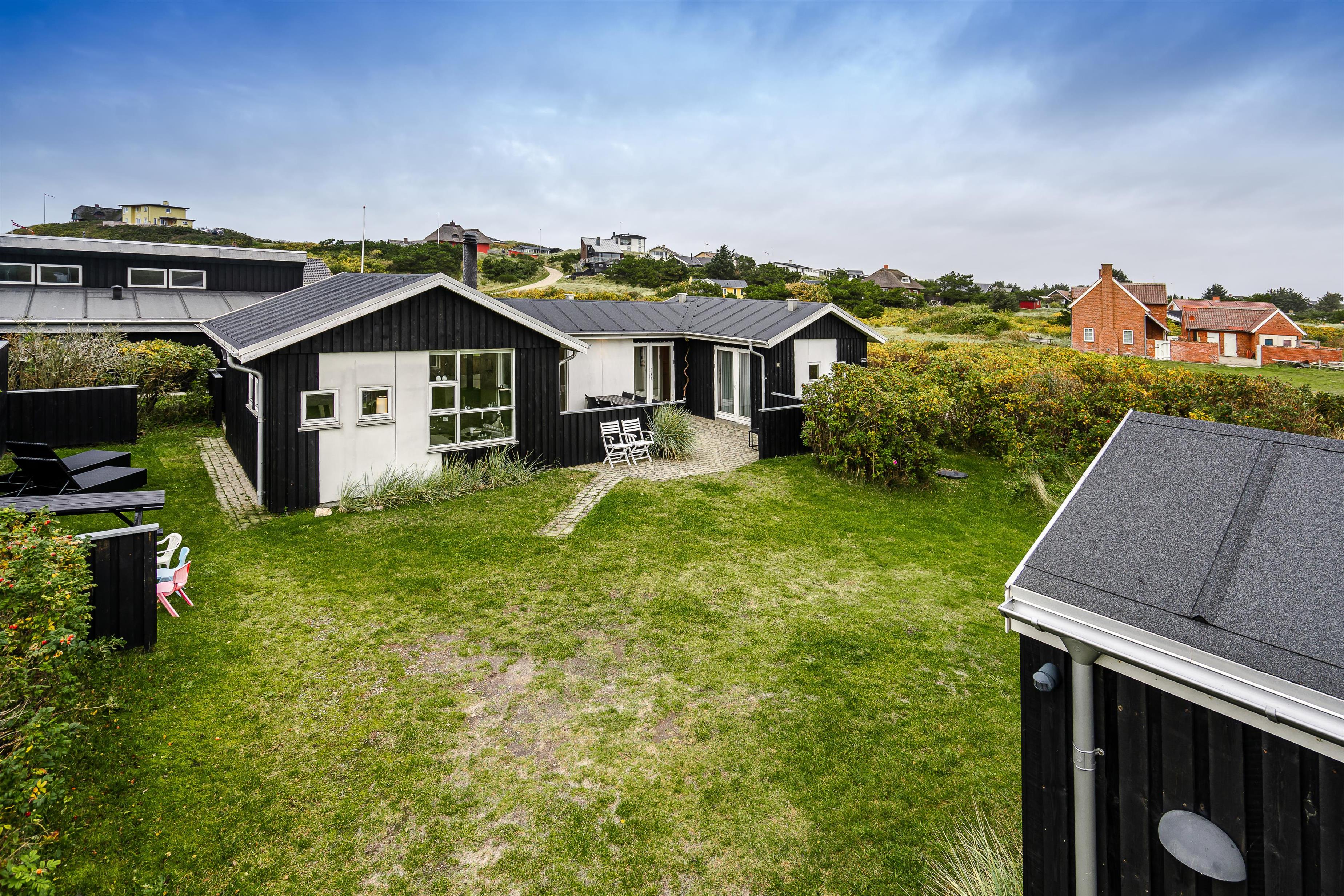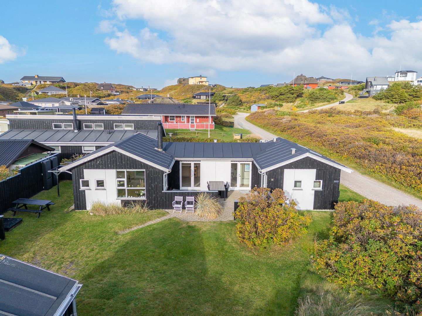 Beliggende på en dejlig naturgrund i gåafstand fra Henne Strands centrum, men alligevel på en ugenert naturgrund, ligger dette dejlige feriehus. Huset er smagfuld indrettet med gode møbler og store soverum med gode senge. Flot køkken og badeværelse. Fra stuen er der udgang til den ene af husets terrasser.