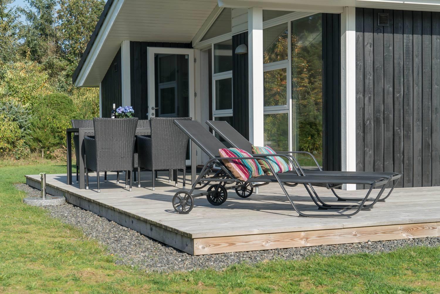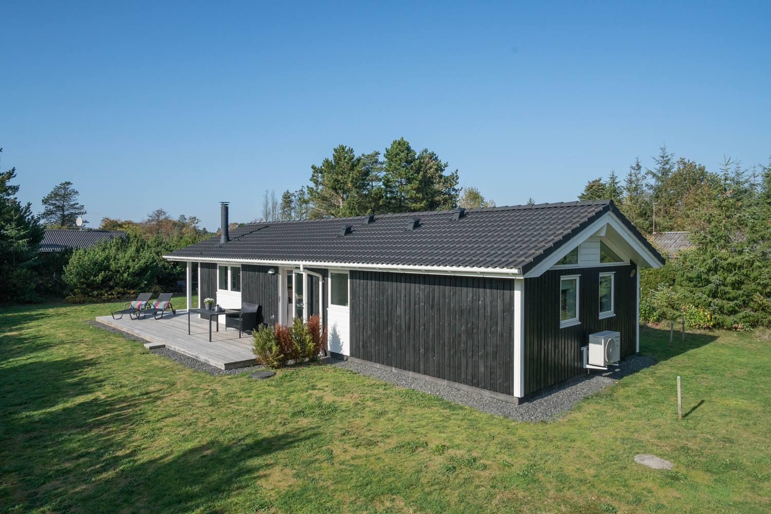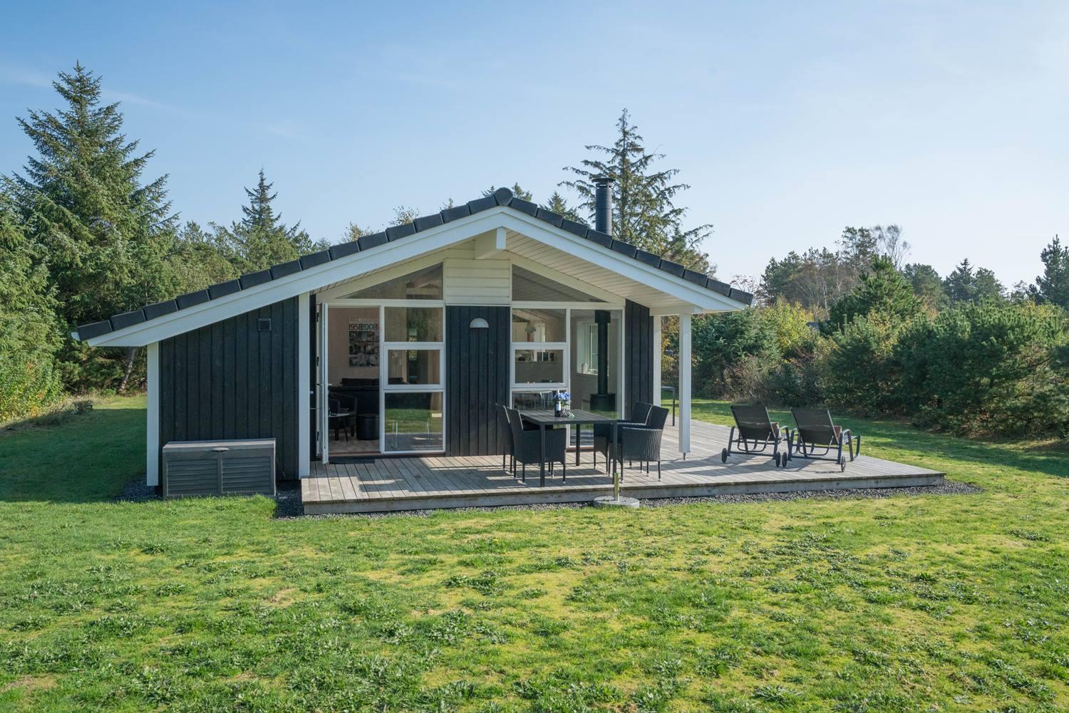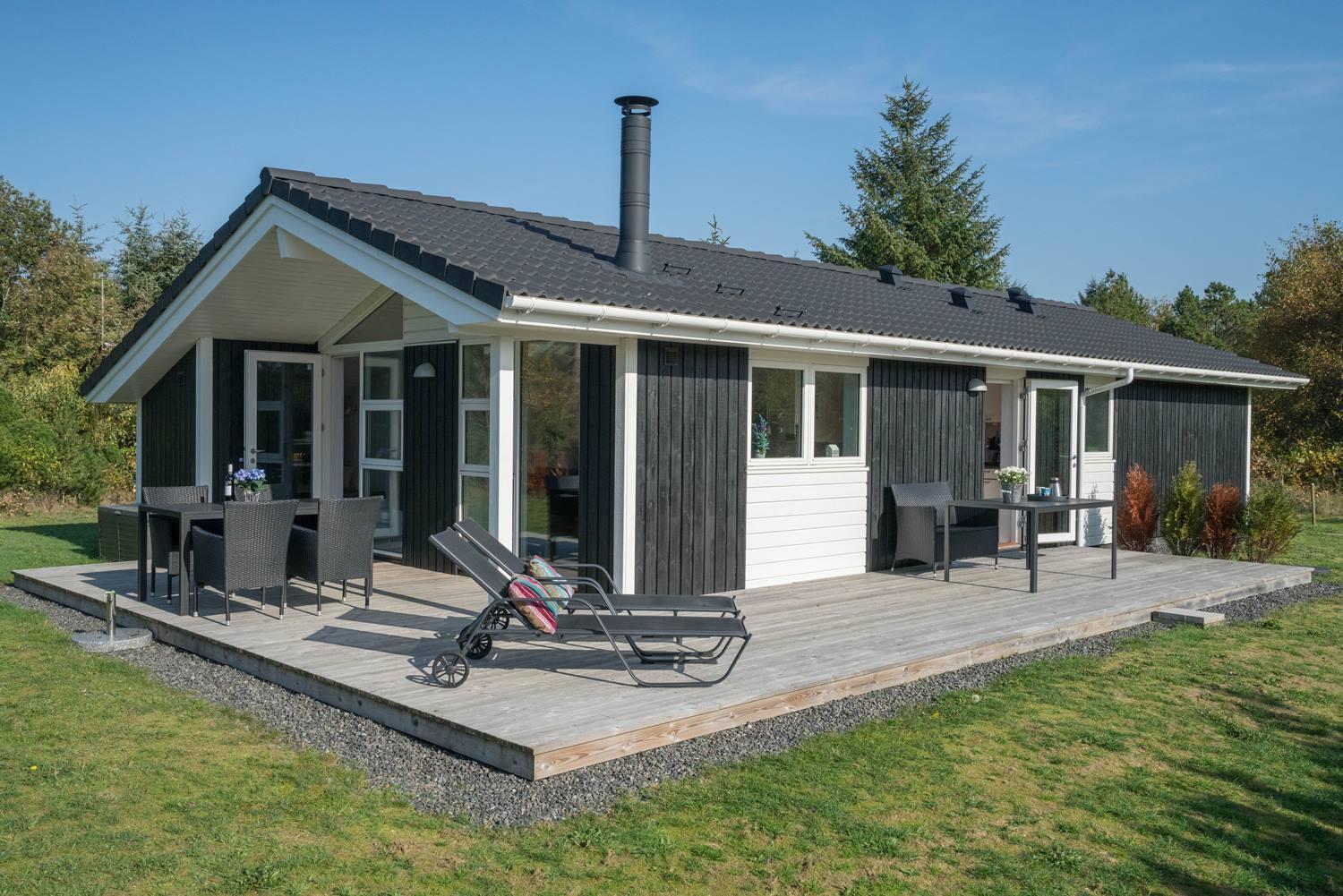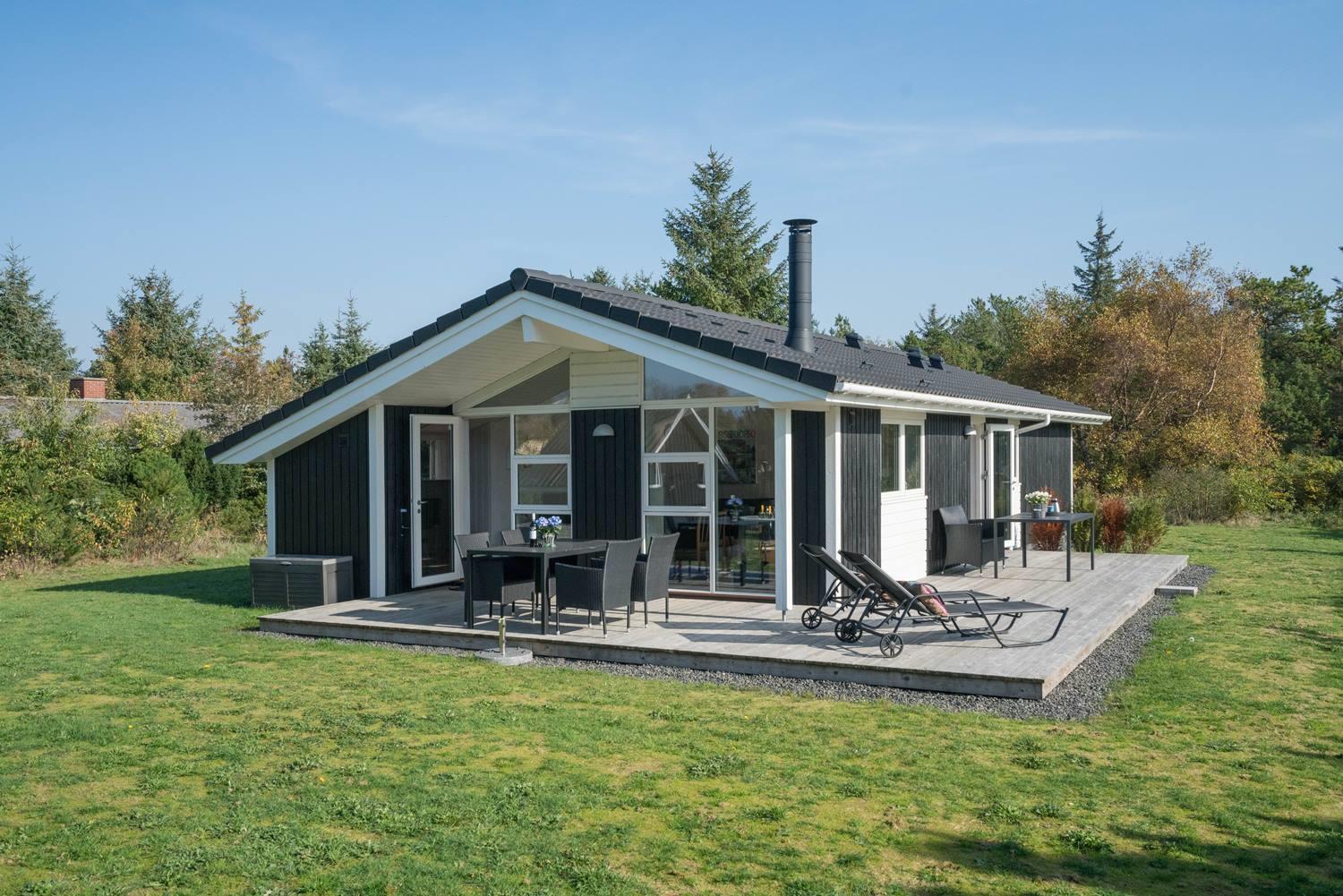 Velindrettet sommerhus på naturgrund nær strand, skov og golf med overdækket terrasse og gode faciliteter.