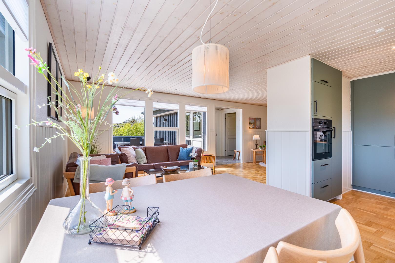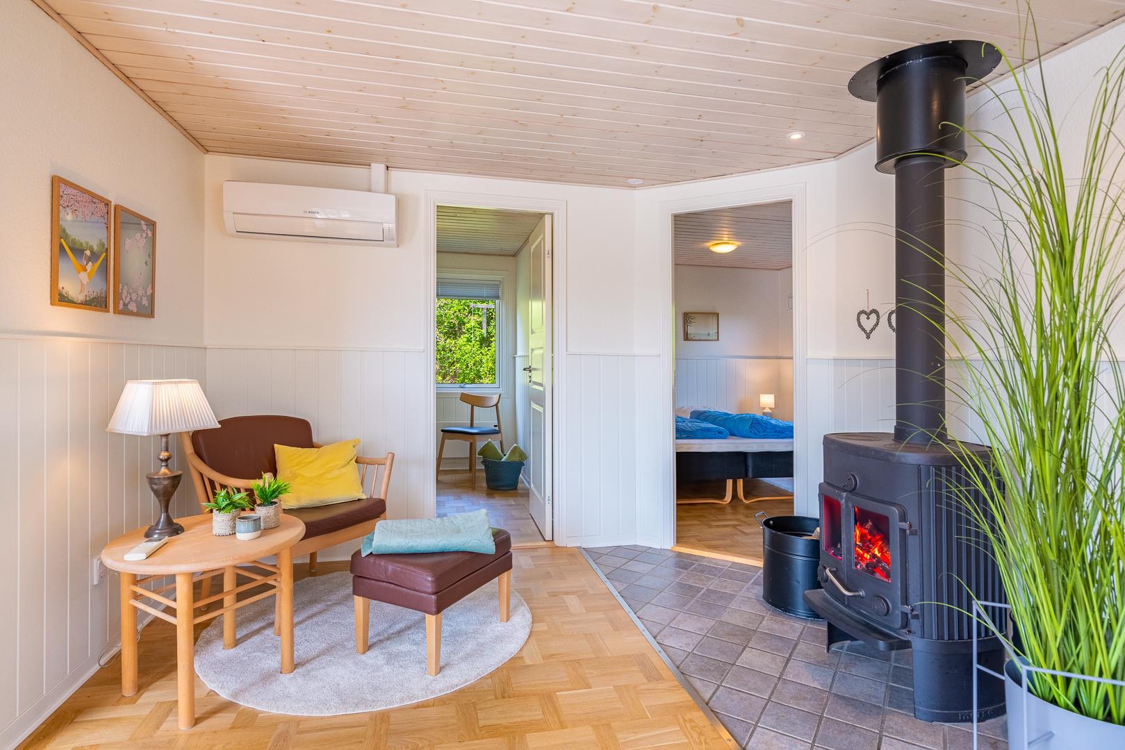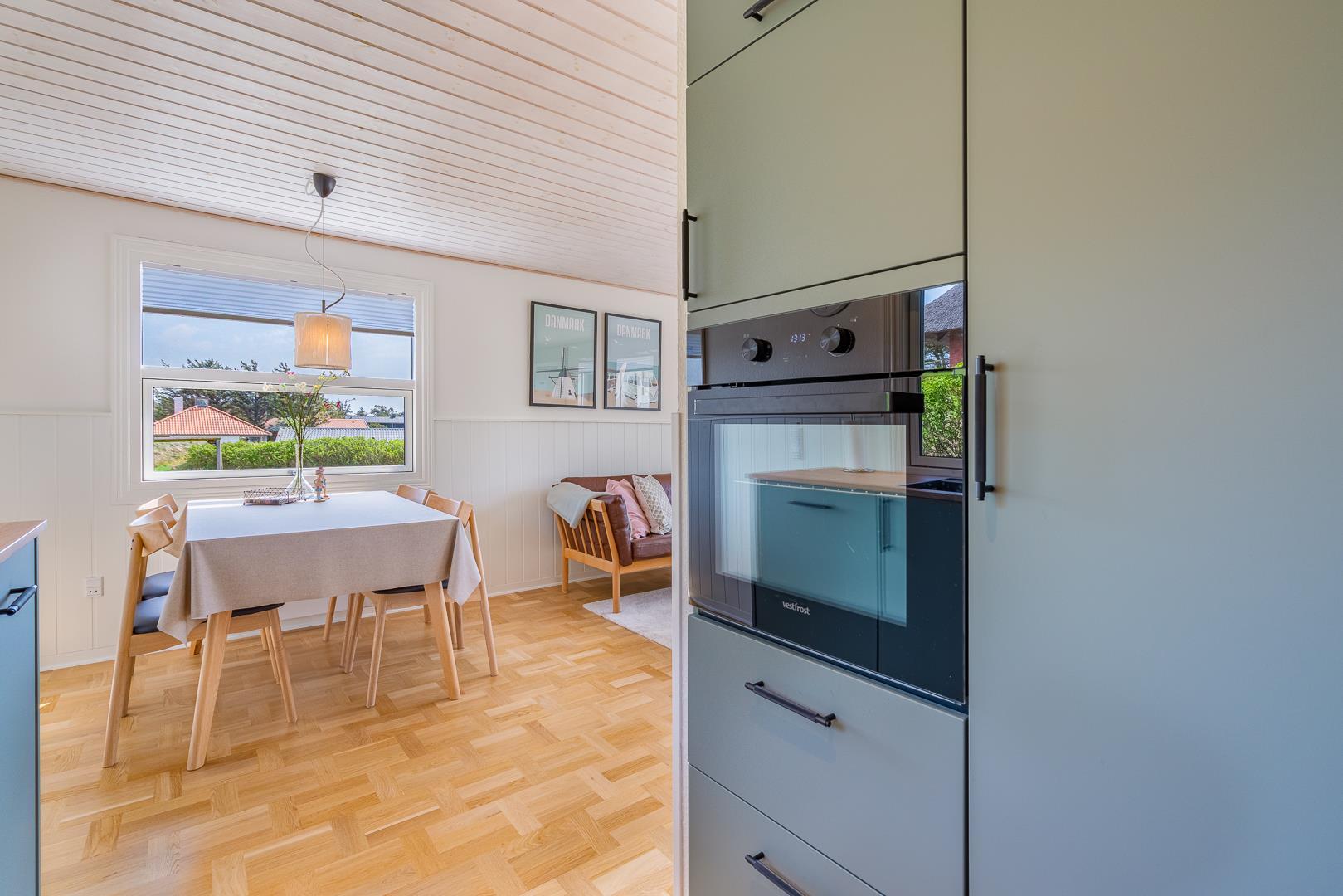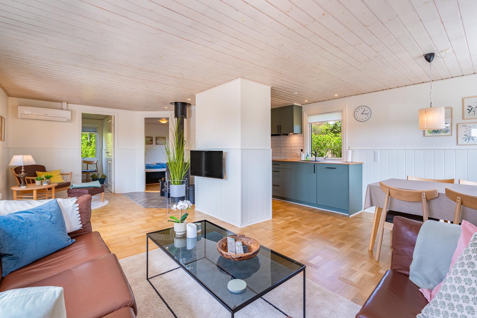 Indenfor er sommerhuset indrettet med fokus på lys, hygge og komfort. Stuen og køkkenet ligger i åben forbindelse og skaber en dejlig rummelig atmosfære. Her er både en spiseplads med udsigt til naturen og en brændeovn, der spreder varme og hygge på kølige aftener. Køkkenet er lyst og veludstyret, perfekt til at tilberede lækre måltider efter en dag ved stranden.
