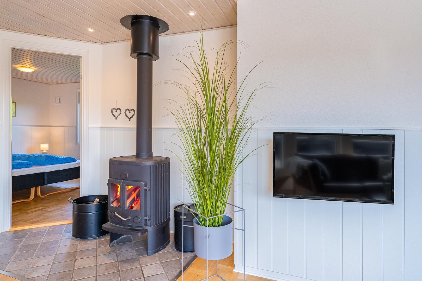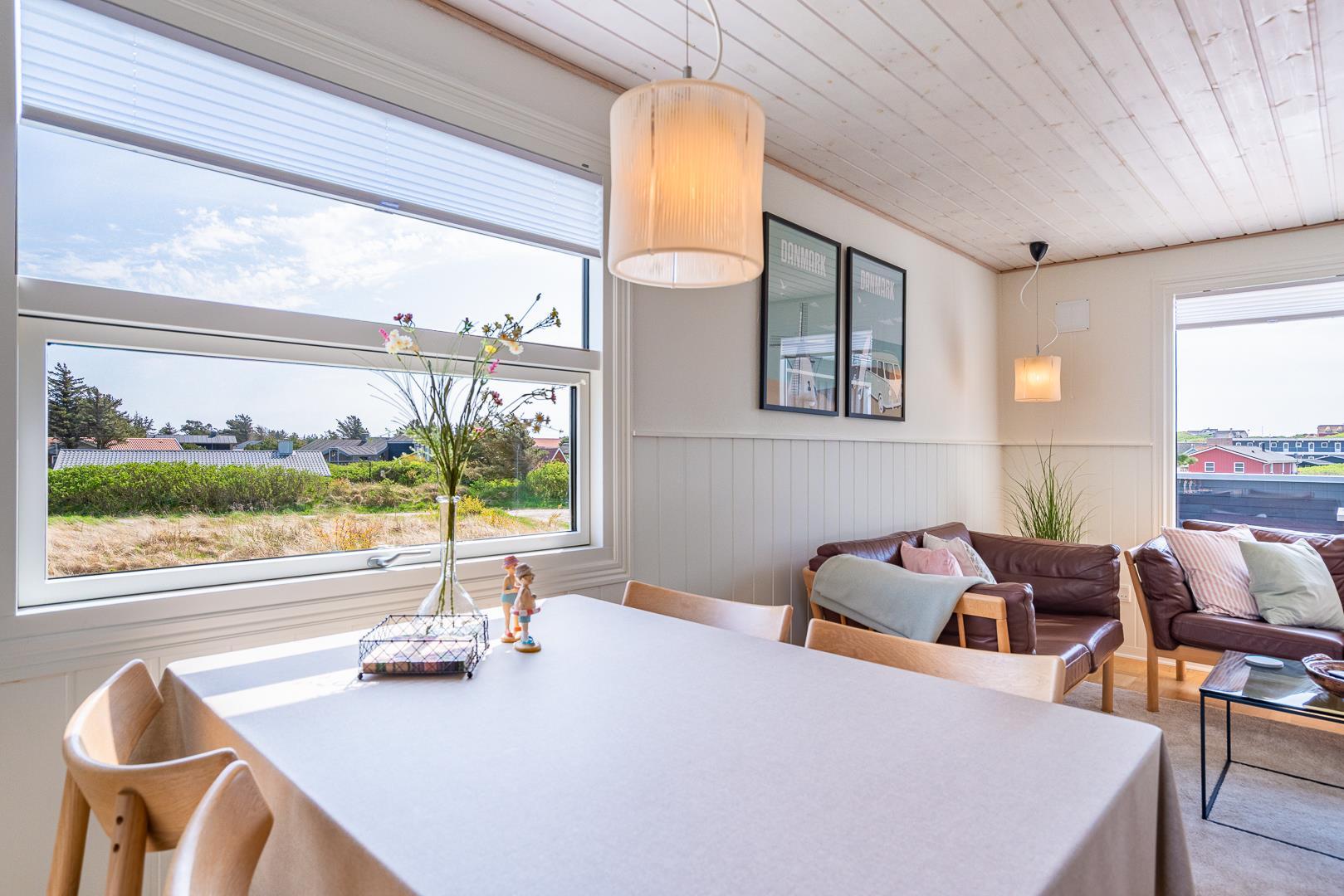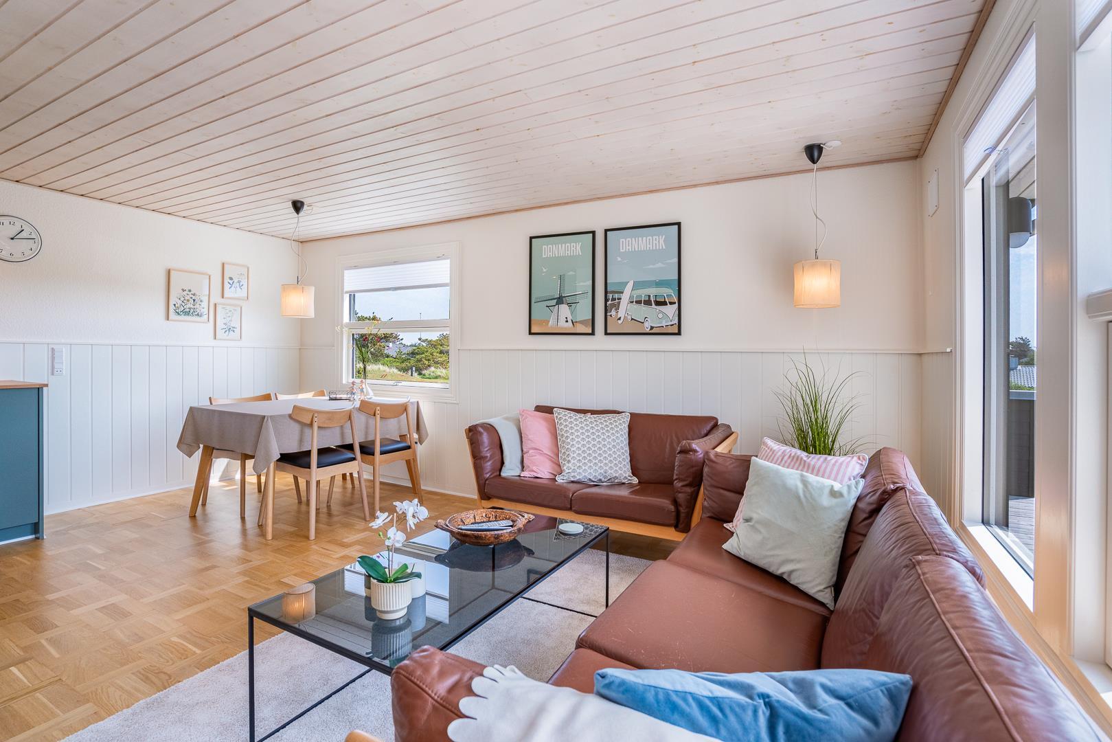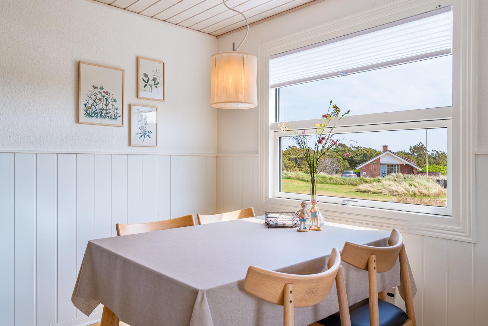 Indenfor er sommerhuset indrettet med fokus på lys, hygge og komfort. Stuen og køkkenet ligger i åben forbindelse og skaber en dejlig rummelig atmosfære. Her er både en spiseplads med udsigt til naturen og en brændeovn, der spreder varme og hygge på kølige aftener. Køkkenet er lyst og veludstyret, perfekt til at tilberede lækre måltider efter en dag ved stranden.