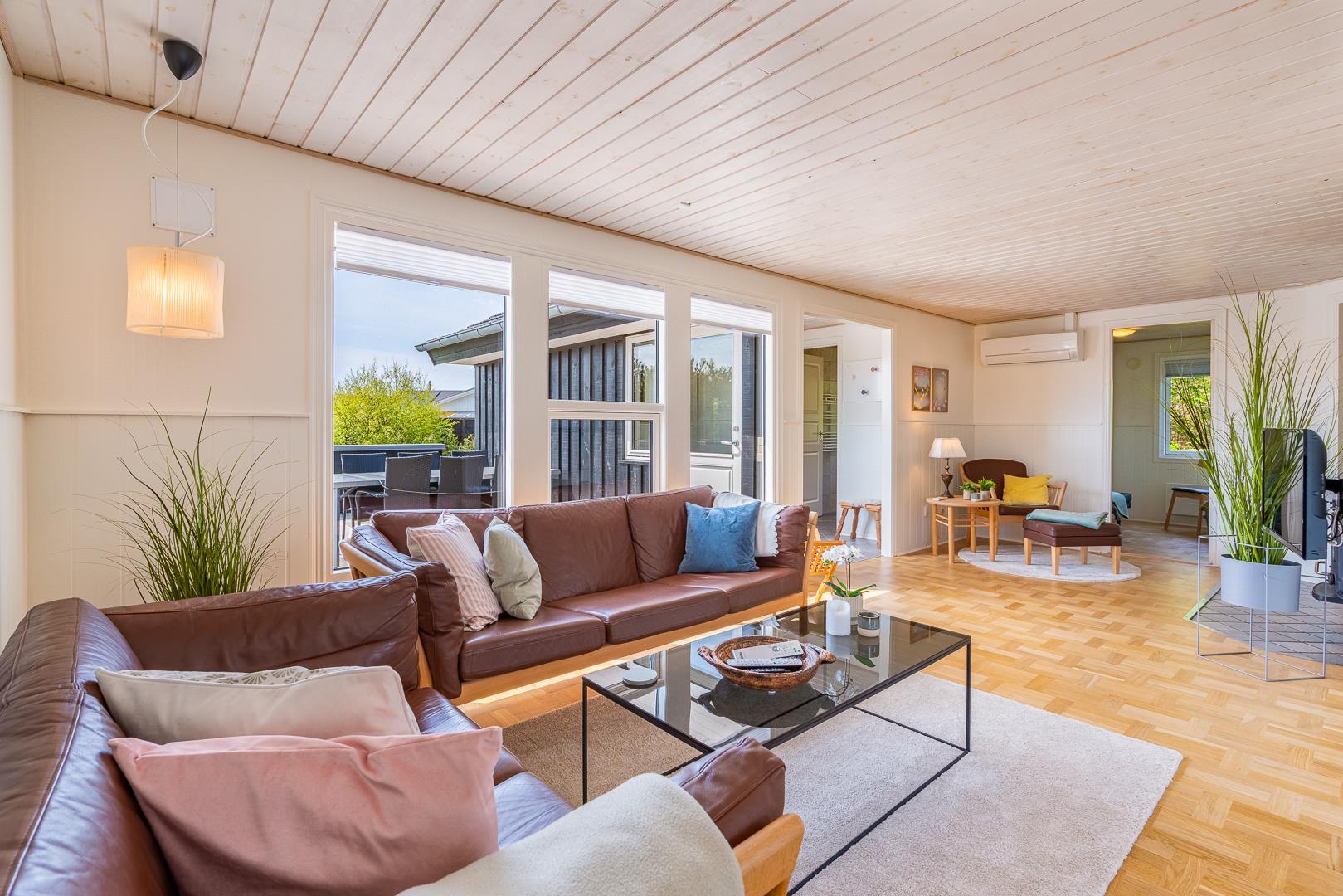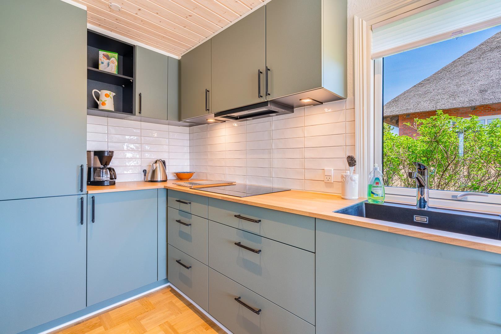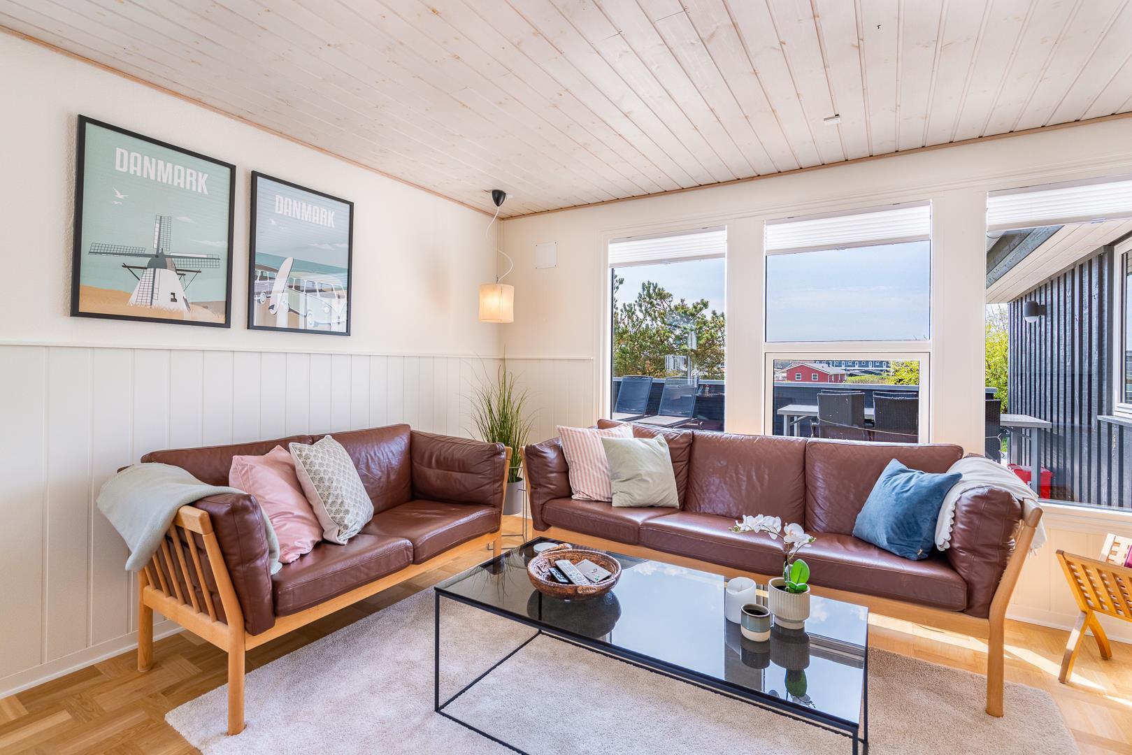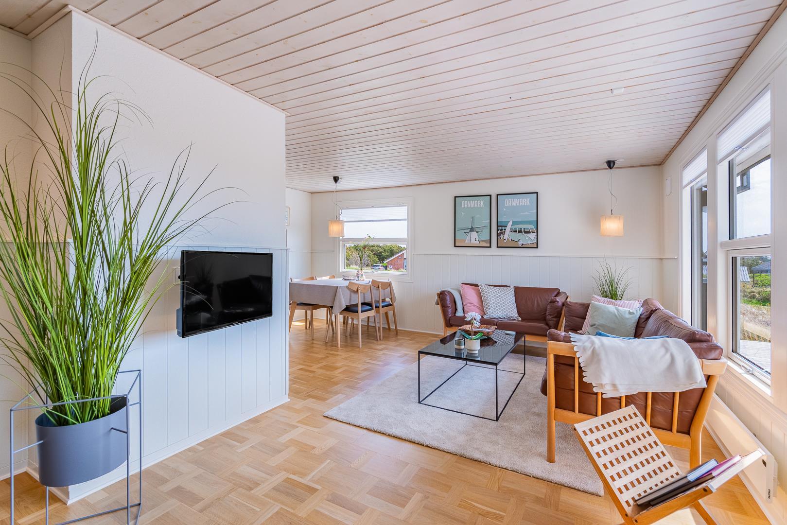 Indenfor er sommerhuset indrettet med fokus på lys, hygge og komfort. Stuen og køkkenet ligger i åben forbindelse og skaber en dejlig rummelig atmosfære. Her er både en spiseplads med udsigt til naturen og en brændeovn, der spreder varme og hygge på kølige aftener. Køkkenet er lyst og veludstyret, perfekt til at tilberede lækre måltider efter en dag ved stranden.
