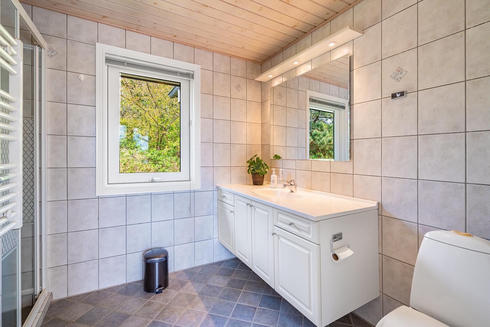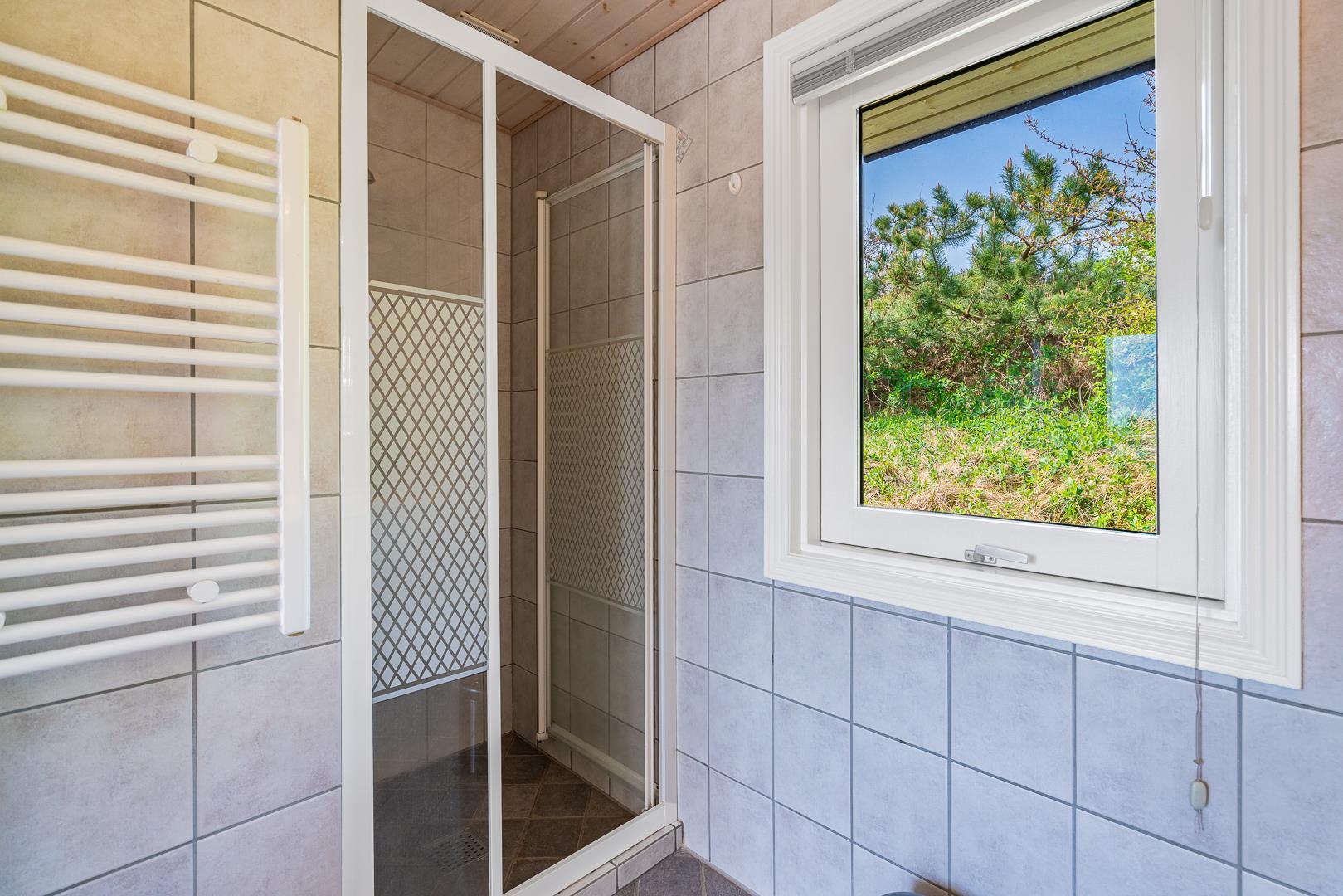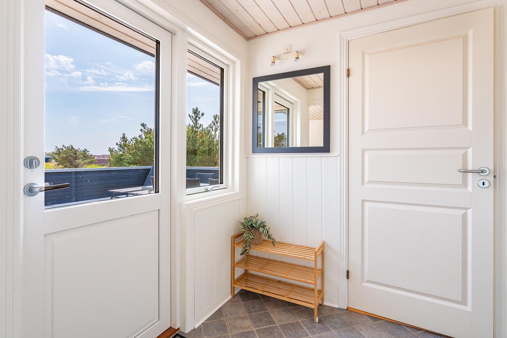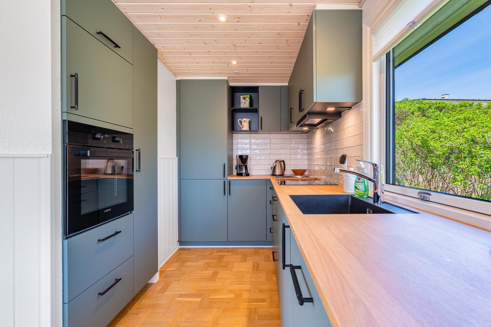 Indenfor er sommerhuset indrettet med fokus på lys, hygge og komfort. Stuen og køkkenet ligger i åben forbindelse og skaber en dejlig rummelig atmosfære. Her er både en spiseplads med udsigt til naturen og en brændeovn, der spreder varme og hygge på kølige aftener. Køkkenet er lyst og veludstyret, perfekt til at tilberede lækre måltider efter en dag ved stranden.