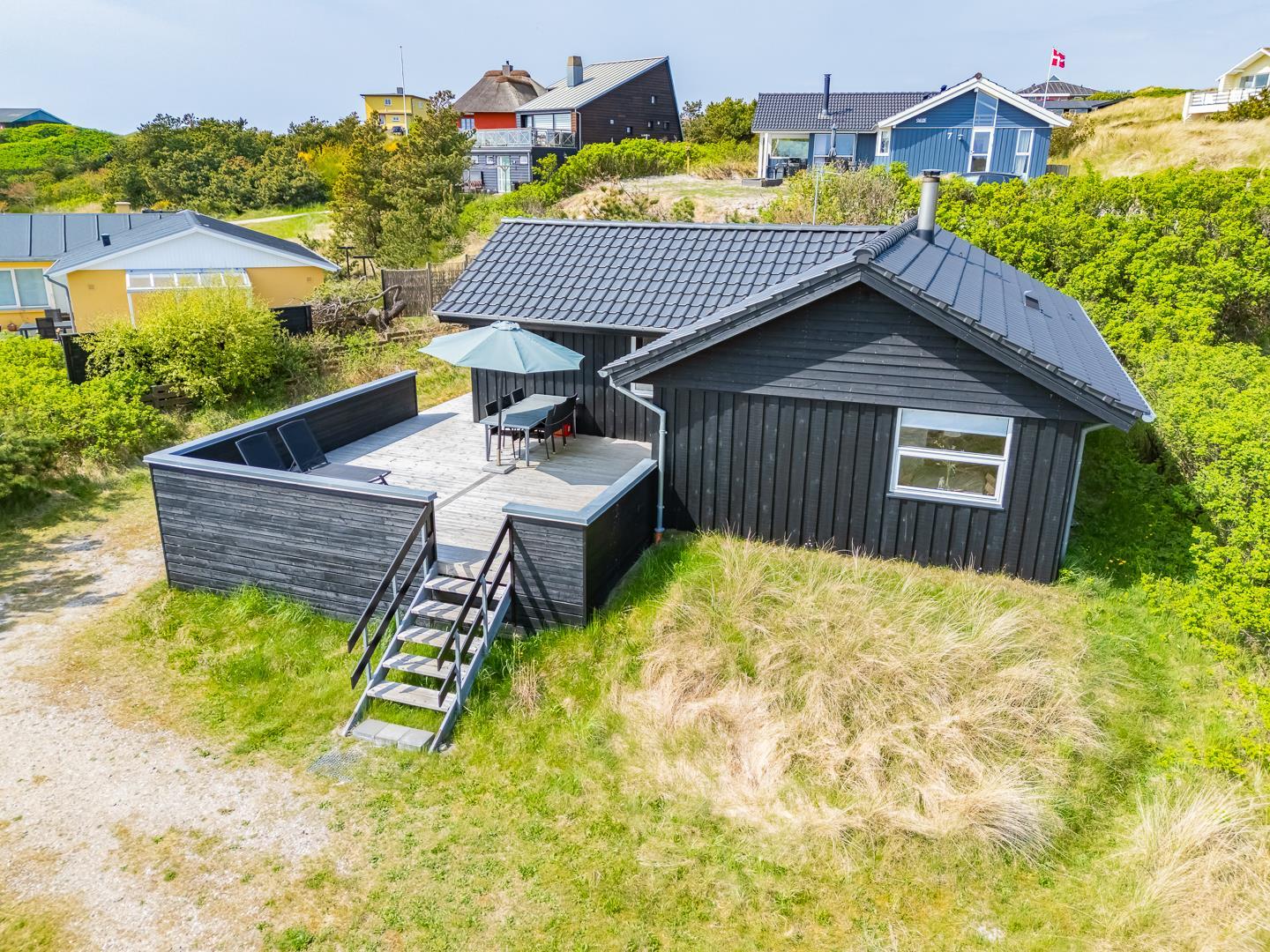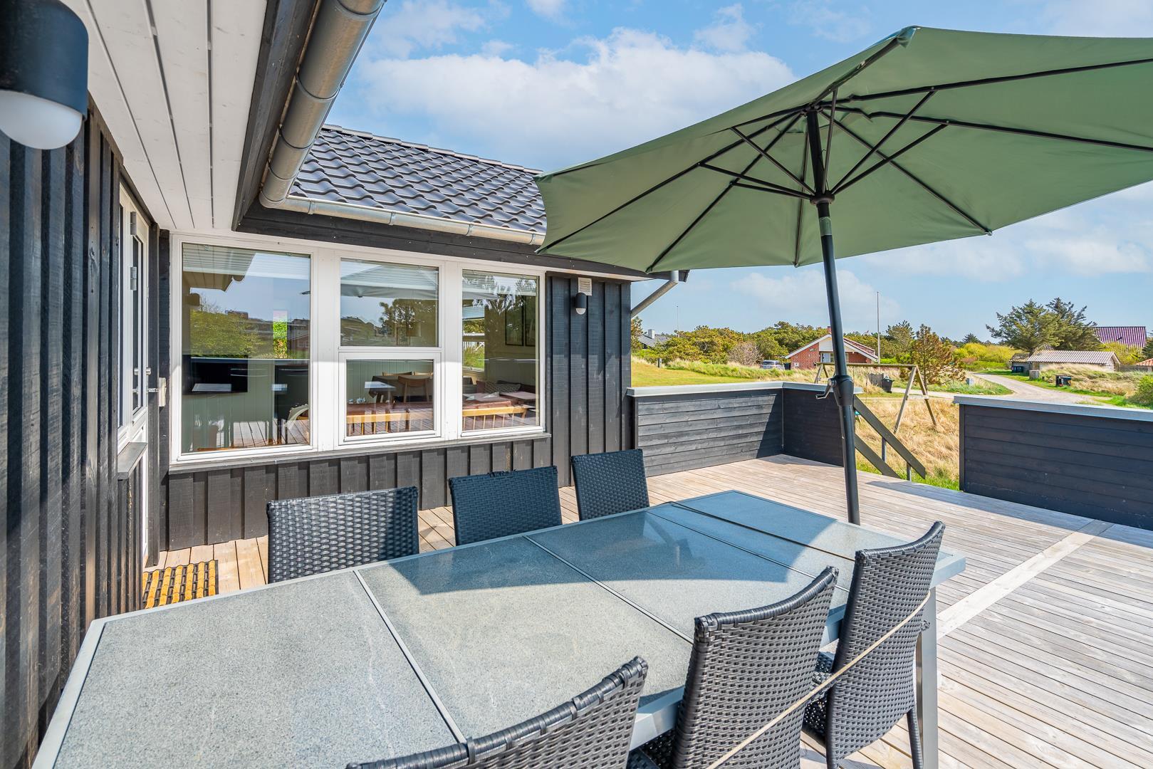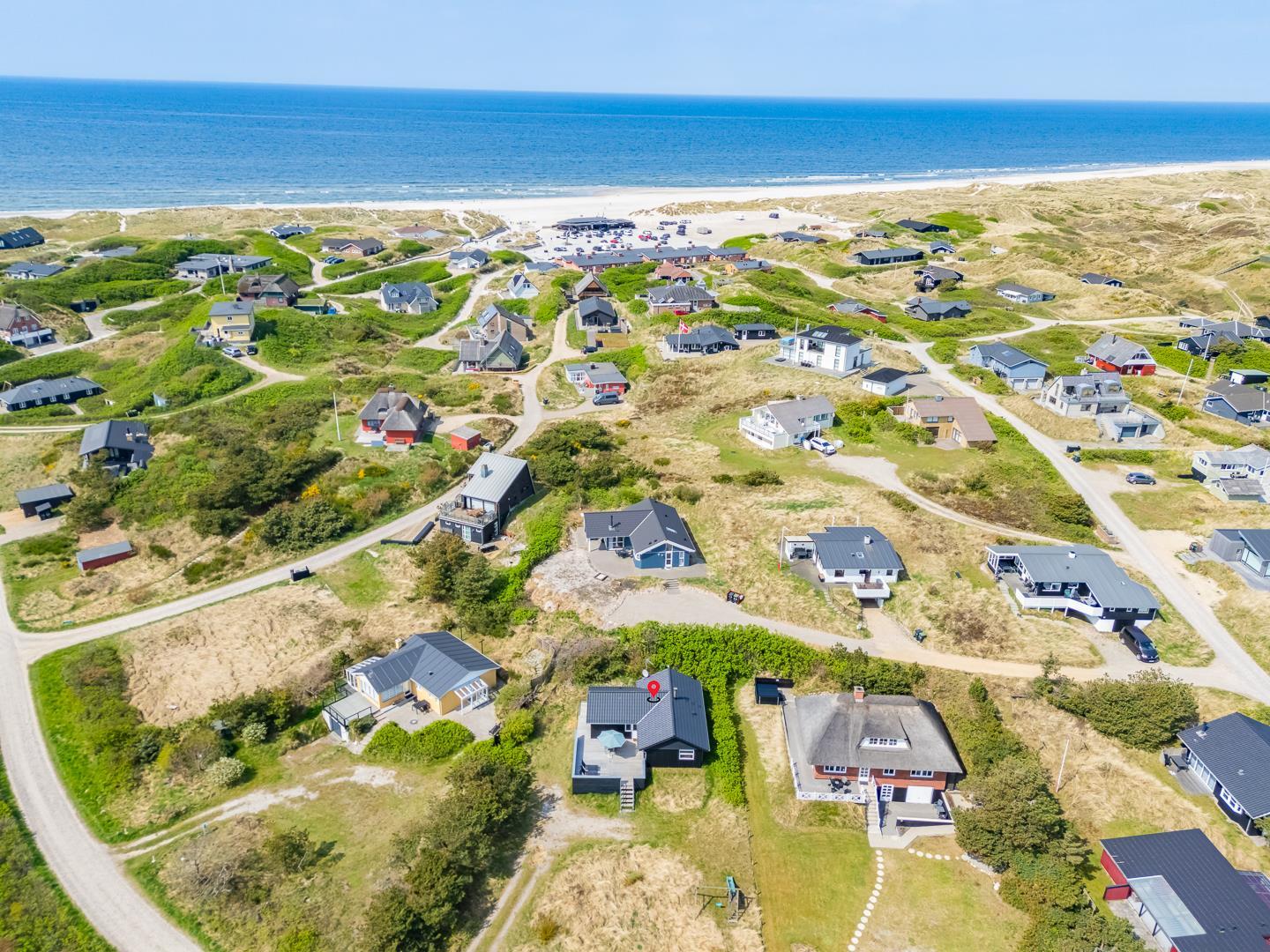 Med en fantastisk beliggenhed i det naturskønne Henne Strand ligger dette hyggelige, sorte træsommerhus, omgivet af en stor træterrasse, der næsten omslutter hele sommerhuset. Her kan I nyde udsigten over klitterne og den vilde marhalm, mens I lader jer forføre af den friske havluft og lyden af Vesterhavet, som ligger blot en kort gåtur væk.