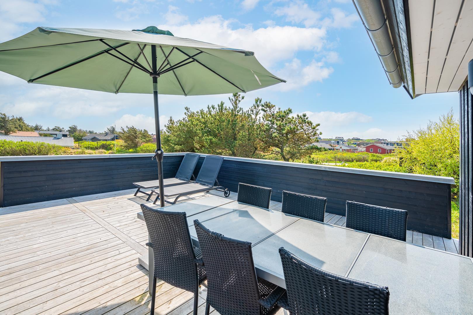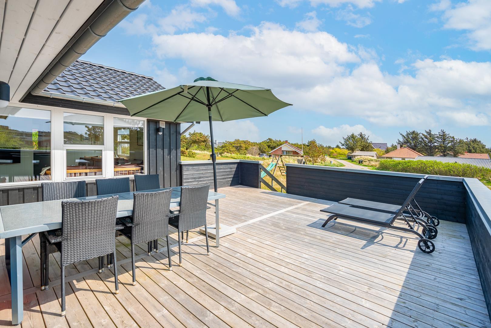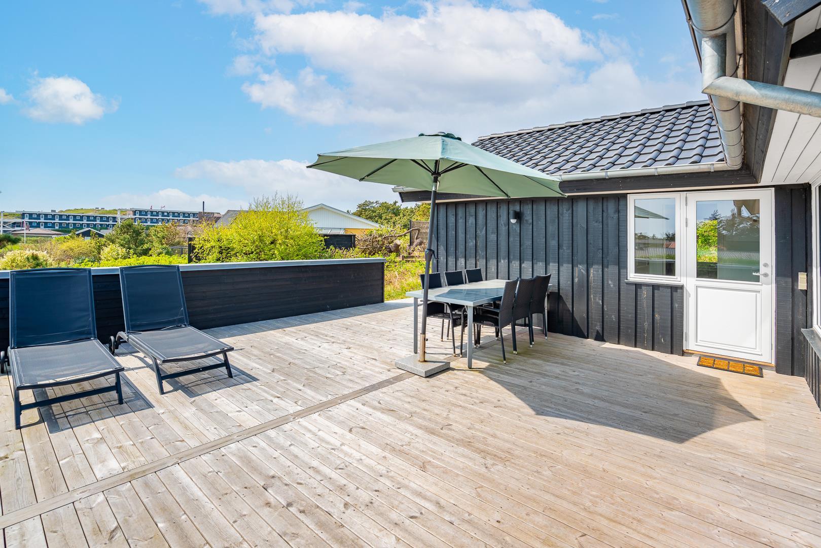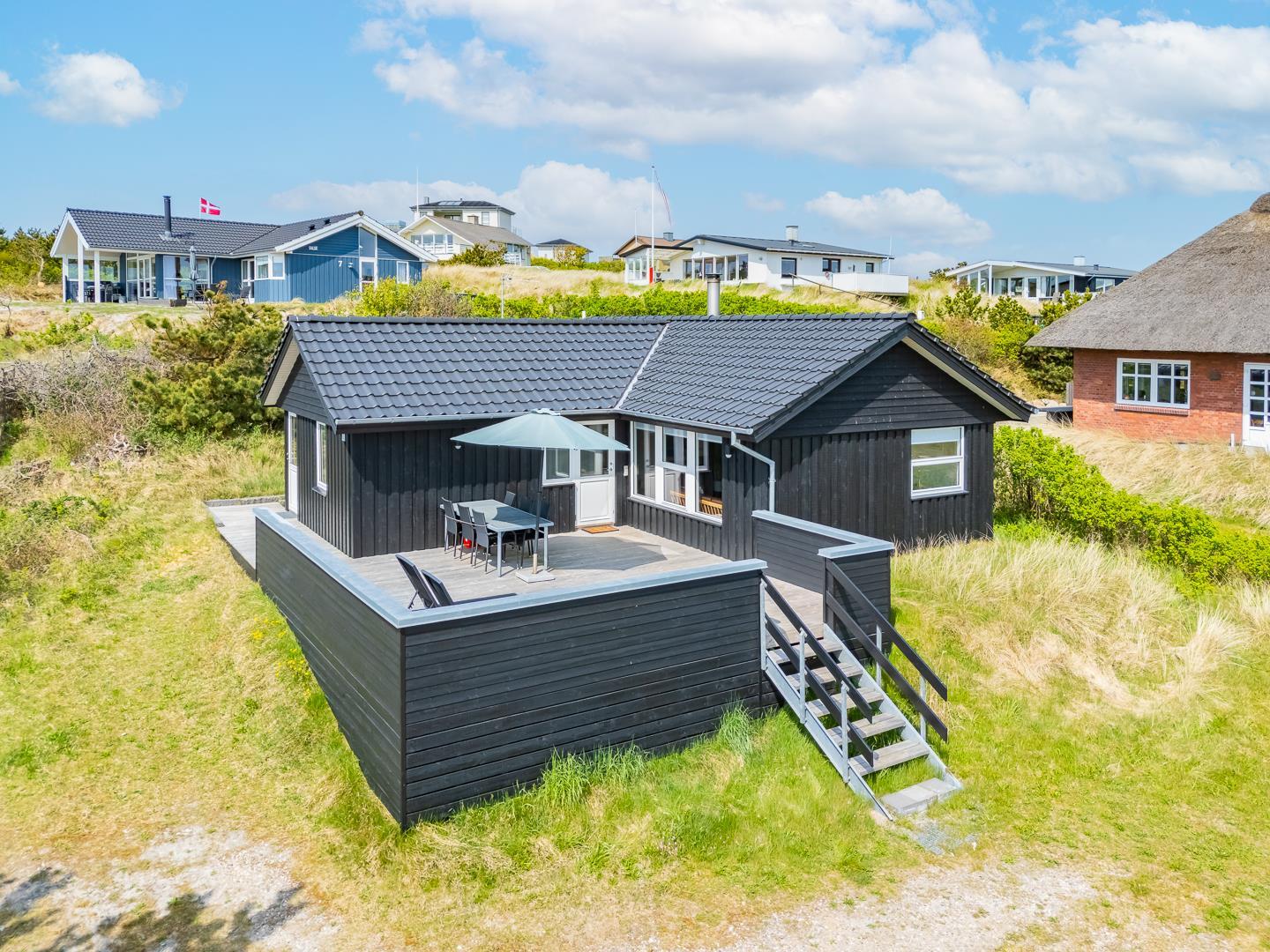 Med en fantastisk beliggenhed i det naturskønne Henne Strand ligger dette hyggelige, sorte træsommerhus, omgivet af en stor træterrasse, der næsten omslutter hele sommerhuset. Her kan I nyde udsigten over klitterne og den vilde marhalm, mens I lader jer forføre af den friske havluft og lyden af Vesterhavet, som ligger blot en kort gåtur væk.