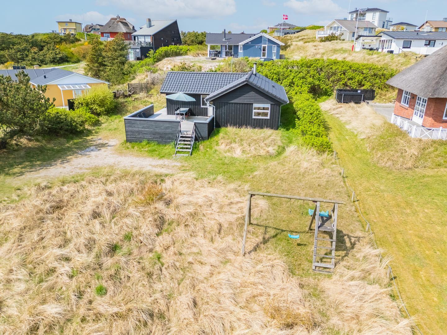For de mindste feriegæster er der også et sjovt legestativ med både gynge og rutsjebane, som gør ferien endnu mere spændende. Dette skønne sommerhus er den perfekte base for jer, der søger ro tæt på naturen og samtidig vil have byens caféer, butikker og sommerstemning lige i nærheden i Henne Strand.