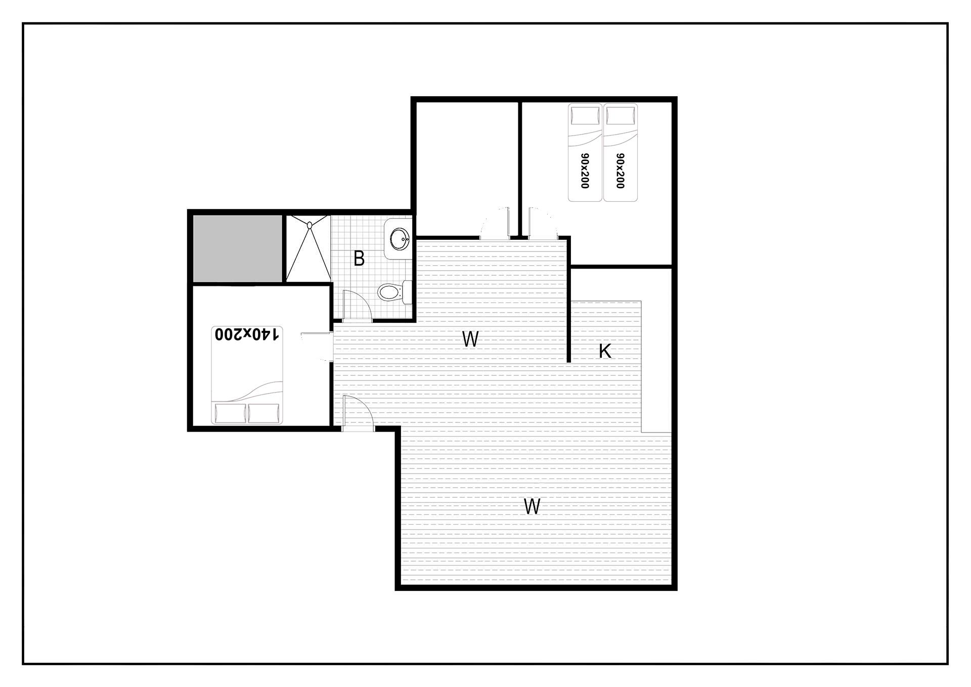 Sengestørrelse: 1 dobbeltseng med 2 madrasser 90 x 200 cm + 1 dobbeltseng 140 x 200 cm + 1 daybed 80 x 200 cm
