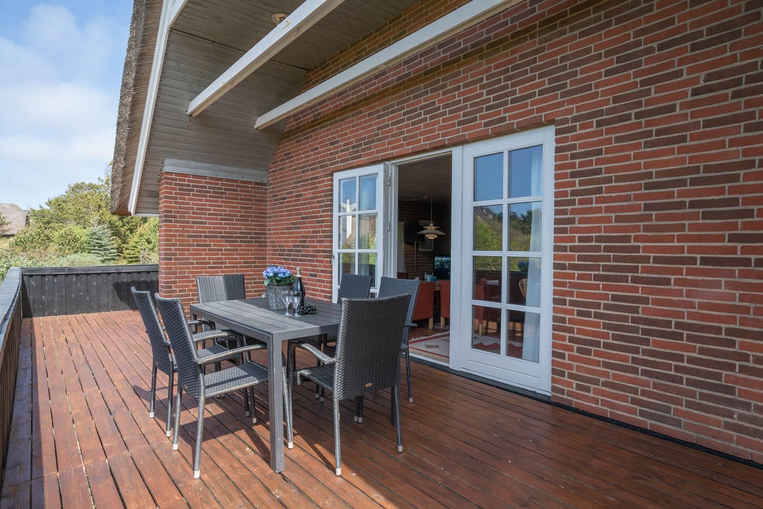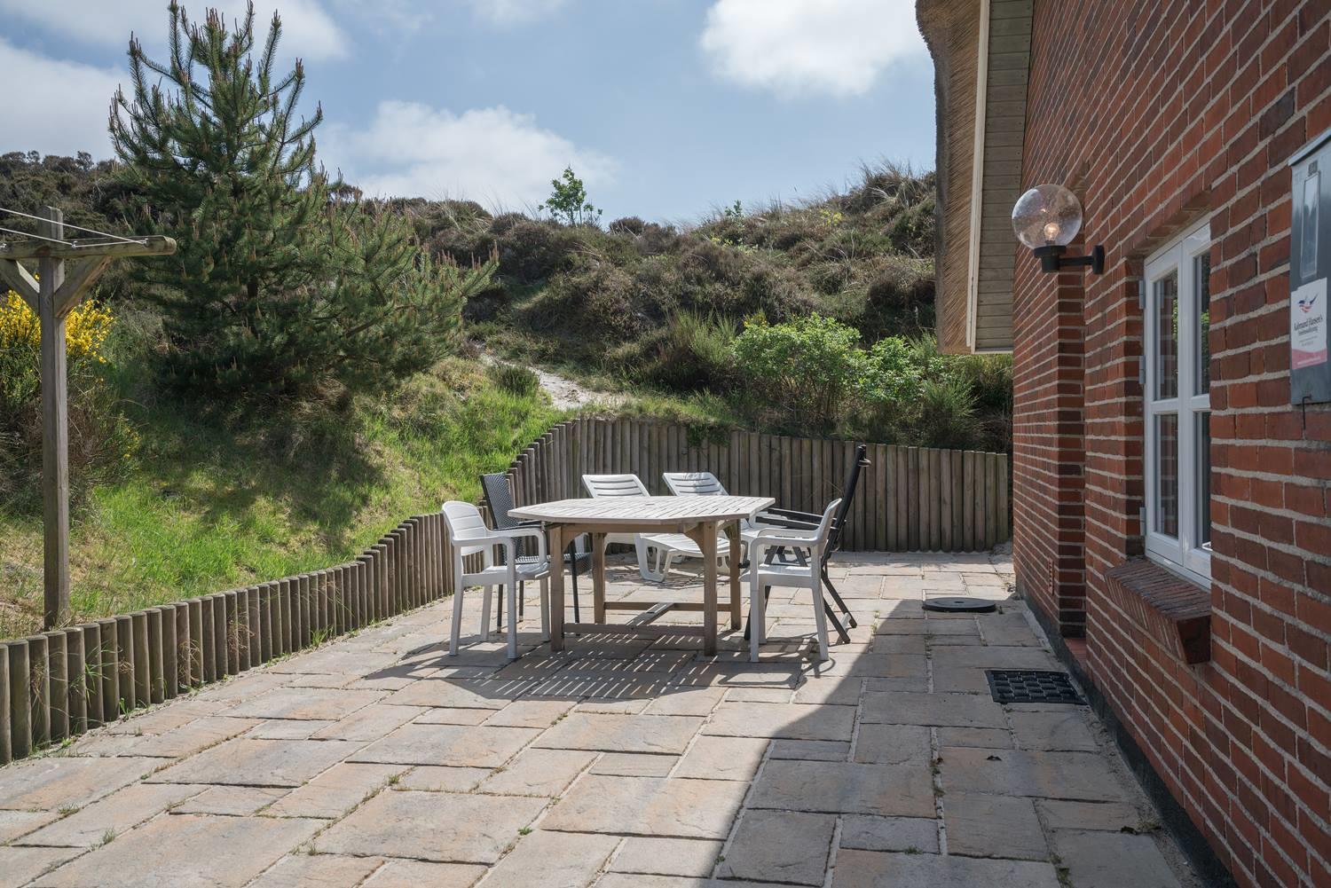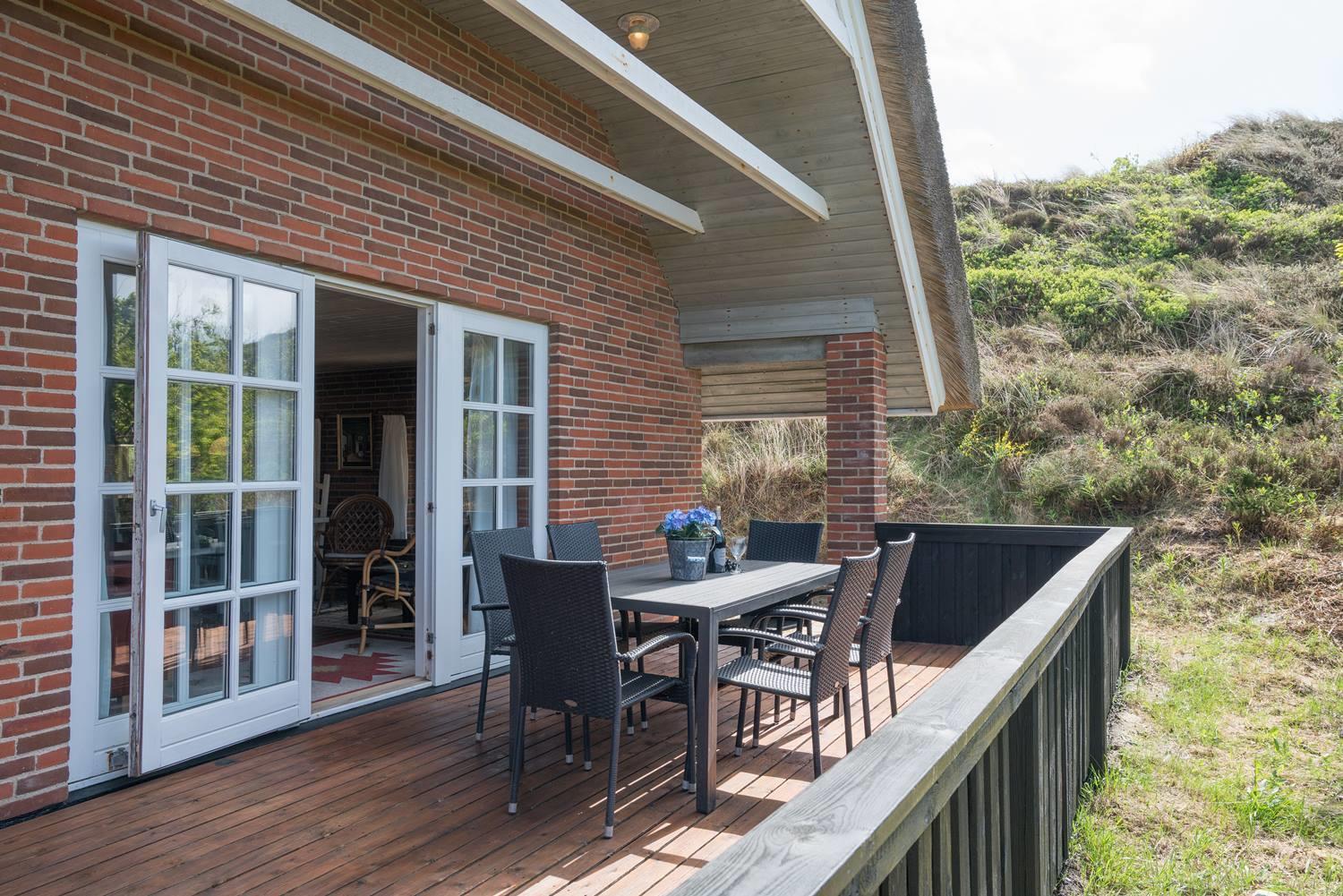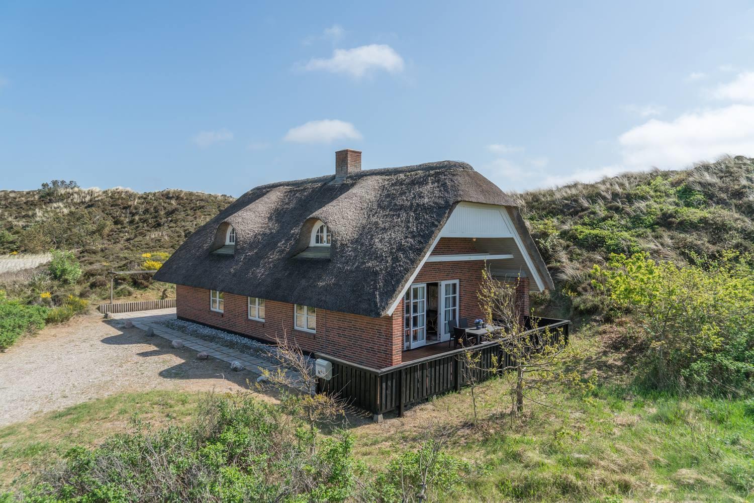På en skøn, kuperet klitgrund i roligt feriehus område, ligger dette flotte og stråtækte feriehus. Køkkenet er i åben forbindelse med den hyggelige stue som er indrettet med gode lædermøbler. Der er klinkegulve i hele huset. Flere skønne og læ fulde terrasser. Der er klinkegulve i hele feriehuset. Fra køkken/alrummet er der direkte udgang til dejlig stor lukket og ugenert træterrasse.