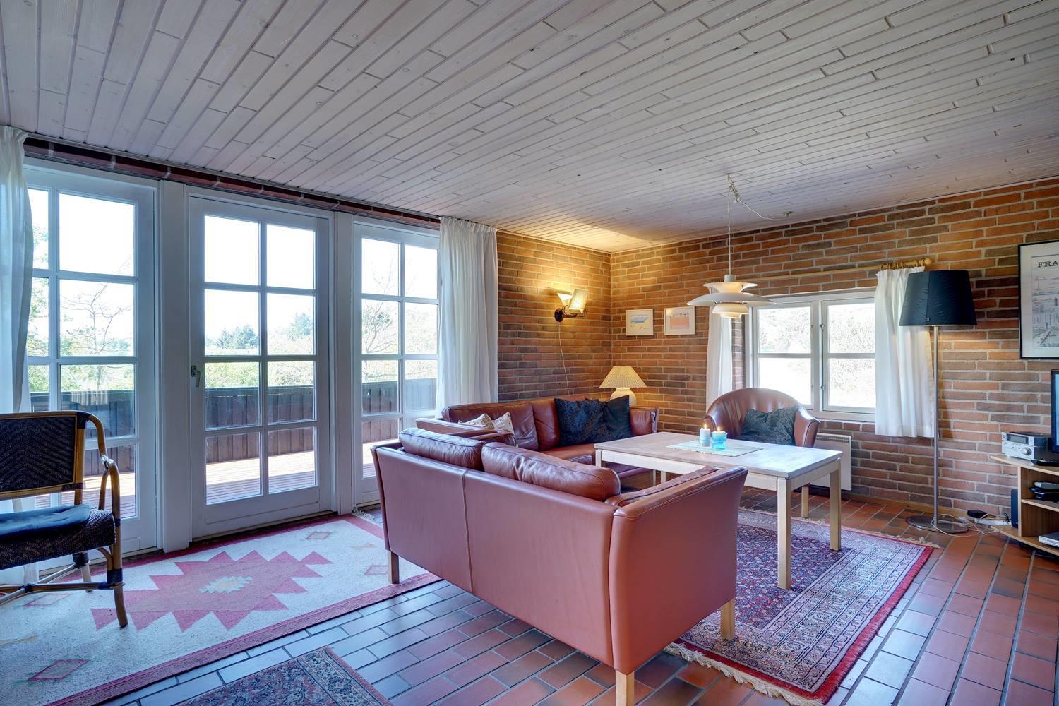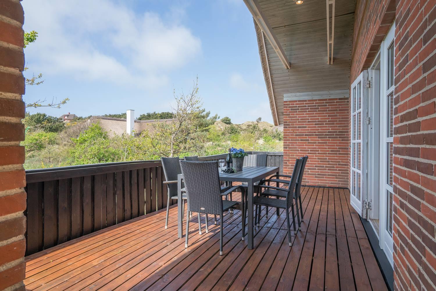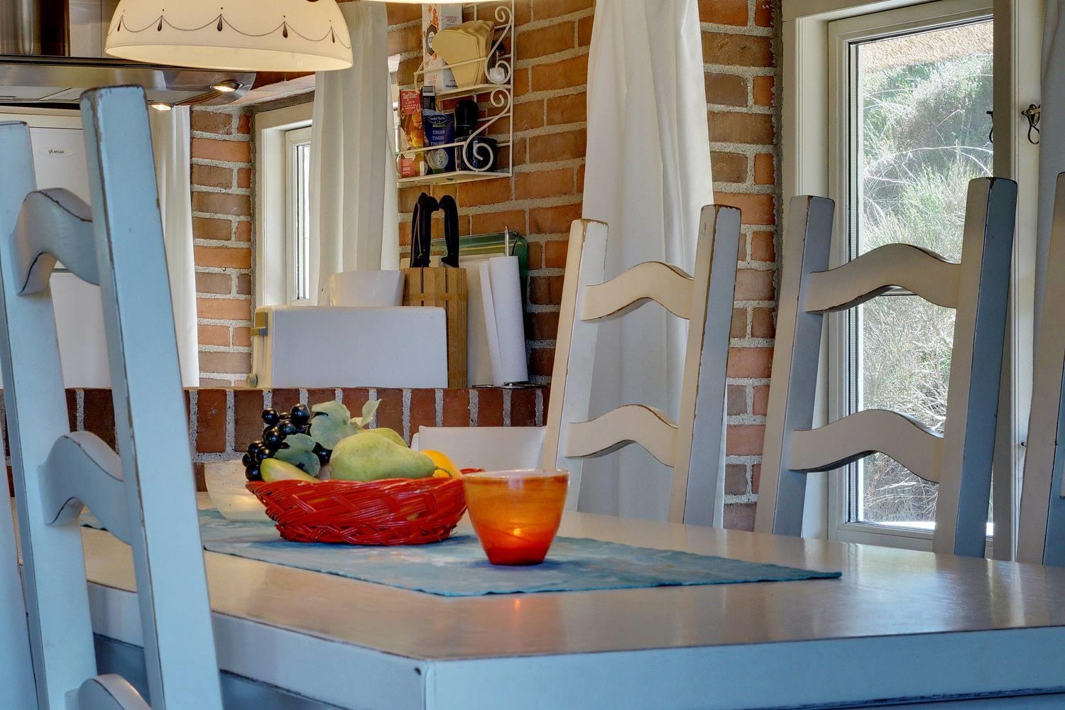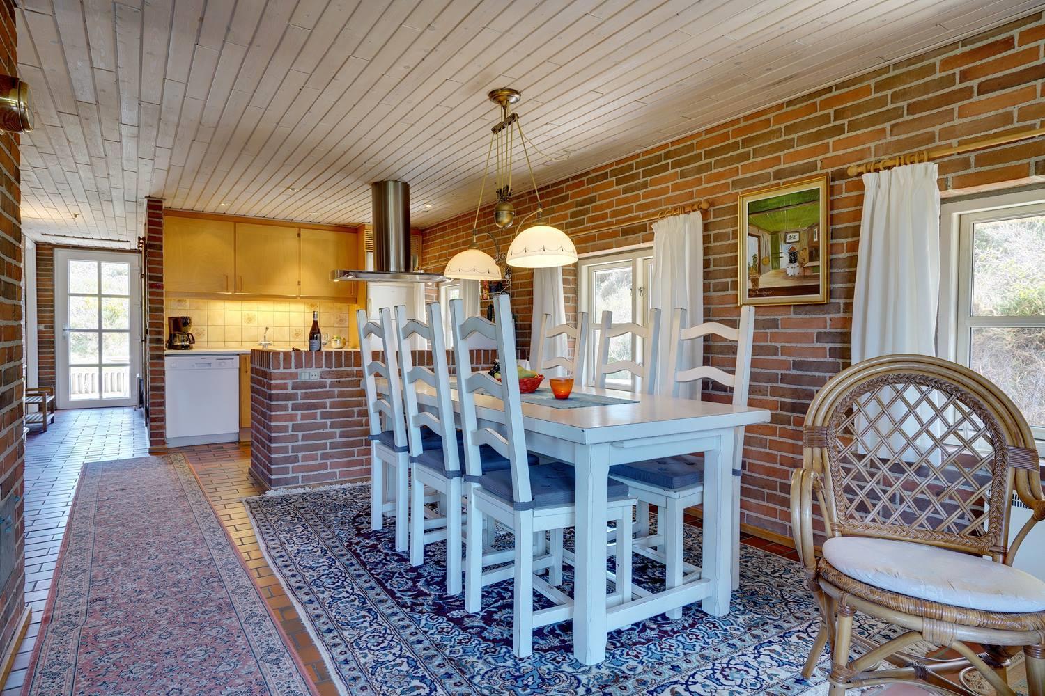 På en skøn, kuperet klitgrund i roligt feriehus område, ligger dette flotte og stråtækte feriehus. Køkkenet er i åben forbindelse med den hyggelige stue som er indrettet med gode lædermøbler. Der er klinkegulve i hele huset. Flere skønne og læ fulde terrasser. Der er klinkegulve i hele feriehuset. Fra køkken/alrummet er der direkte udgang til dejlig stor lukket og ugenert træterrasse.
