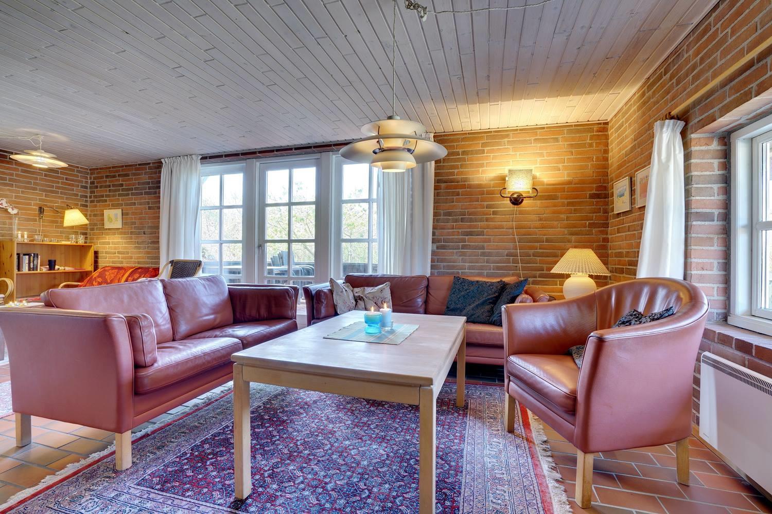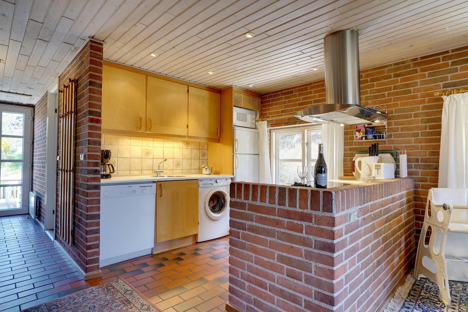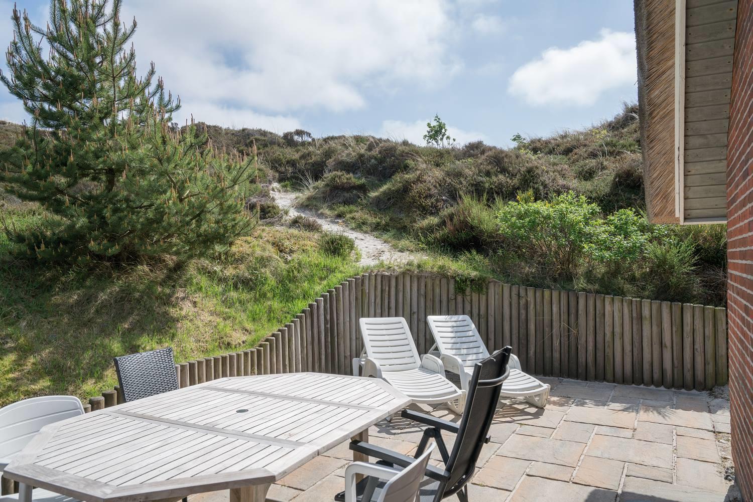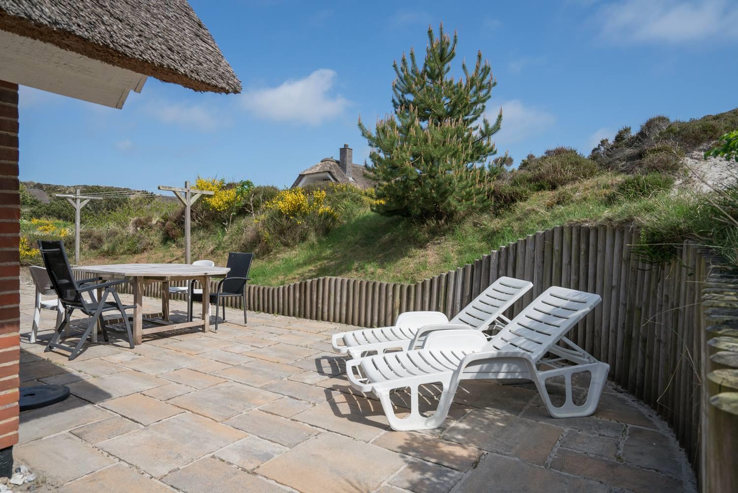 På en skøn, kuperet klitgrund i roligt feriehus område, ligger dette flotte og stråtækte feriehus. Køkkenet er i åben forbindelse med den hyggelige stue som er indrettet med gode lædermøbler. Der er klinkegulve i hele huset. Flere skønne og læ fulde terrasser. Der er klinkegulve i hele feriehuset. Fra køkken/alrummet er der direkte udgang til dejlig stor lukket og ugenert træterrasse.