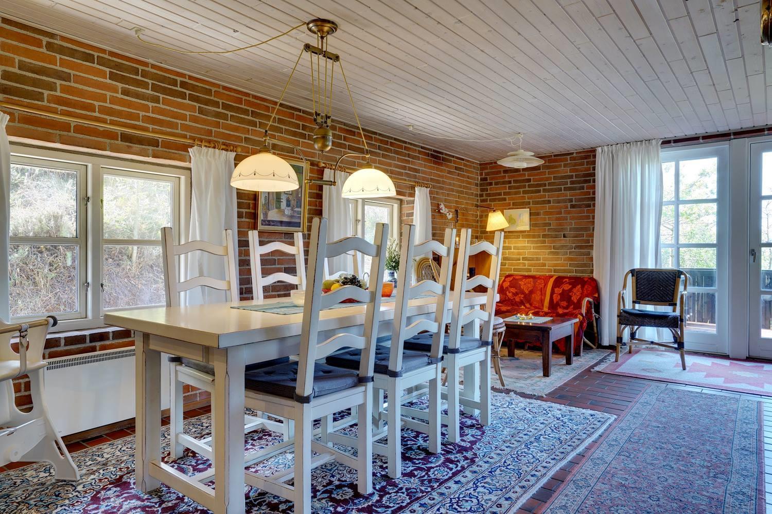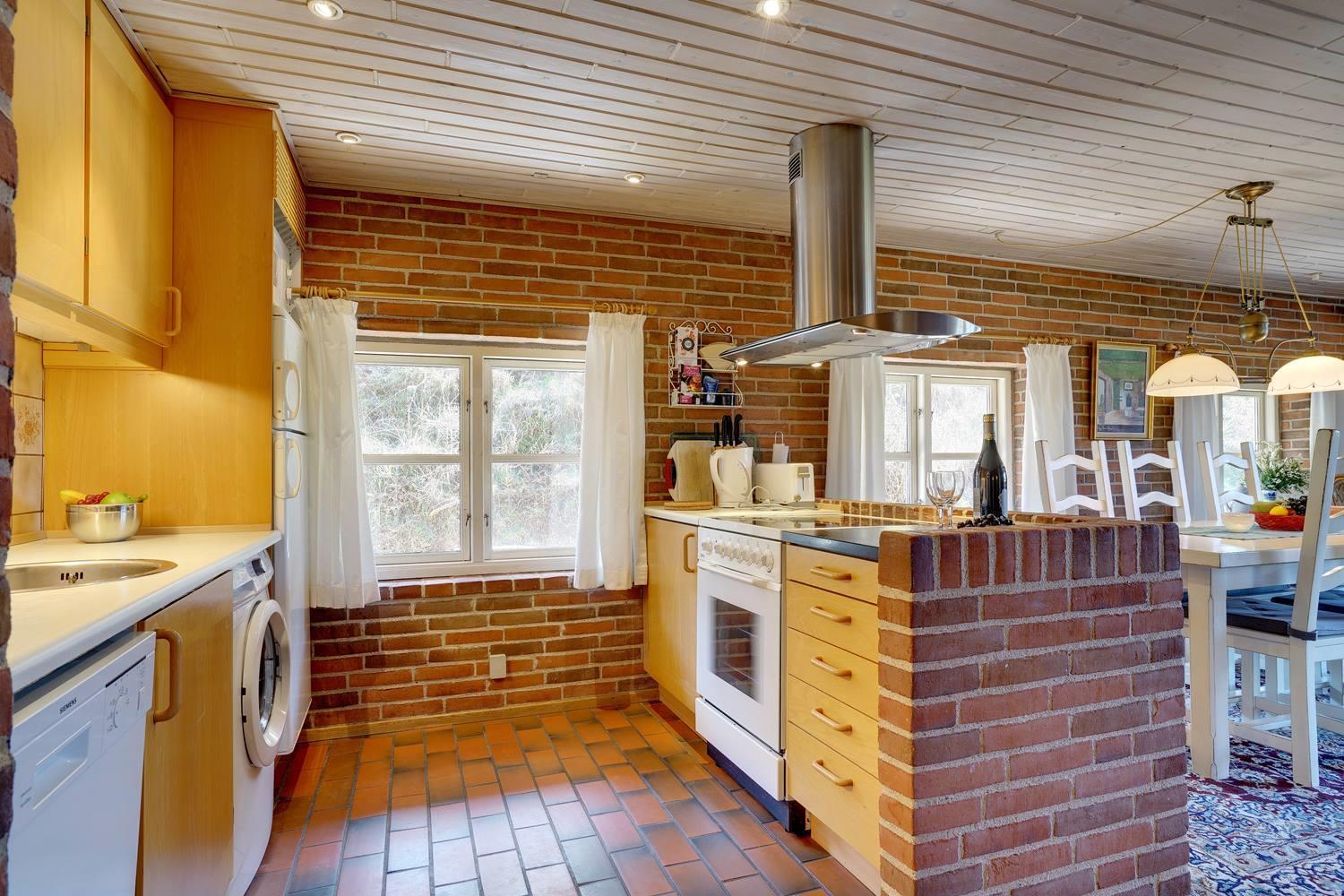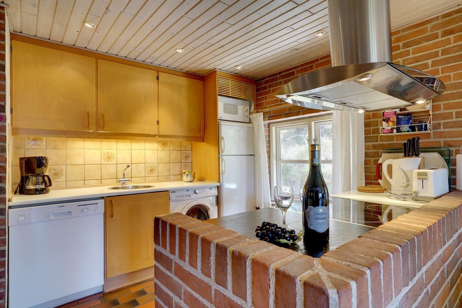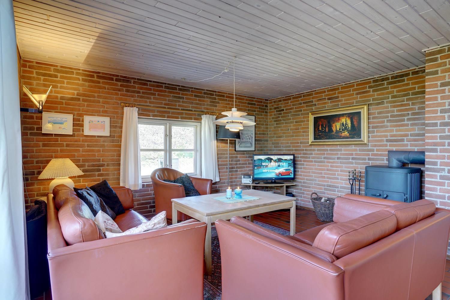 På en skøn, kuperet klitgrund i roligt feriehus område, ligger dette flotte og stråtækte feriehus. Køkkenet er i åben forbindelse med den hyggelige stue som er indrettet med gode lædermøbler. Der er klinkegulve i hele huset. Flere skønne og læ fulde terrasser. Der er klinkegulve i hele feriehuset. Fra køkken/alrummet er der direkte udgang til dejlig stor lukket og ugenert træterrasse.