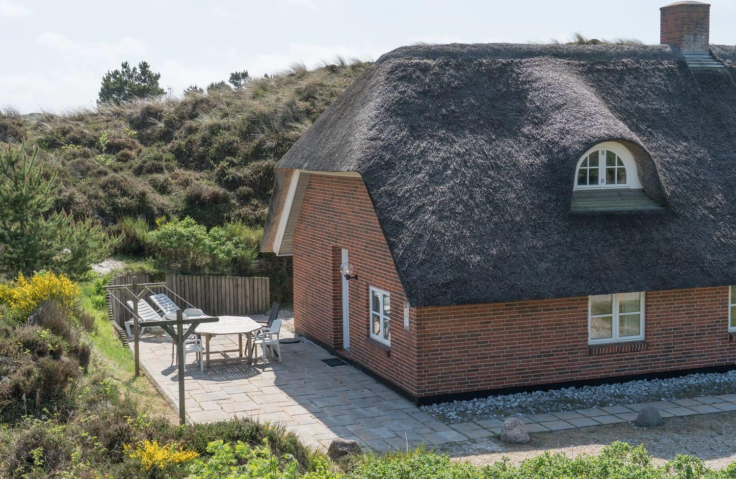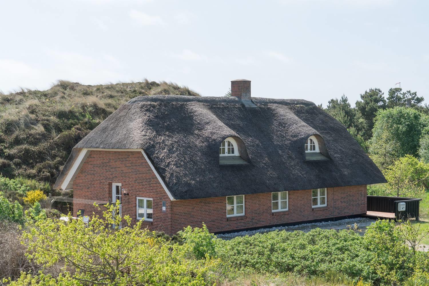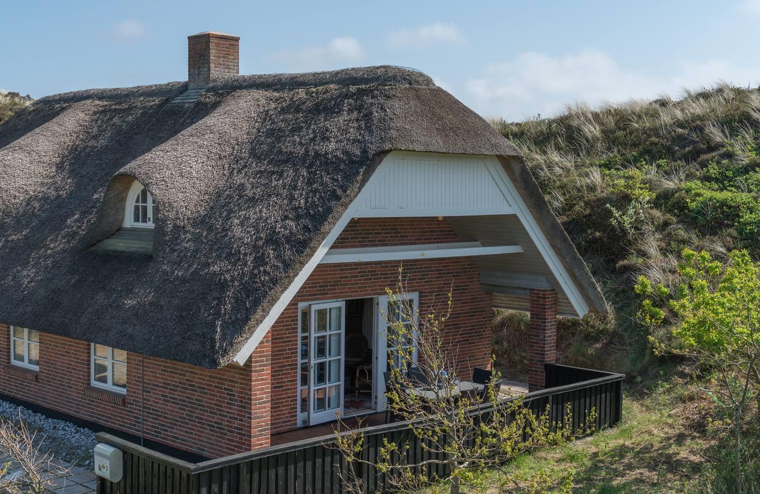 Flot stråtækt feriehus i rolige klitter tæt på Henne Strand med sauna og stor lukket terrasse.