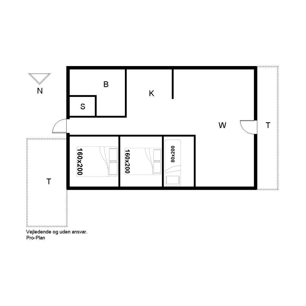 Sengestørrelser: 2 dobbeltsenge 160 x 200 cm + 1 enkeltseng 80 x 200 cm.