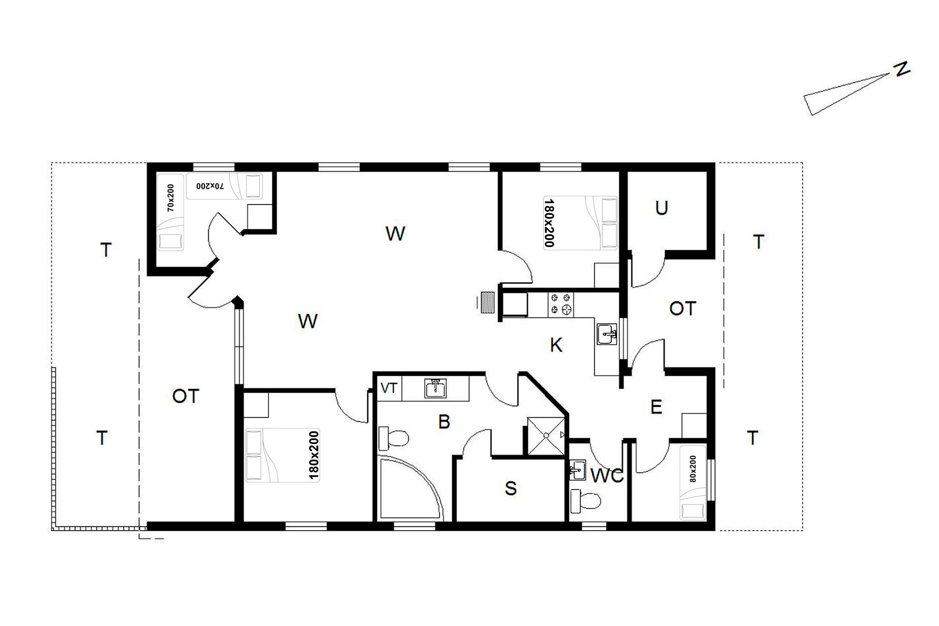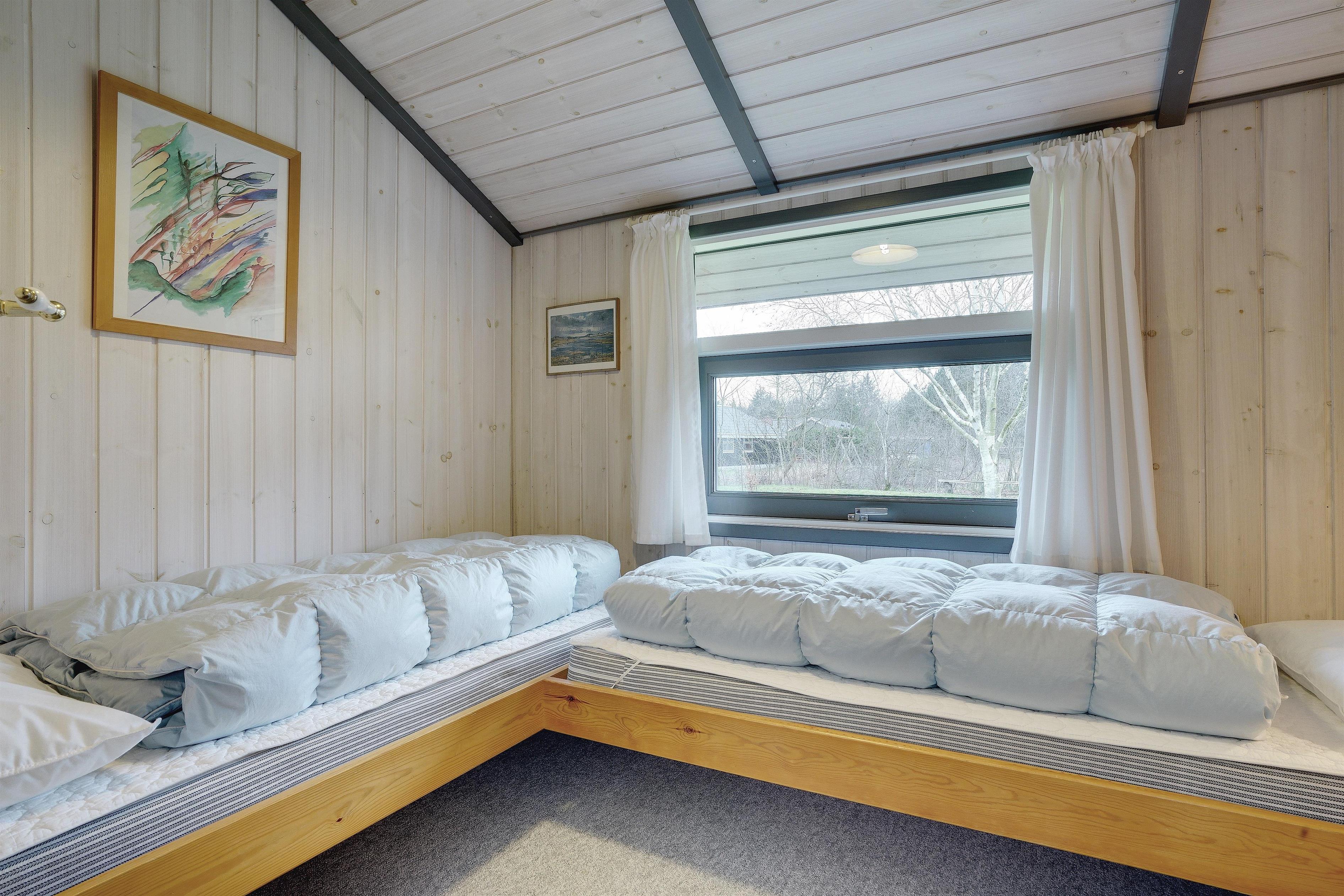 Sengestørrelse: 2 dobbeltsenge 180 x 200 cm + 1 enkeltseng 80 x 200 cm + 2 enkeltsenge 70 x 200 cm.