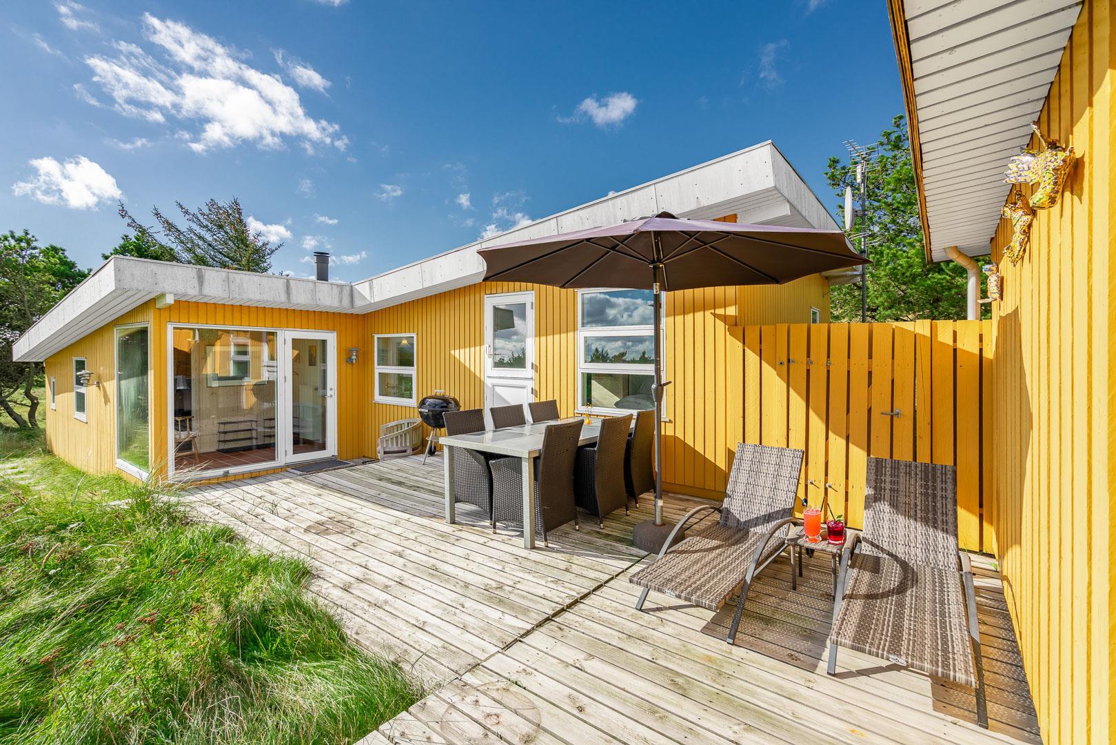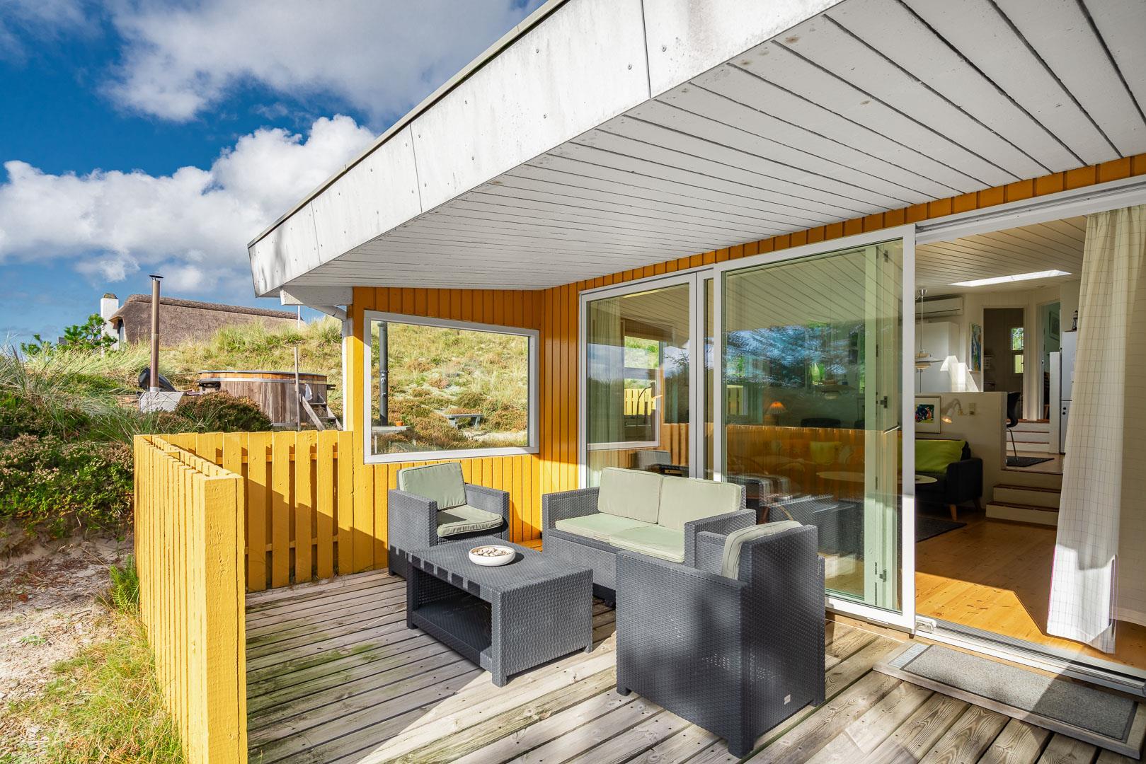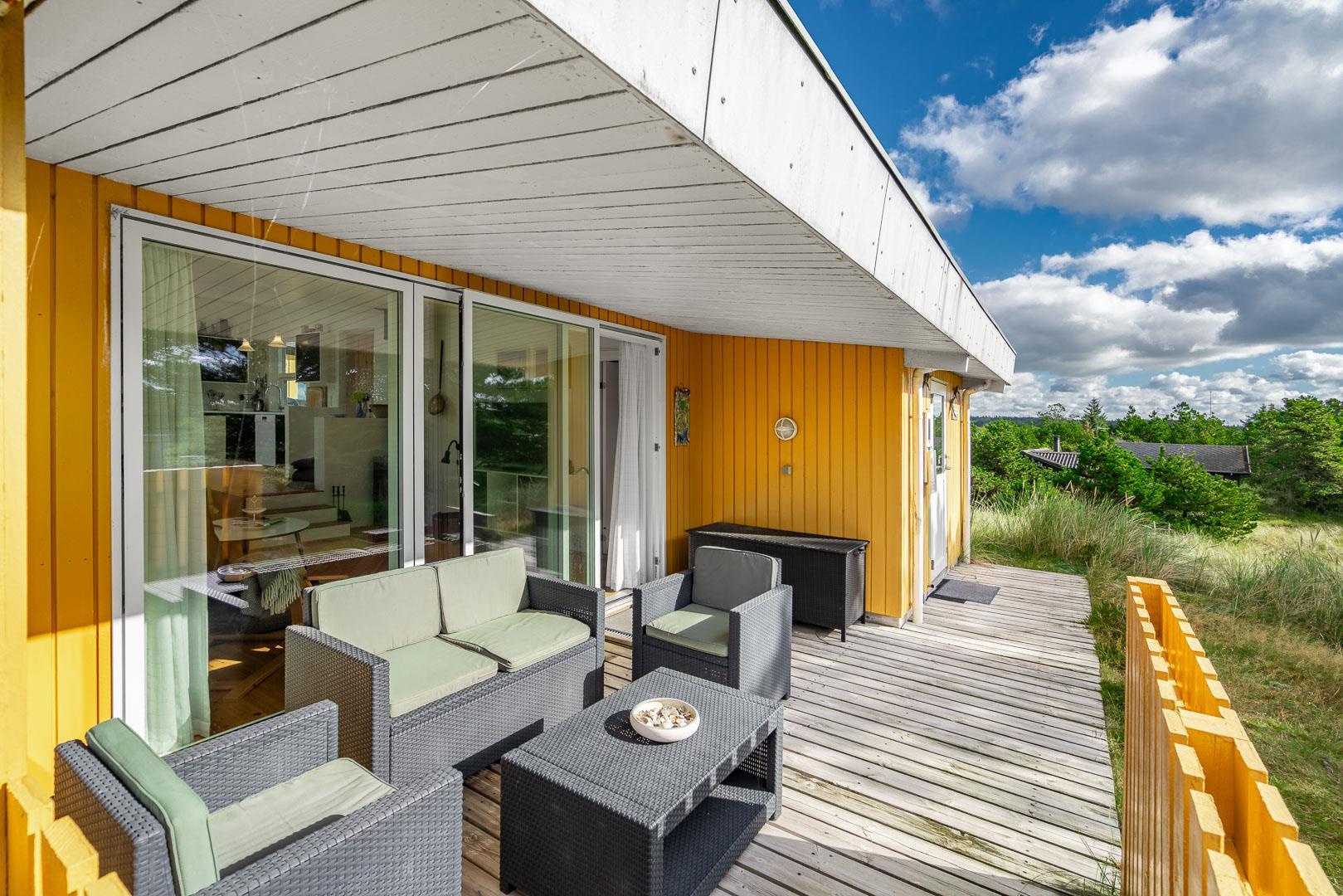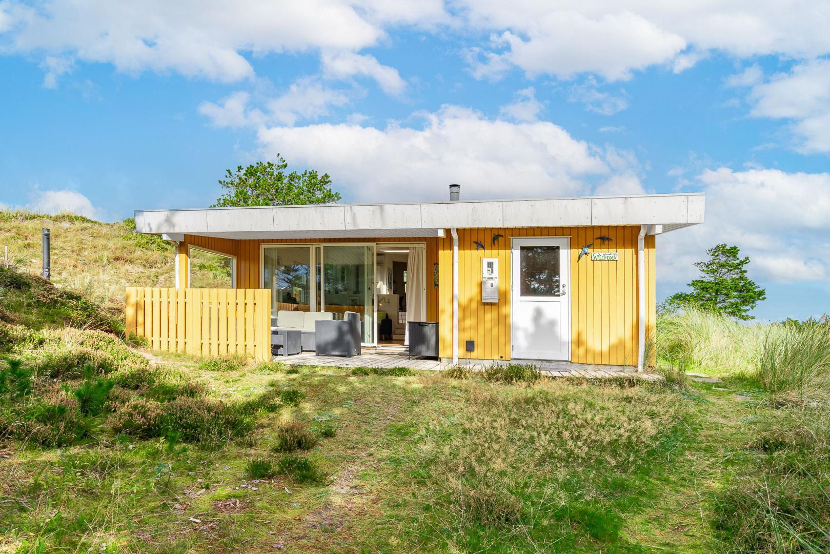 Naturskønt beliggende i hjertet af Henne Strand finder du dette indbydende sommerhus til 6 personer, kun 700 meter fra den smukke Vesterhavskyst. Sommerhuset er stilfuldt indrettet med friske farver og en hyggelig atmosfære. De forskellige niveauer i sommerhuset skaber en spændende og charmerende dynamik – blandt andet med tre trin, der leder dig fra det fine køkken og spisestue ned til en hyggelig stue. Her kan du nyde varmen fra brændeovnen, læse en god bog eller blot slappe af med udsigten til den omkringliggende natur. Fra stuen er der direkte udgang til en af de dejlige terrasser, der indbyder til afslapning i solens stråler.