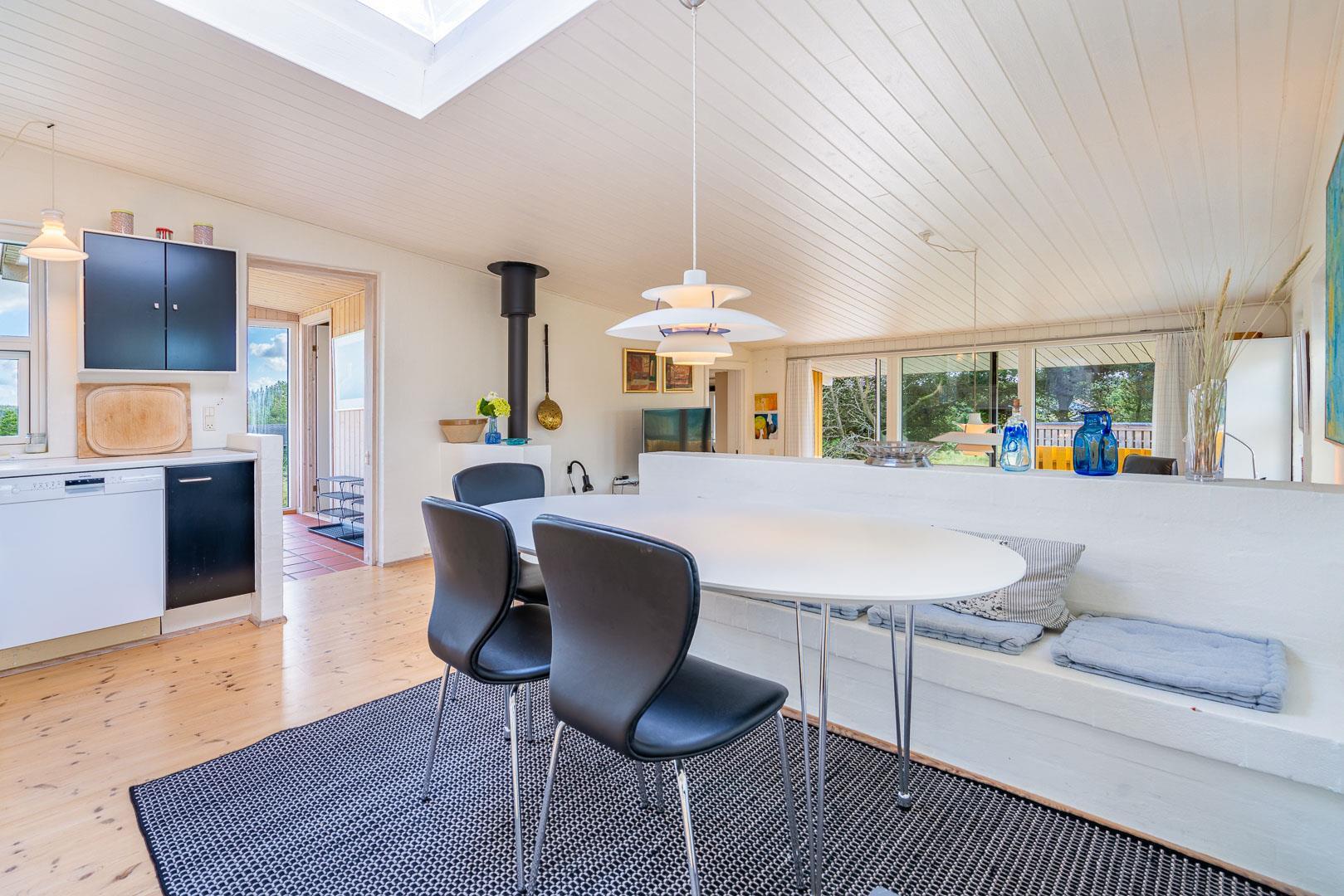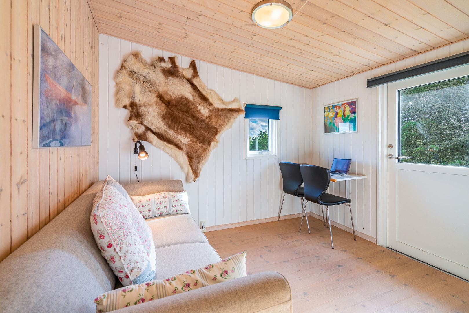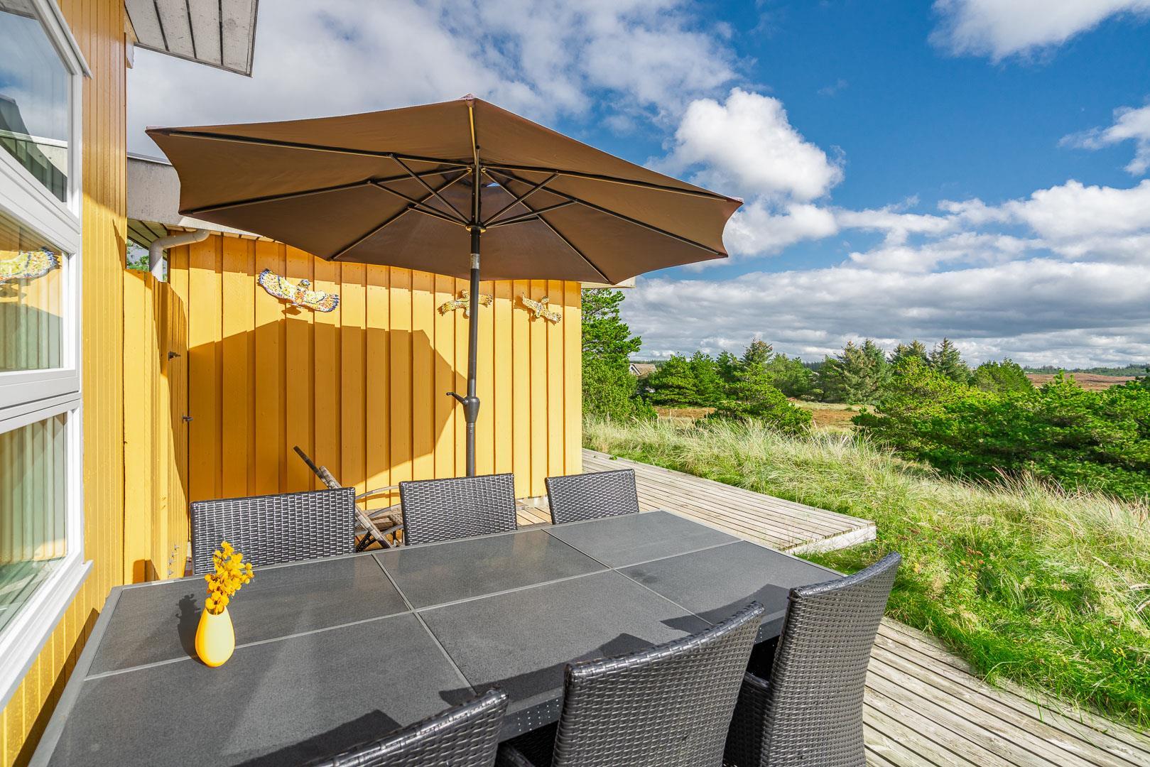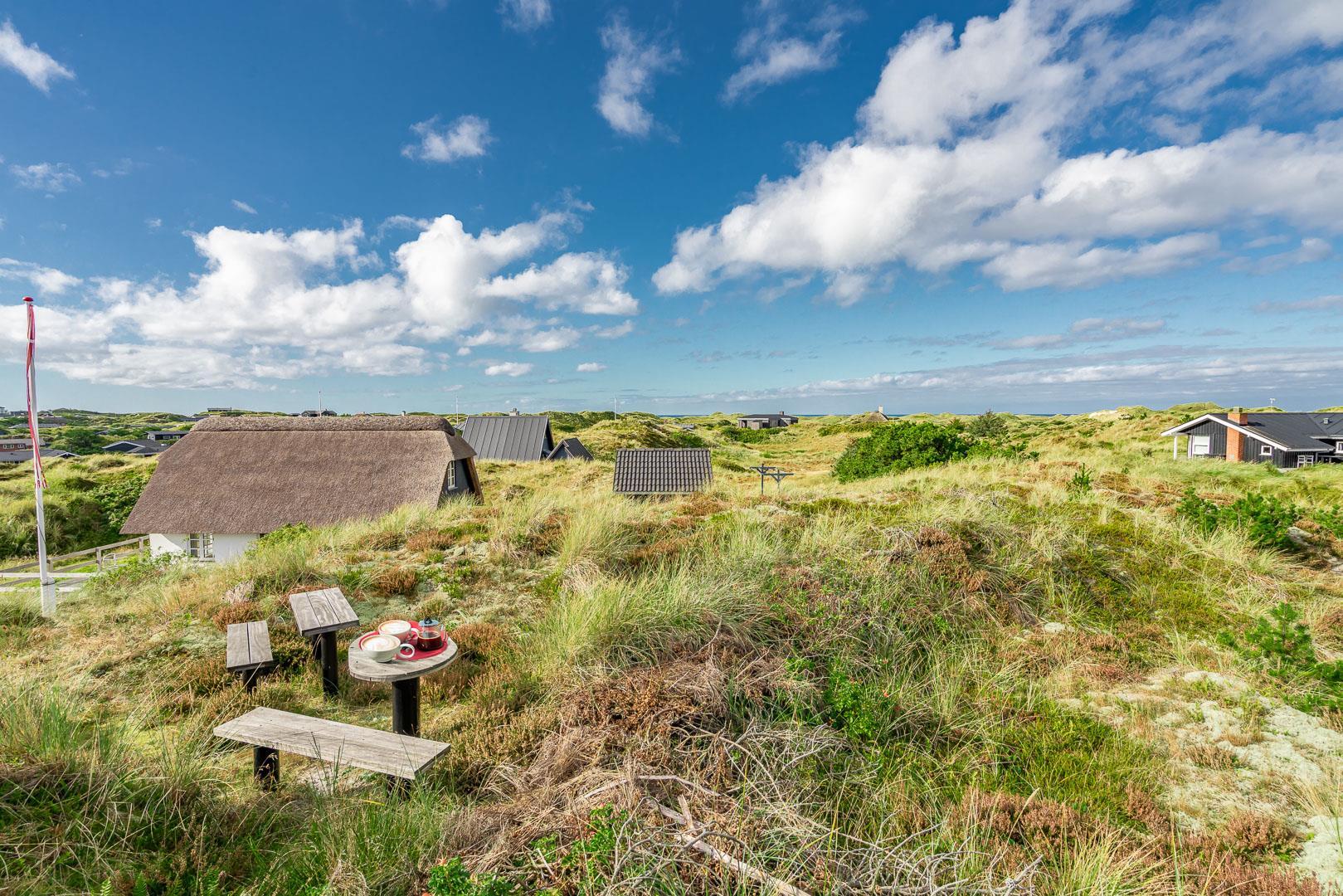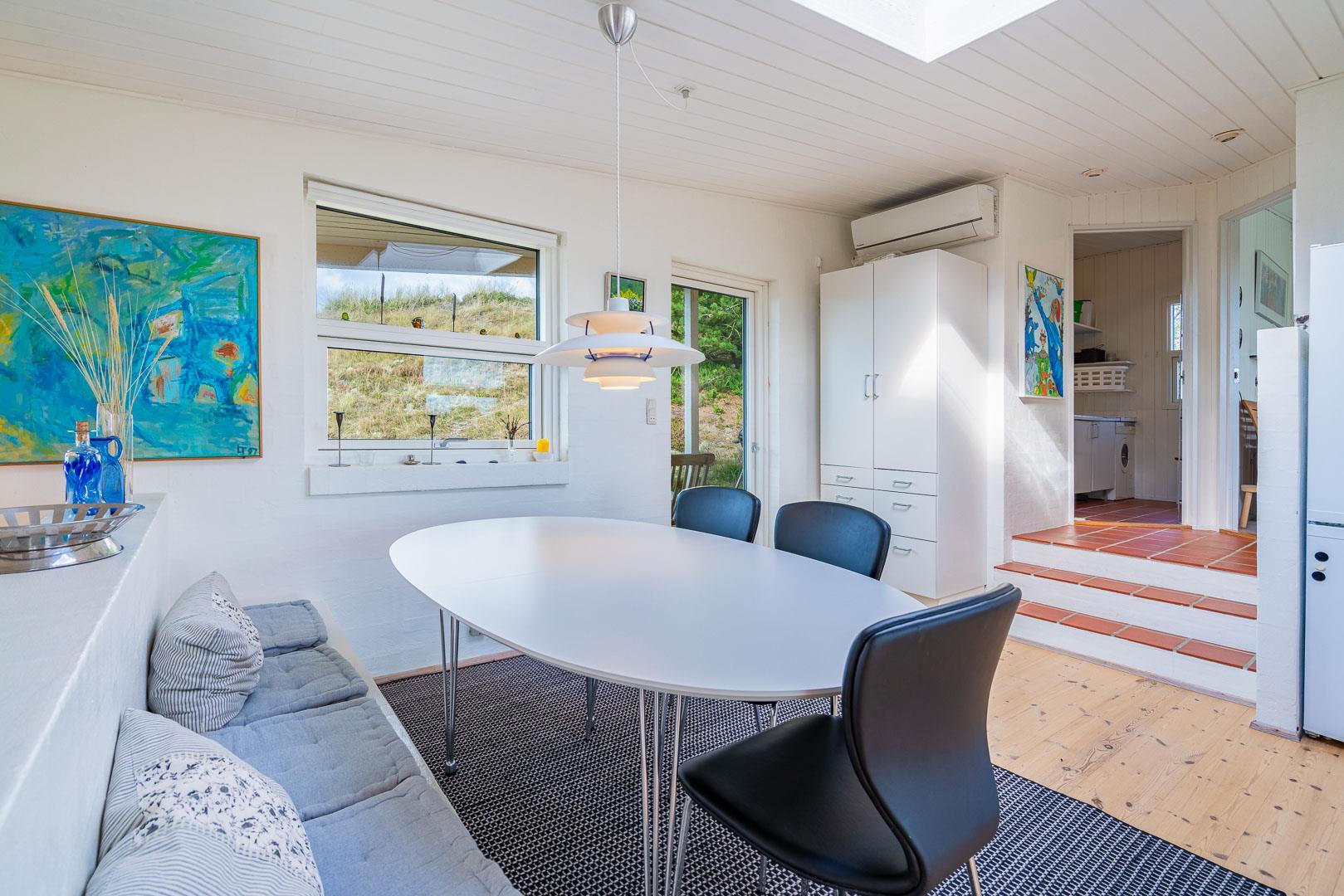 Naturskønt beliggende i hjertet af Henne Strand finder du dette indbydende sommerhus til 6 personer, kun 700 meter fra den smukke Vesterhavskyst. Sommerhuset er stilfuldt indrettet med friske farver og en hyggelig atmosfære. De forskellige niveauer i sommerhuset skaber en spændende og charmerende dynamik – blandt andet med tre trin, der leder dig fra det fine køkken og spisestue ned til en hyggelig stue. Her kan du nyde varmen fra brændeovnen, læse en god bog eller blot slappe af med udsigten til den omkringliggende natur. Fra stuen er der direkte udgang til en af de dejlige terrasser, der indbyder til afslapning i solens stråler.