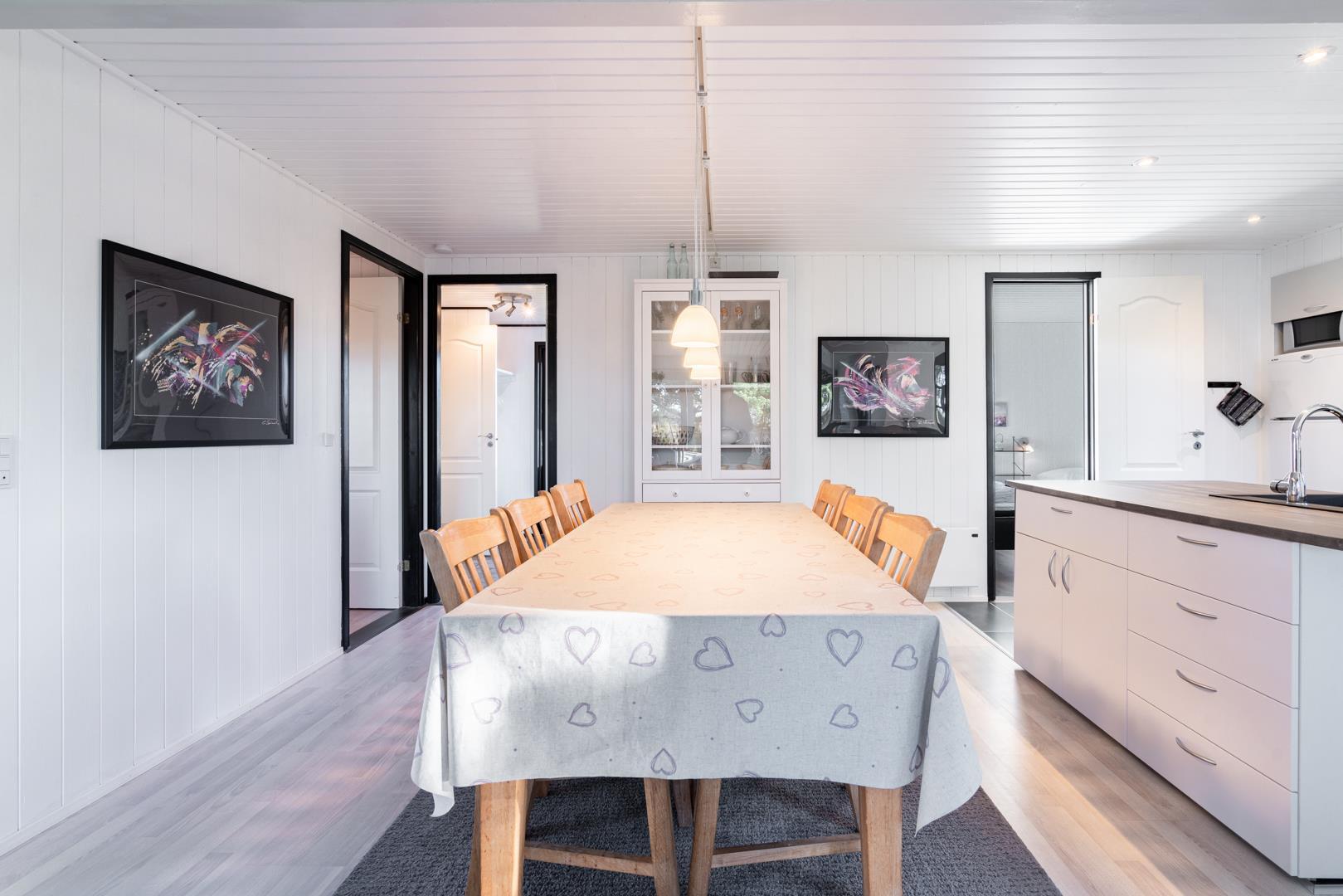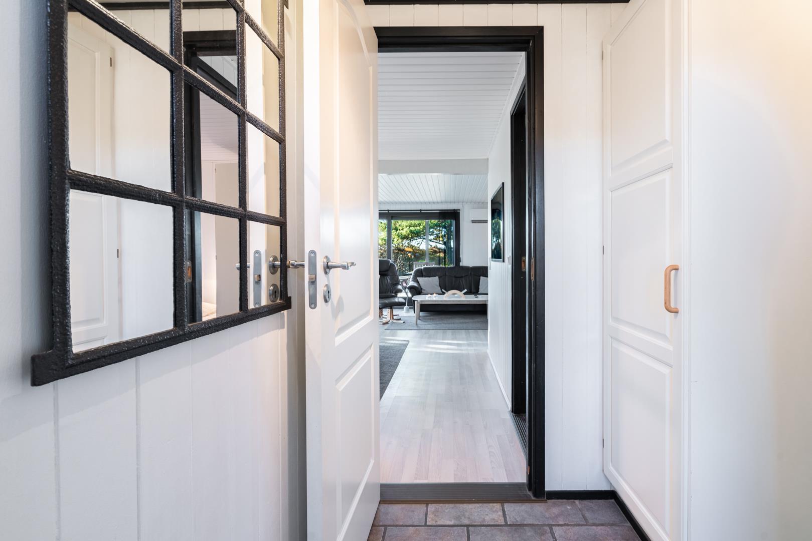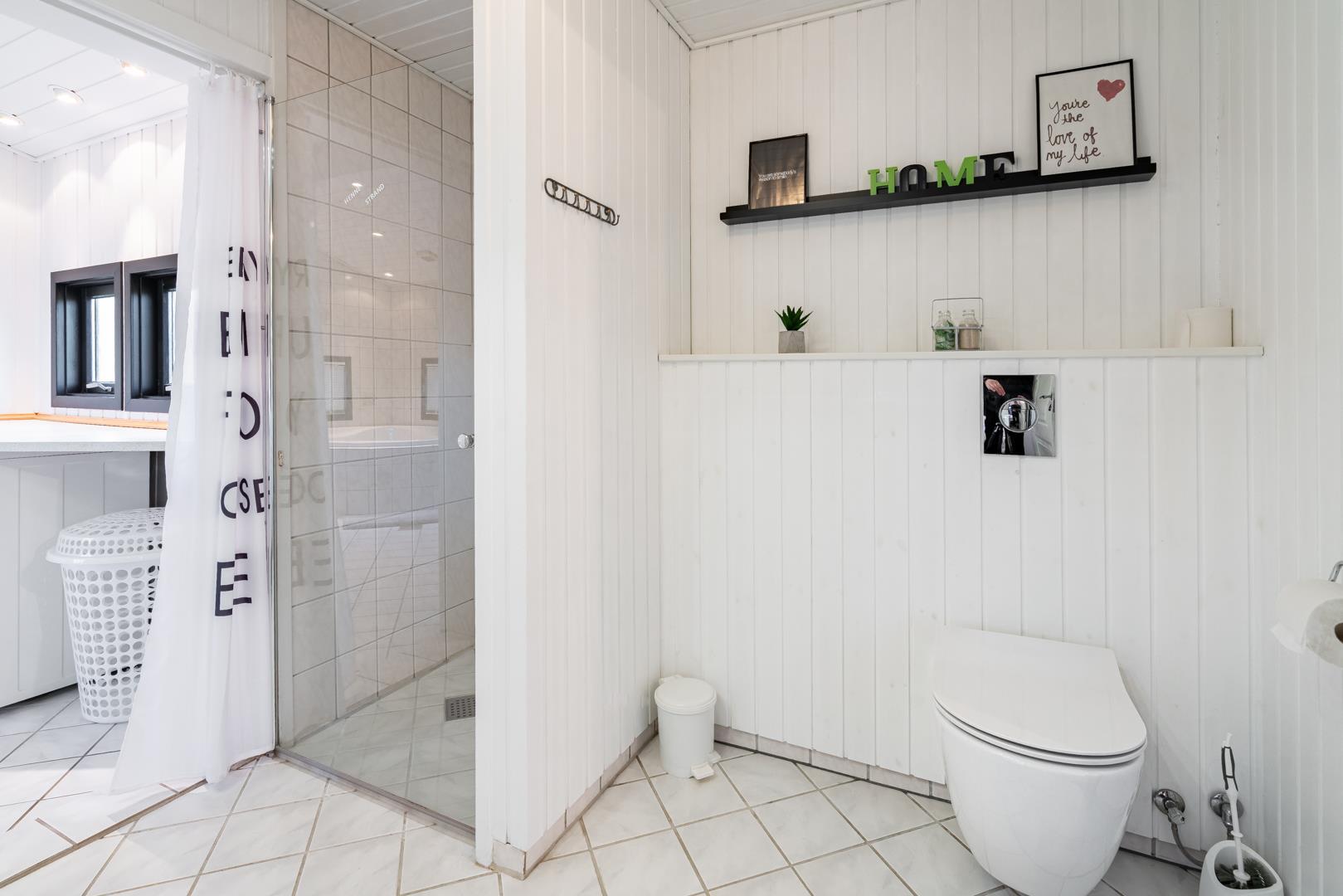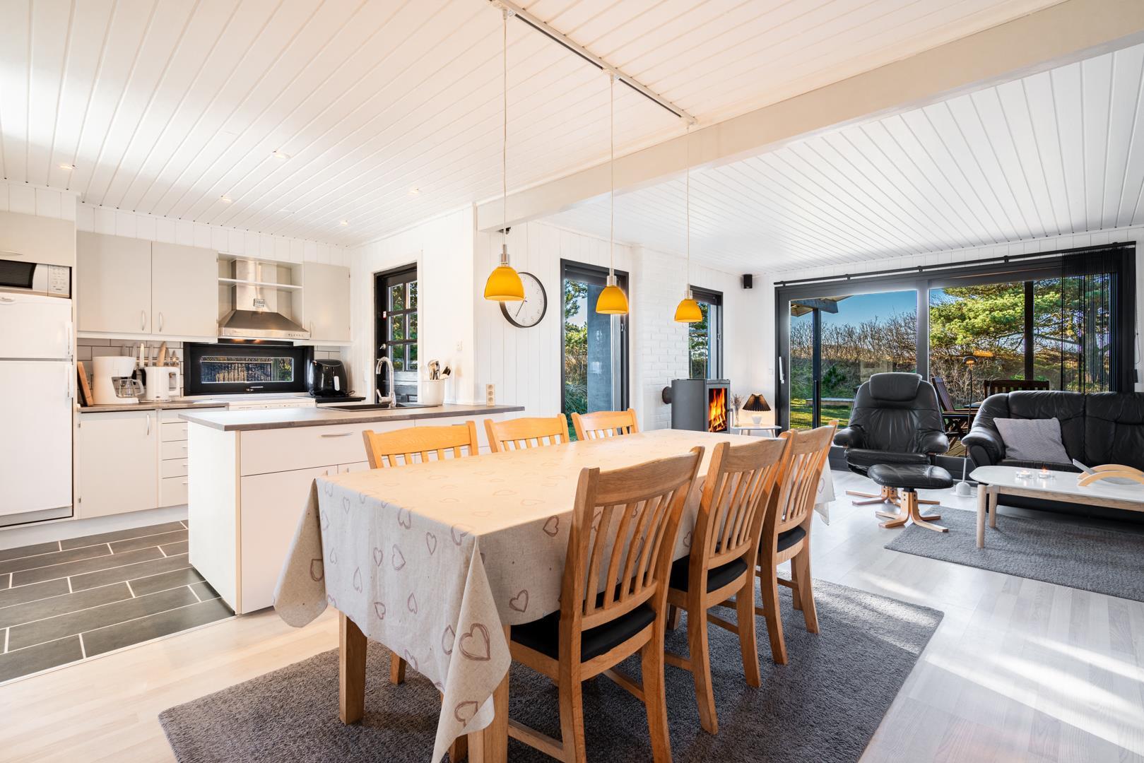 Dejligt feriehus beliggende på en afskærmet børnevenlig naturgrund med plads til boldspil. Huset er løbende blevet moderniseret, så det overalt fremstår lyst og venligt. Gode ugenerte terrasser i træ og sten hele vejen rundt om huset, som giver mulighed for at nyde solen hele dagen. Hyggelig stue med brændeovn, samt udgang til delvis overdækket træterrasse. Fra det store soveværelse er der direkte adgang til stort badeværelse med bruseniche og toilet, samt separat wellness afdeling med , sauna, spa og puslebord. Gratis internet.