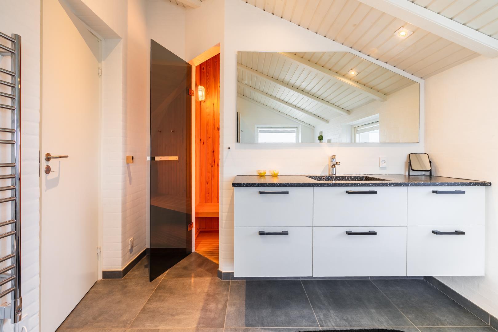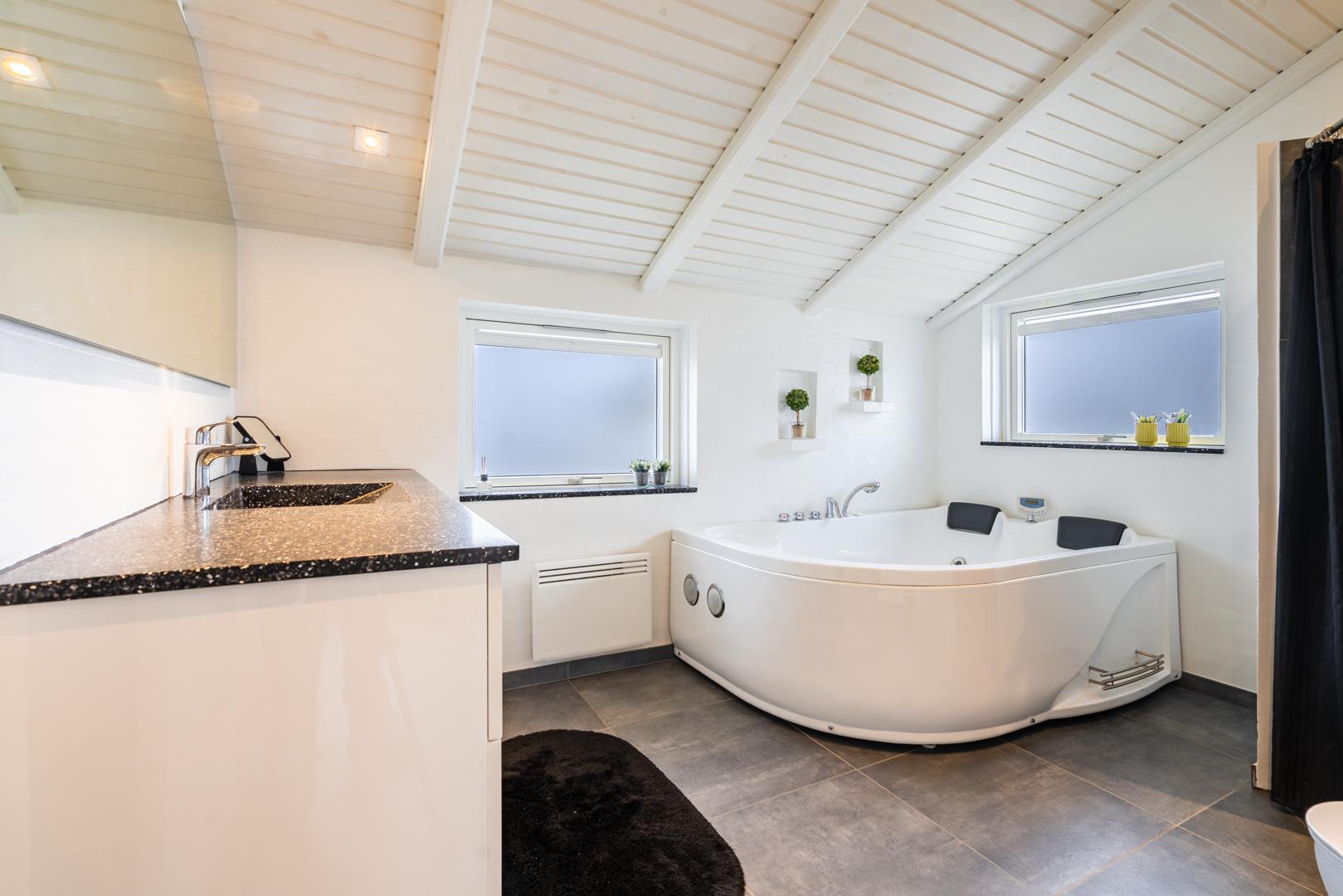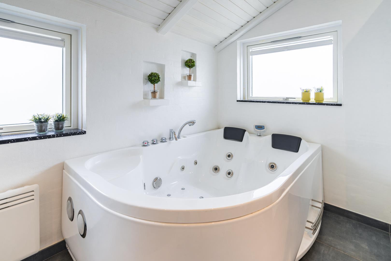 Huset rummer herudover to badeværelser med regnvandsbrusere, og det ene af disse badeværelser har desuden spa og sauna. Endelig er der tre soverum to med dobbeltsenge og et med enkeltsenge.