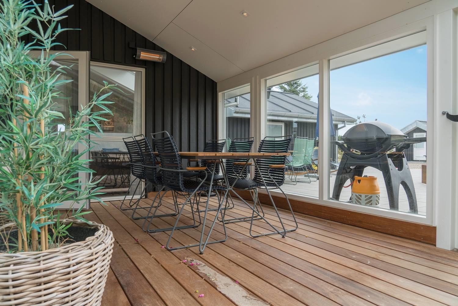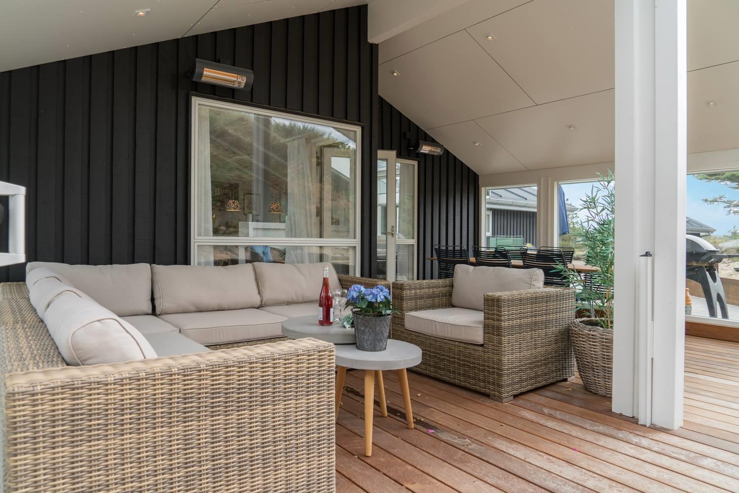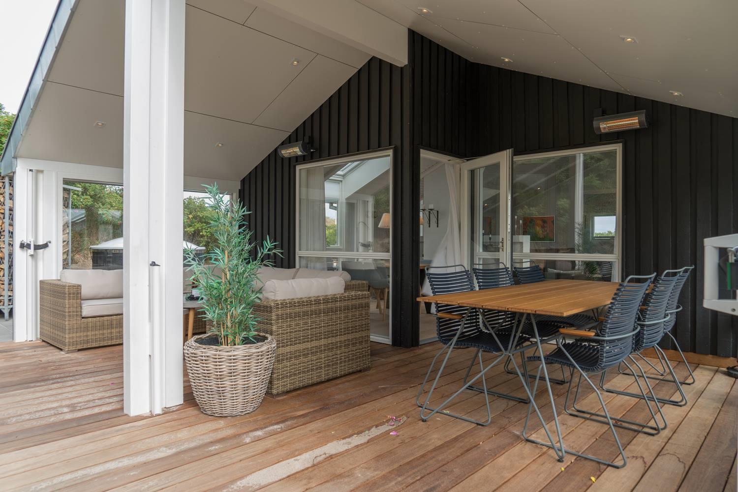Det store terrassemiljø smyger sig rundt langs de tre solrige verdenshjørner, og huset er udstyret med både loungemøbler, spisemøbler og liggestole samt et overdækket areal med terrassevarmere, hvilket forlænger sommersæsonen betragteligt. Nyd en skøn middag direkte fra grillen.
