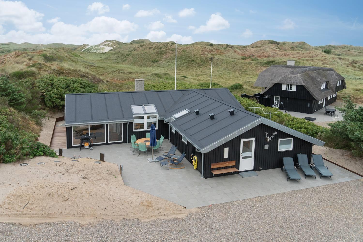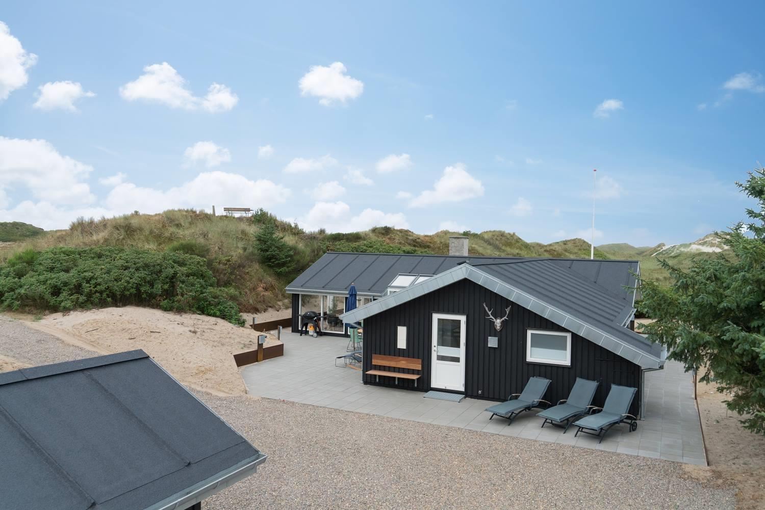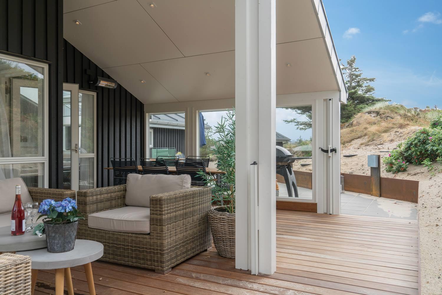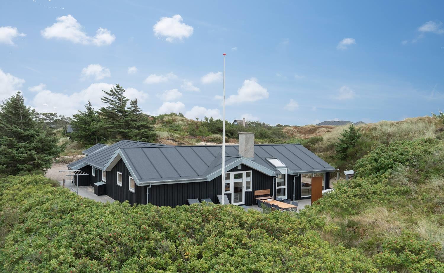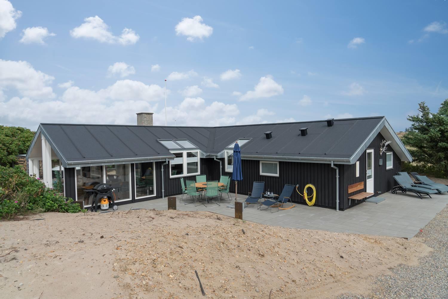 På en skala fra 1 til 10 får dette sommerhus 11. Huset er lækkert fra inderst til yderst, og så byder det på skønne faciliteter som sauna og spabad og ikke mindst et stort, pragtfuldt terrassemiljø. Sommerhuset ligger naturskønt og ganske ugeneret på en klitgrund i det nordlige Henne Strand.