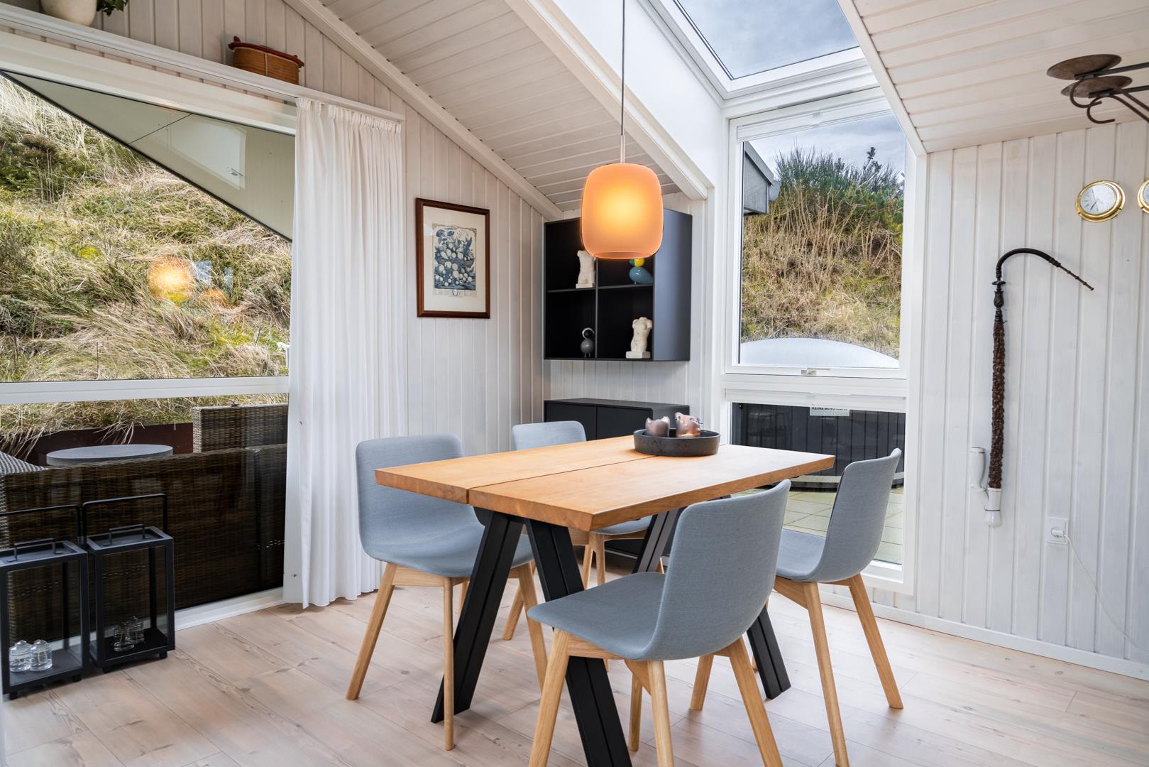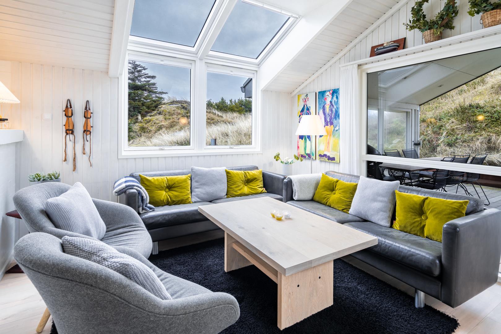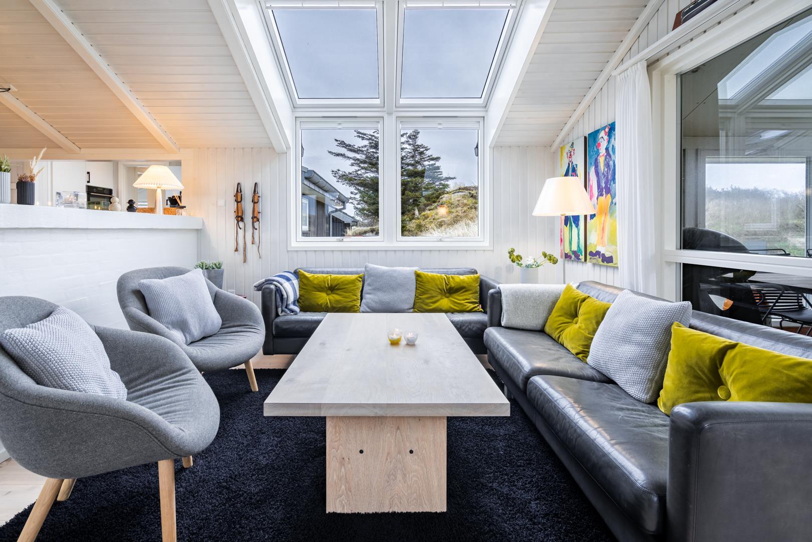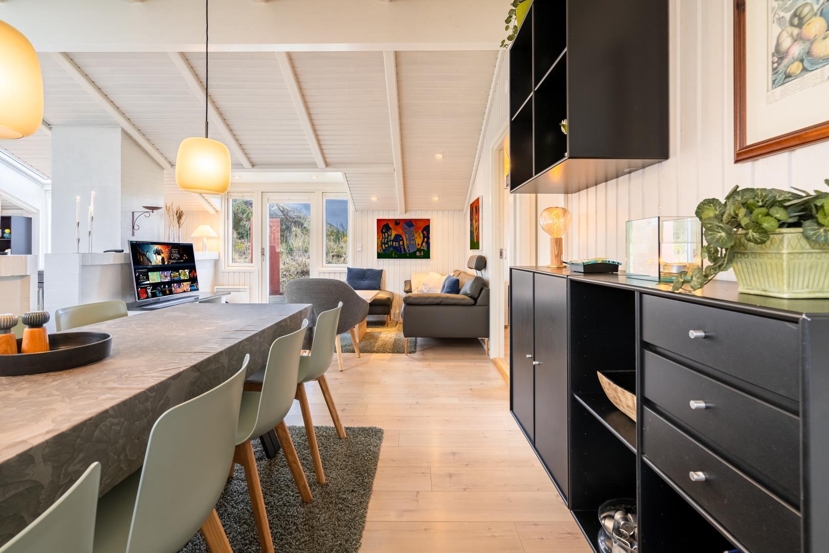 Sommerhuset er af høj kvalitet med lofter til kip, og ovenlysvinduer, der lader et flot lys strømme ind i de i forvejen lyse og åbne rum. Særligt det store opholdsrum byder på en enormt lys og indbydende atmosfære med inventar og møblement i afdæmpede nuancer og farverig kunst på væggene, som sætter et personligt præg.