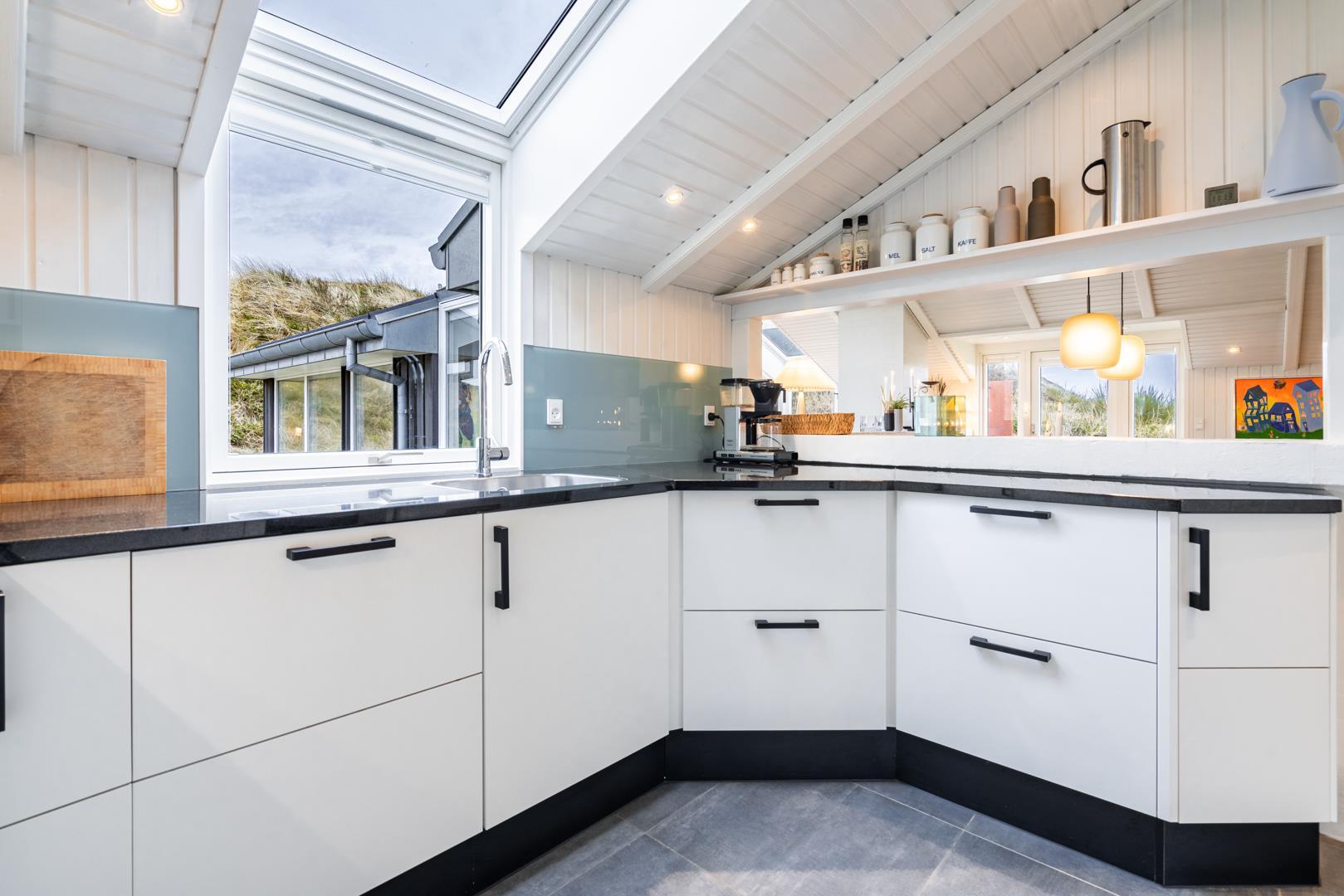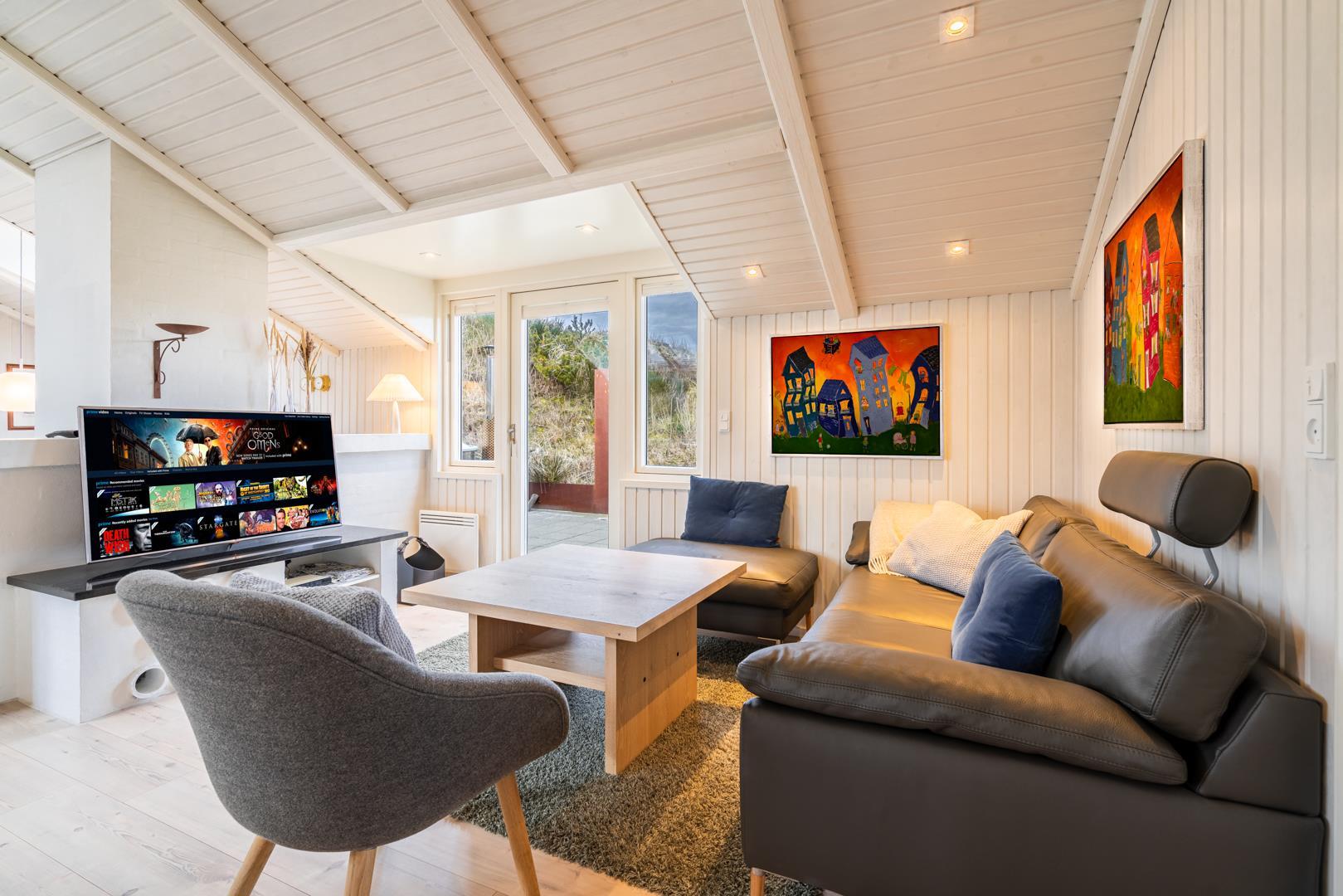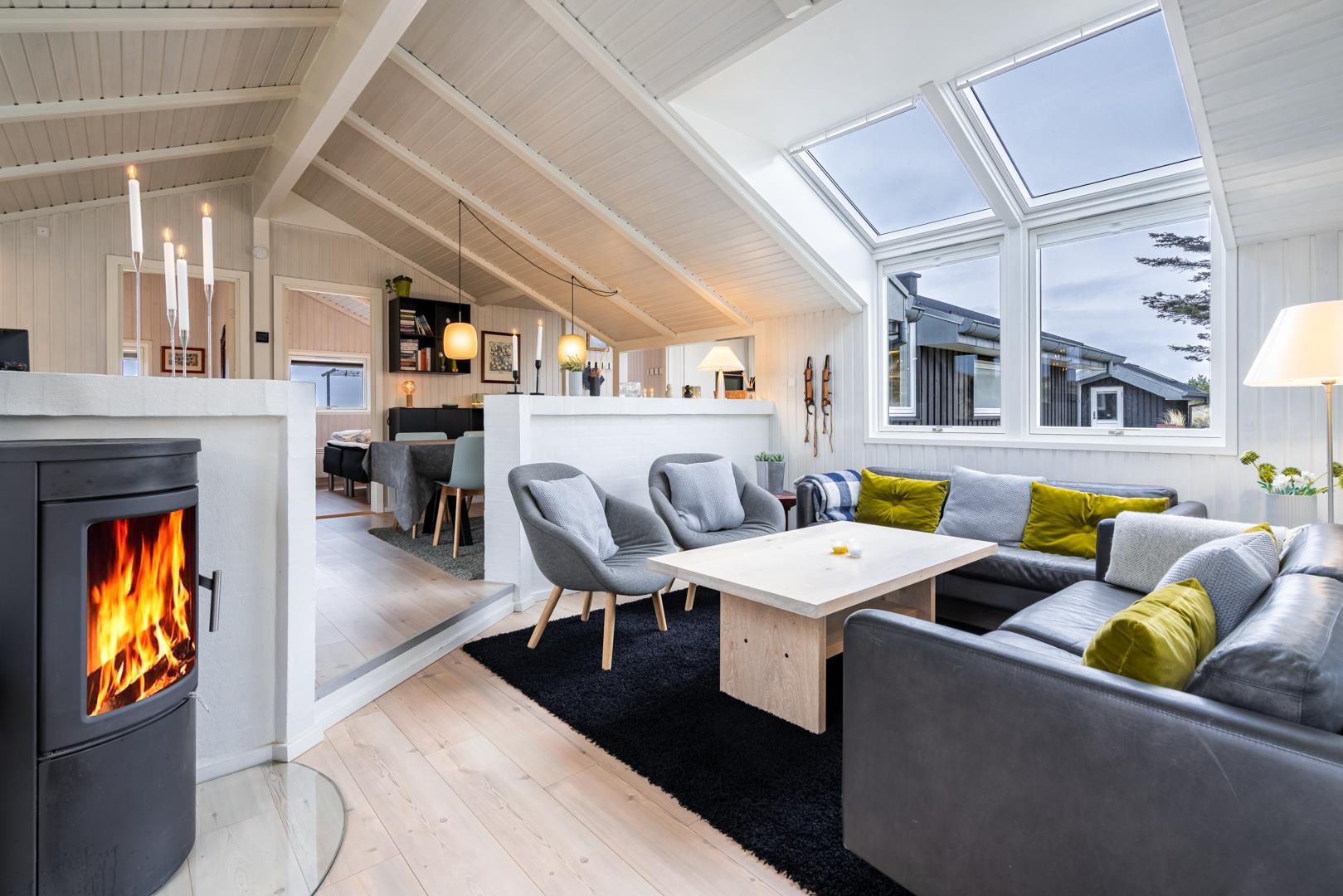 Sommerhuset er af høj kvalitet med lofter til kip, og ovenlysvinduer, der lader et flot lys strømme ind i de i forvejen lyse og åbne rum. Særligt det store opholdsrum byder på en enormt lys og indbydende atmosfære med inventar og møblement i afdæmpede nuancer og farverig kunst på væggene, som sætter et personligt præg.