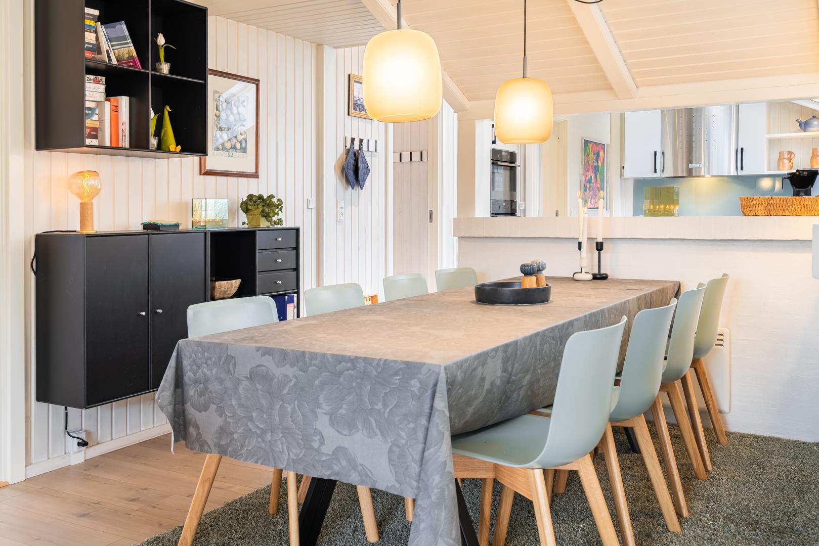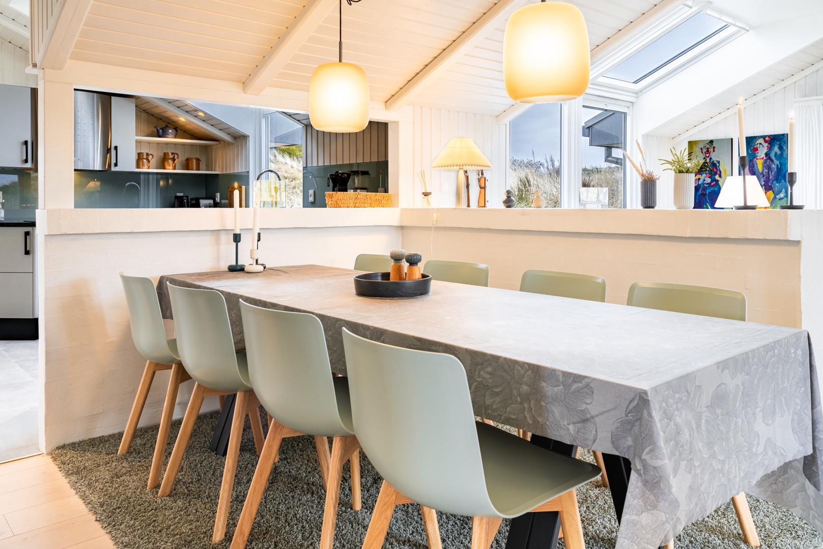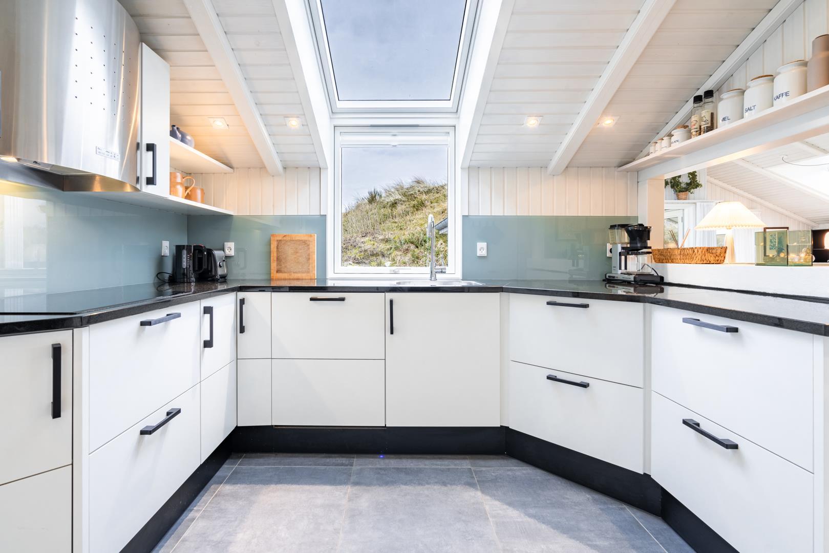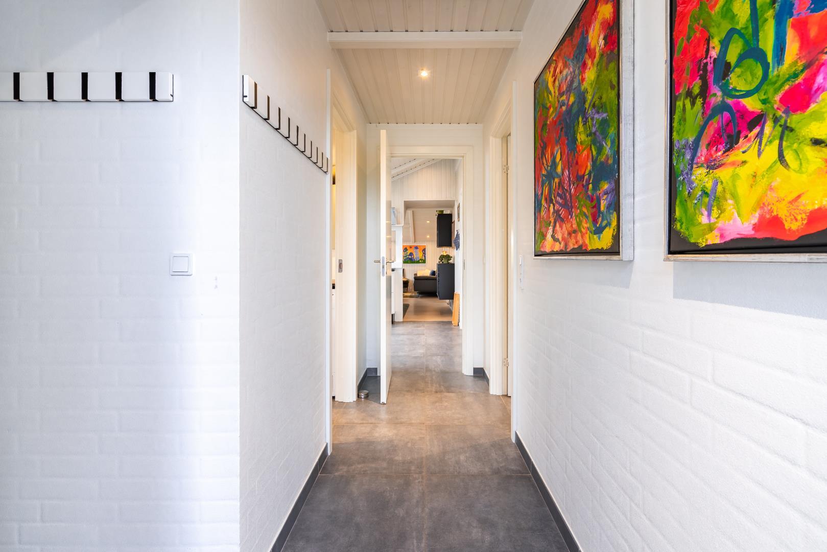 Sommerhuset er af høj kvalitet med lofter til kip, og ovenlysvinduer, der lader et flot lys strømme ind i de i forvejen lyse og åbne rum. Særligt det store opholdsrum byder på en enormt lys og indbydende atmosfære med inventar og møblement i afdæmpede nuancer og farverig kunst på væggene, som sætter et personligt præg.