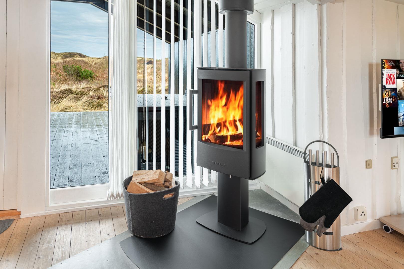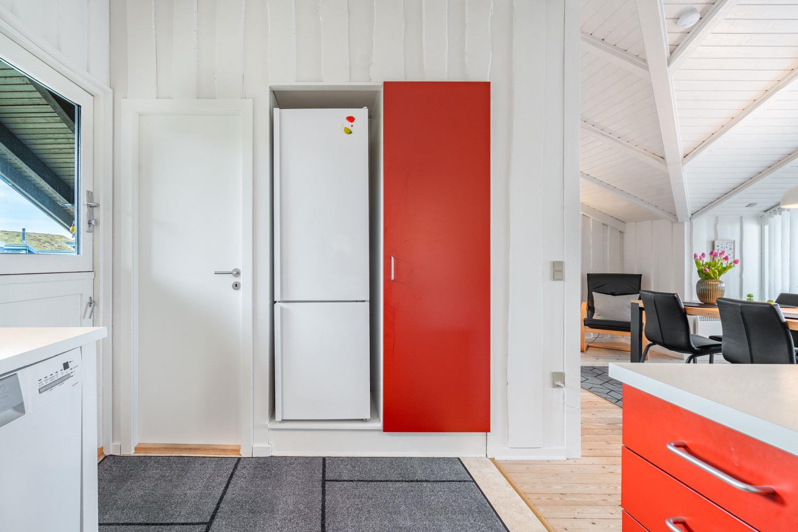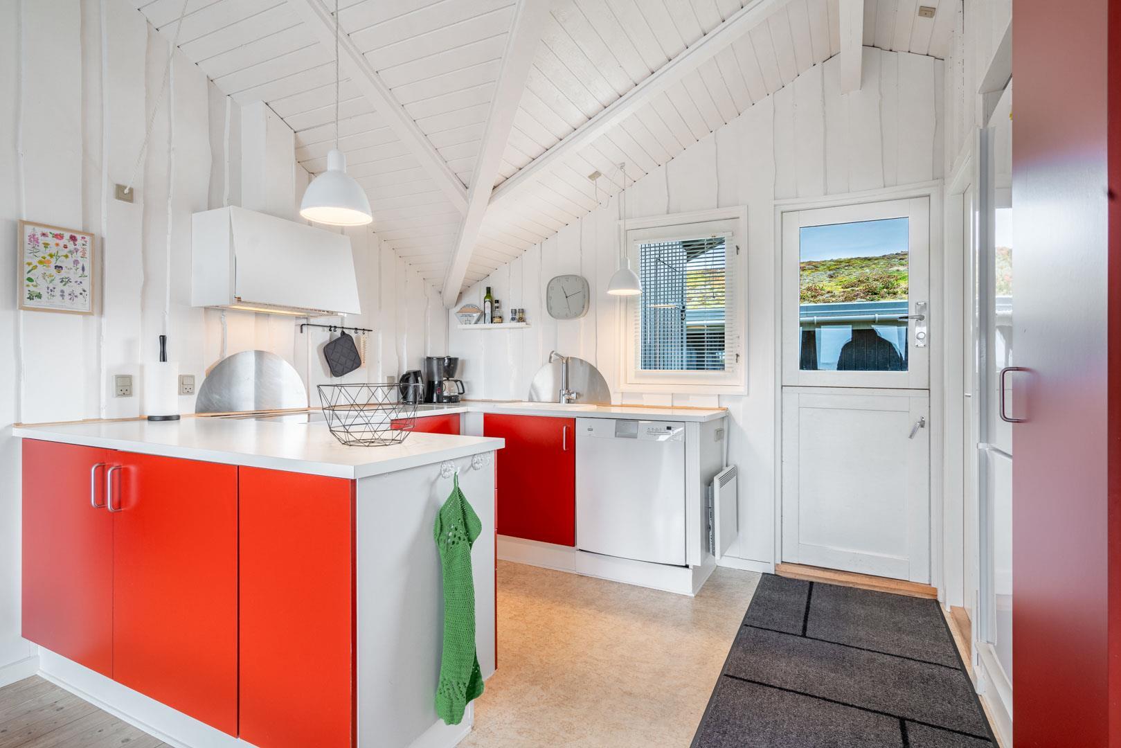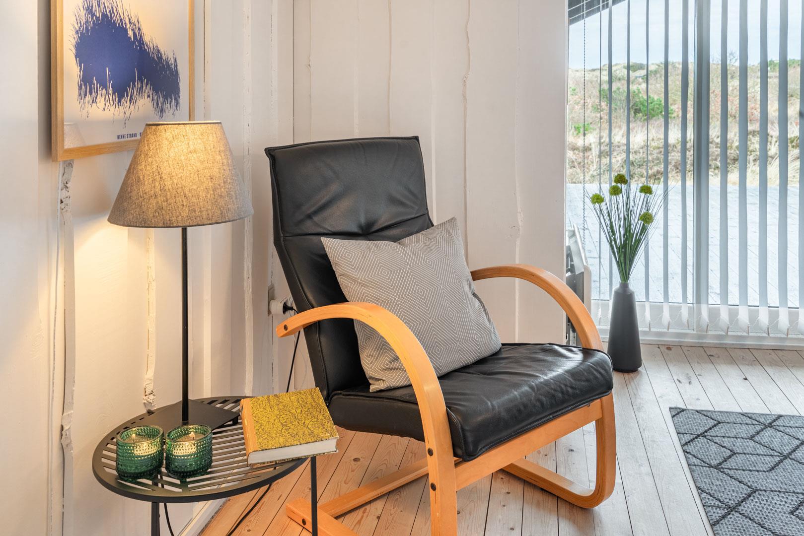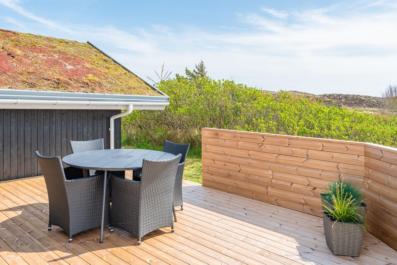 Udendørs venter en delvist overdækket træterrasse, der byder på en fortryllende udsigt over klitterne og den omkringliggende natur, perfekt til at nyde solnedgangen eller en kop morgenkaffe. På grunden finder du også en praktisk garage, der giver mulighed for sikker parkering og opbevaring af cykler, så du kan udforske området og nyde skønne cykelture i det naturskønne landskab omkring sommerhuset.