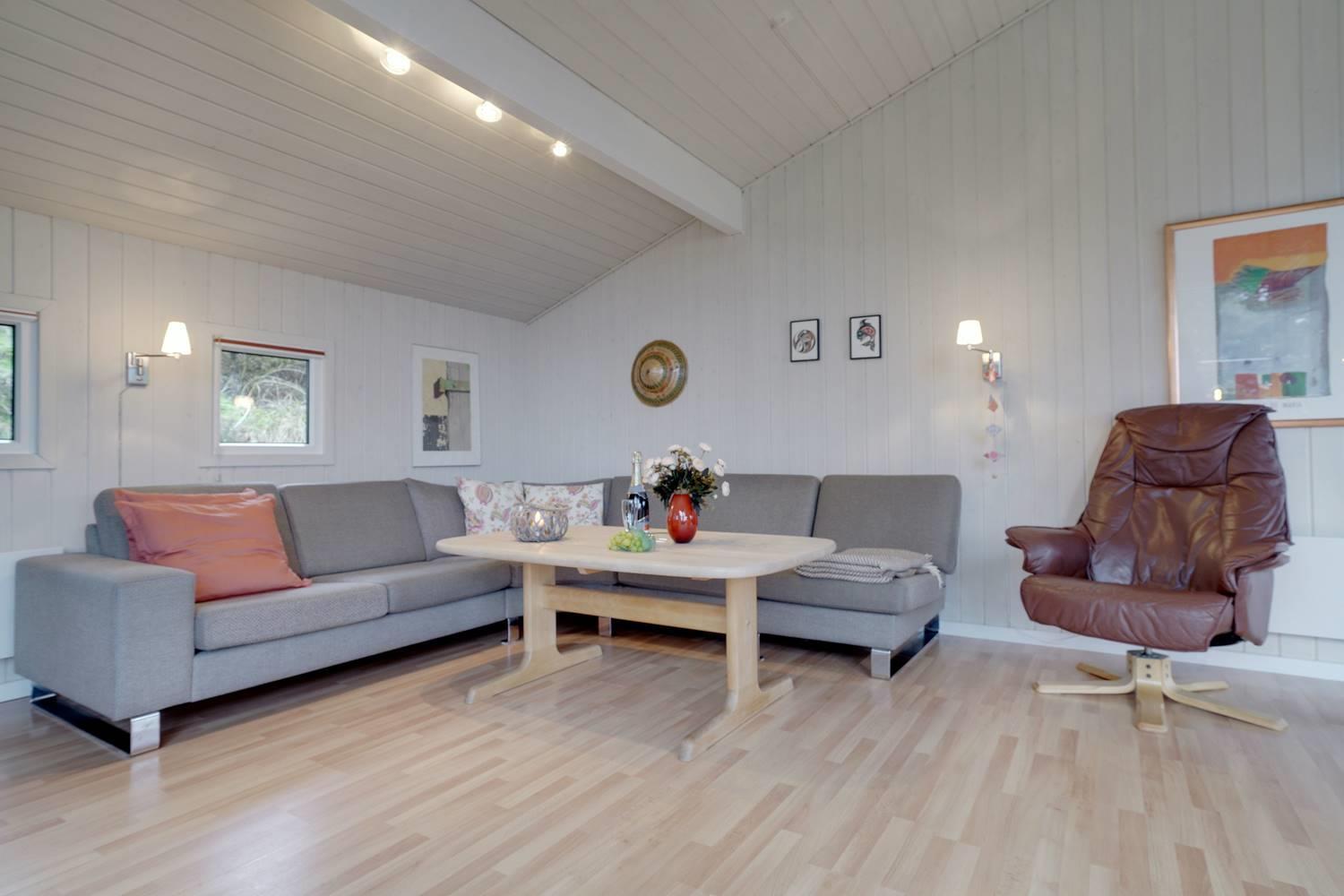 På en pragtfuld syd skråning helt ugeneret og for enden af en lukket vej ligger dette skønne feriehus. Indvendigt står huset meget velholdt, lyst og med gode og pæne møbler Fra terrassen er der en flot udsigt over området. Flot kombineret køkken-spiseafdeling. Fra spiseafdelingen er der udgang til ugeneret terrasse.