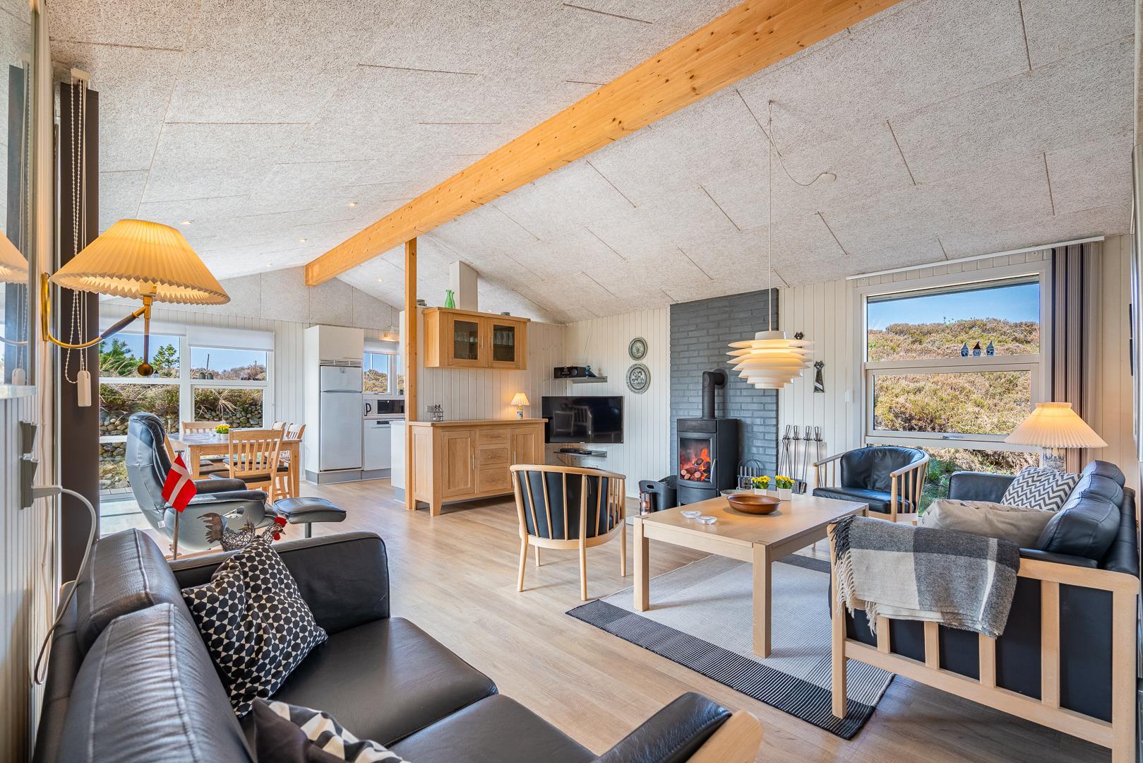 Dette skønne feriehus på Arvevej 14 er lyst og venligt og højt til loftet. Der er nyere lækkert køkken i forbindelse med den hyggelig og nyrenoverede stue med brændeovn. 2 dejlige badeværelser med gulvvarme og 3 gode soverum. Her er også tænkt på de små gæster - så her er gynge og sandkasse på grunden.