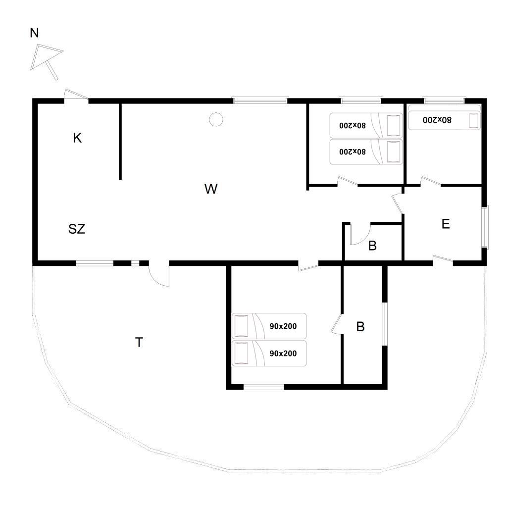 Sengestørrelse: 1 dobbeltseng med 2 madrasser 90 x 200 cm + 1 dobbeltseng med 2 madrasser 80 x 200 cm + 1 køjeseng 80 x 200 cm.